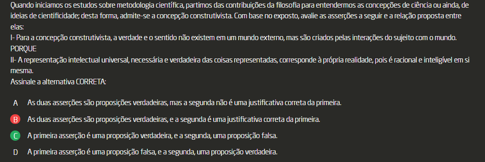 <p>Quando iniciamos os estudos sobre metodologia científica, partimos das contribuições da filosofia para entendermos as concepções de ciência ou ainda, de ideias de cientificidade; desta forma, admite-se a concepção construtivista. Com base no exposto, avalie as asserções a seguir e a relação proposta entre elas: Para a concepção construtivista, a verdade e sentido não existem em um mundo externo, mas são criados pelas interações do sujeito com mundo. PORQUE II- A representação intelectual universal, necessária e verdadeira das coisas representadas, corresponde à própria realidade, pois é racional e inteligível em si mesma. Assinale a alternativa CORRETA: A As duas asserções são proposições verdadeiras, mas a segunda não é uma justificativa correta da primeira. B As duas asserções são proposições verdadeiras, e a segunda é uma justificativa correta da A primeira asserção é uma proposição verdadeira, e a segunda, uma proposição falsa. D A primeira asserção é uma proposição falsa, e a segunda, uma proposição verdadeira.</p>