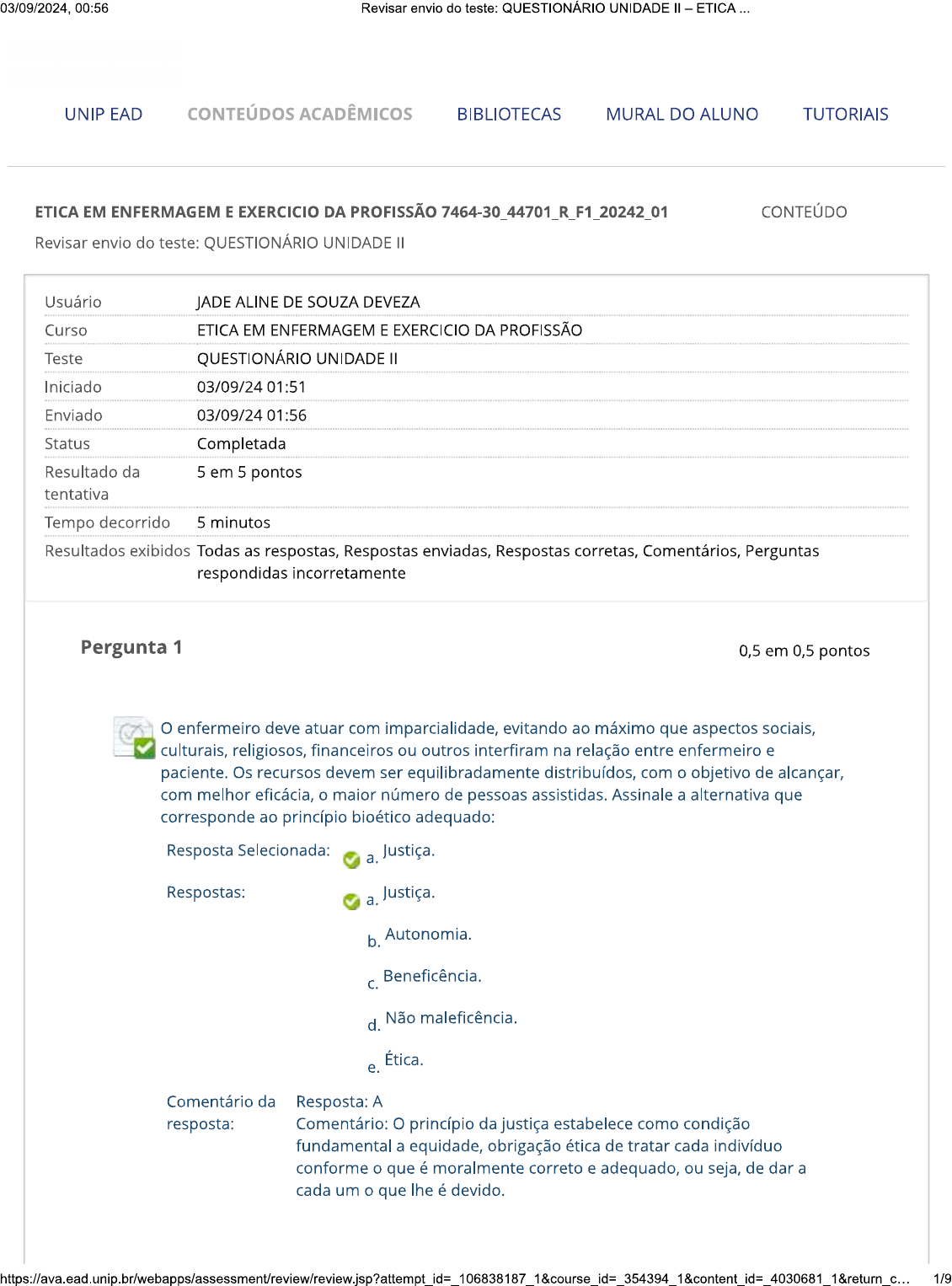 <p>03/09/2024, 00:56 Revisar envio do teste: QUESTIONÁRIO UNIDADE - ETICA UNIP EAD CONTEÚDOS ACADÊMICOS BIBLIOTECAS MURAL DO ALUNO TUTORIAIS ETICA EM ENFERMAGEM E EXERCICIO DA PROFISSÃO 7464-30_44701_R_F1_20242_01 CONTEÚDO Revisar envio do teste: QUESTIONÁRIO UNIDADE II Usuário Curso ETICA EM ENFERMAGEM E EXERCICIO DA PROFISSÃO Teste QUESTIONÁRIO UNIDADE Iniciado 03/09/24 01:51 Enviado 03/09/24 01:56 Status Completada Resultado da 5 em 5 pontos tentativa Tempo decorrido 5 minutos Resultados exibidos Todas as respostas, Respostas enviadas, Respostas corretas, Comentários, Perguntas respondidas incorretamente Pergunta 1 0,5 em 0,5 pontos enfermeiro deve atuar com imparcialidade, evitando ao máximo que aspectos sociais, culturais, religiosos, financeiros ou outros interfiram na relação entre enfermeiro e paciente. Os recursos devem ser equilibradamente distribuídos, com o objetivo de alcançar, com melhor eficácia, o maior número de pessoas assistidas. Assinale a alternativa que corresponde ao princípio bioético adequado: Resposta Selecionada: a. Justiça. Respostas: a. Justiça. b. Autonomia. C. Beneficência. Não maleficência. d. Ética. e. Comentário da Resposta: A resposta: Comentário: O princípio da justiça estabelece como condição fundamental a equidade, obrigação ética de tratar cada indivíduo conforme o que é moralmente correto e adequado, ou seja, de dar a cada um o que lhe é devido.</p><p>03/09/2024, 00:56 Revisar envio do teste: QUESTIONÁRIO UNIDADE ETICA Pergunta 2 0,5 em 0,5 pontos A palavra autonomia origina-se dos termos gregos autós, que significa próprio, e nómos, que quer dizer regra, autoridade. Pode-se dizer, então, que o princípio da autonomia é a capacidade de uma pessoa de decidir fazer ou buscar aquilo que ela julga ser o melhor para si mesma. Entendendo o conceito, podemos dizer que, aplicado à saúde de forma prática, a autonomia pode ser definida como: Resposta C. Selecionada: A capacidade de agir intencionalmente, por vontade própria, o que pressupõe compreensão, razão e deliberação para decidir coerentemente entre as alternativas que lhe são apresentadas e, portanto, para exigência do consentimento informado; liberdade, no sentido de estar livre de qualquer influência controladora para esta tomada de posição. Respostas: a. O princípio da autonomia não nos diz como distribuir o bem e o mal. Só nos manda promover o primeiro e evitar o segundo. b. O princípio da autonomia versa sobre a obrigação de não causar danos aos outros. Os danos devem ser entendidos não somente como físicos, como a dor, as lesões, a morte, mas também como aspecto ético, moral e psicológico. C. A capacidade de agir intencionalmente, por vontade própria, o que pressupõe compreensão, razão e deliberação para decidir coerentemente entre as alternativas que lhe são apresentadas e, portanto, para exigência do consentimento informado; liberdade, no sentido de estar livre de qualquer influência controladora para esta tomada de posição. d. princípio da autonomia requer que todos os pacientes sejam tratados com igual consideração, independentemente de sua situação cultural ou socioeconômica. e. O princípio da autonomia é o que estabelece que devemos fazer o bem aos outros, independentemente de desejá-lo ou não. Comentário da Resposta: C resposta: Comentário: Apenas a letra C descreve corretamente o princípio prático da autonomia. Pergunta 3 0,5 em 0,5 pontos 2/9</p><p>03/09/2024, 00:56 Revisar envio do teste: QUESTIONÁRIO UNIDADE aborto é dos temas bioéticos mais persistentes e que podem causar embaraços na tomada de decisão. Diante de tal situação, o profissional de saúde pode se envolver em um dilema ético. Assim, assinale a alternativa que define dilema Resposta b. Selecionada: Um dilema ético pode ser definido como uma situação que envolve um conflito entre duas escolhas morais. Respostas: a. Um dilema ético pode ser definido como uma situação que envolve uma união entre duas escolhas morais. b. Um dilema ético pode ser definido como uma situação que envolve um conflito entre duas escolhas morais. C. Um dilema ético pode ser definido como uma situação que envolve uma escolha injusta. d. Um dilema ético pode ser definido como uma situação que envolve uma decisão baseada em evidências. e. Um dilema ético pode ser definido como uma situação que envolve um conforto entre dois valores opostos. Comentário Resposta: B da resposta: Comentário: Diante de diversos dilemas éticos que estarão presentes no cotidiano do enfermeiro, é importante que ele tenha o conhecimento das diretrizes norteadoras da profissão, tanto científicas e técnicas como as éticas, além da legislação vigente. A tomada de decisão deve ser respaldada pela ética, e, se houver tempo, discutida entre a equipe multidisciplinar. Pergunta 4 0,5 em 0,5 pontos A atenção humanizada às mulheres em abortamento merece abordagem ética e reflexão sobre os aspectos jurídicos, tendo como princípios norteadores a igualdade, a liberdade e a dignidade da pessoa humana, não se admitindo qualquer discriminação ou restrição ao acesso à assistência à saúde. Embora as normativas éticas proíbam o profissional de enfermagem de realizar ou participar de abortos não previstos pela lei, o profissional de enfermagem deve: 3/9</p><p>03/09/2024, 00:56 Revisar envio do teste: QUESTIONÁRIO UNIDADE ETICA Resposta e. Selecionada: Assegurar às mulheres que praticaram o aborto o acesso à informação e orientação humana e solidária, ao abortamento previsto em lei, à atenção de qualidade em complicações derivadas de abortos e ao planejamento reprodutivo pós-aborto para, inclusive, evitar abortos repetidos. Respostas: a. Nos casos permitidos pela legislação, o profissional deverá decidir de acordo com a sua consciência sobre sua participação, desde que seja garantida a continuidade da assistência. b. Provoca