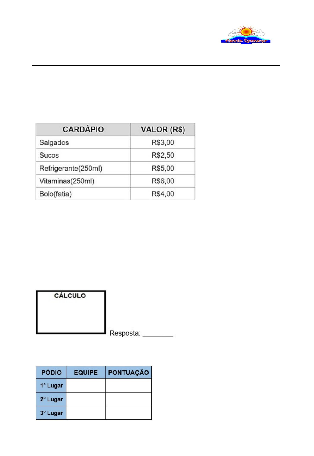 <p>ESCOLA RENASCER</p><p>SÃO LUÍS____ DE _______________DE _________________</p><p>ALUNO:___________________________________________</p><p>PROFESSORA :SILVERIA MARIA</p><p>TUMA:____________</p><p>AVALIÇÃO DE MATEMÁTICA 3ª BIMESTRE</p><p>1. Observe a tabela dos preços da lanchonete de Abner e responda às questões 1 e 2.</p><p>Se um cliente comprar 3 salgados, 2 sucos, 1 refrigerante, quanto ele deve pagar?</p><p>a) R$ 6,00</p><p>b) R$ 10,50</p><p>c) R$ 16,50</p><p>d) R$ 19,00</p><p>2. Jairo foi nessa lanchonete e comprou 1 salgado e 1 suco. Quantos reais ele gastou nessa compra?</p><p>3. Veja os dados da pontuação de 4 equipes em uma gincana, depois, organize na tabela abaixo apenas as 3 equipes com maior pontuação.</p><p>Equipe A: 33 pontos.</p><p>Equipe B :25 pontos.</p><p>Equipe C: 42 pontos.</p><p>Equipe D: 29 pontos.</p><p>4. A tabela abaixo mostra as pizzas vendidas nesse domingo na pizzaria de Gabriel. Observe essa tabela e responda às questões 4 e 5.</p><p>Quantas pizzas foram vendidas nesse dia?</p><p>5. Uma prefeitura enviou alguns materiais para a escola de Jéssica. Observe na tabela abaixo.</p><p>a) Qual material essa escola recebeu em maior quantidade?</p><p>____________________________________</p><p>b) Quantos materiais a prefeitura enviou ao todo?</p><p>BOA SORTE!</p><p>GABARITO</p><p>1D /</p><p>2. R$5,50.</p><p>3. 1° Lugar: Equipe C, 2° Lugar: Equipe A, 3° Lugar: Equipe D.</p><p>/ 4. 40 pizzas. /</p><p>5. a)</p><p>image2.jpg</p><p>image3.jpg</p><p>image4.jpg</p><p>image5.jpg</p><p>image6.jpg</p><p>image1.jpeg</p>