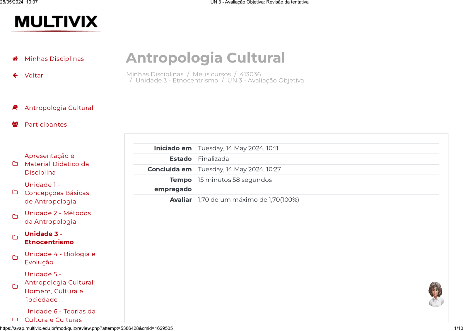 <p>Minhas Disciplinas / Meus cursos / 413036</p><p>/ Unidade 3 - Etnocentrismo / UN 3 - Avaliação Objetiva</p><p>Antropologia Cultural</p><p>Iniciado em Tuesday, 14 May 2024, 10:11</p><p>Estado Finalizada</p><p>Concluída em Tuesday, 14 May 2024, 10:27</p><p>Tempo</p><p>empregado</p><p>15 minutos 58 segundos</p><p>Avaliar 1,70 de um máximo de 1,70(100%)</p><p> Minhas Disciplinas</p><p> Voltar</p><p> Antropologia Cultural</p><p> Participantes</p><p></p><p>Apresentação e</p><p>Material Didático da</p><p>Disciplina</p><p></p><p>Unidade 1 -</p><p>Concepções Básicas</p><p>de Antropologia</p><p></p><p>Unidade 2 - Métodos</p><p>da Antropologia</p><p></p><p>Unidade 3 -</p><p>Etnocentrismo</p><p></p><p>Unidade 4 - Biologia e</p><p>Evolução</p><p></p><p>Unidade 5 -</p><p>Antropologia Cultural:</p><p>Homem, Cultura e</p><p>Sociedade</p><p></p><p>Unidade 6 - Teorias da</p><p>Cultura e Culturas</p><p>25/05/2024, 10:07 UN 3 - Avaliação Objetiva: Revisão da tentativa</p><p>https://avap.multivix.edu.br/mod/quiz/review.php?attempt=5386428&cmid=1629505 1/10</p><p>https://avap.multivix.edu.br/my/</p><p>https://avap.multivix.edu.br/course/view.php?id=26101</p><p>https://avap.multivix.edu.br/course/view.php?id=26101§ion=4</p><p>https://avap.multivix.edu.br/mod/quiz/view.php?id=1629505</p><p>https://avap.multivix.edu.br/my/</p><p>https://avap.multivix.edu.br/course/view.php?id=26101</p><p>https://avap.multivix.edu.br/user/index.php?id=26101</p><p>https://avap.multivix.edu.br/course/view.php?id=26101§ion=1</p><p>https://avap.multivix.edu.br/course/view.php?id=26101§ion=2</p><p>https://avap.multivix.edu.br/course/view.php?id=26101§ion=3</p><p>https://avap.multivix.edu.br/course/view.php?id=26101§ion=4</p><p>https://avap.multivix.edu.br/course/view.php?id=26101§ion=5</p><p>https://avap.multivix.edu.br/course/view.php?id=26101§ion=6</p><p>https://avap.multivix.edu.br/course/view.php?id=26101§ion=7</p><p>https://avap.multivix.edu.br/</p><p>https://avap.multivix.edu.br/</p><p>https://avap.multivix.edu.br/</p><p>https://avap.multivix.edu.br/</p><p>https://avap.multivix.edu.br/</p><p>https://avap.multivix.edu.br/</p><p>https://avap.multivix.edu.br/</p><p>https://avap.multivix.edu.br/</p><p>https://avap.multivix.edu.br/</p><p>https://avap.multivix.edu.br/</p><p>https://avap.multivix.edu.br/</p><p>Questão 1</p><p>Correto</p><p>Atingiu 0,34</p><p>de 0,34</p><p>Para o famoso antropólogo francês Claude Lévi-Strauss (1908-2009),</p><p>etnocentrismo seria a recusa em “admitir o próprio fato da diversidade</p><p>cultural”. Temos aí um tema que nunca saiu da pauta acadêmica e, hoje,</p><p>está inconscientemente presente nas discussões jornalísticas. Assim,</p><p>etnocentrismo seria a tendência do pensamento, especialmente ocidental,</p><p>de considerar as categorias, normas e valores da nossa própria sociedade, ou</p><p>cultura, como parâmetro passível de ser aplicado a todas as demais. Atitude</p><p>que, hoje reconhecemos, atribui juízo de valor meramente pessoal, ou</p><p>mesmo de determinadas “autoridades”, atrelando uma “metodologia</p><p>sociológica” para a diferença entre as culturas.</p><p>Revista de Antropologia – USP. Publicado por: OLIVEIRA, Roberto. 2012 –</p><p>Adaptada.</p><p>Os antropólogos estão ativamente engajados no estudo do fenômeno do</p><p>etnocentrismo, desde que começaram a estudar e a viver entre os povos</p><p>tradicionais com culturas radicalmente diferentes, aprendendo, por meio da</p><p>experiência pessoal, que esses “outros” são tão humanos e tendo como</p><p>objetivo entender as culturas particulares e o conceito geral de cultura.</p><p>Sobre o etnocentrismo, assinale a alternativa INCORRETA:</p><p>Escolha uma opção:</p><p>a. O Multiculturalismo assegura o valor das culturas diferentes que</p><p>coexistem em um país e destaca a responsabilidade recíproca de</p><p>todos os cidadãos de aceitarem o direito do outro para expressar sua</p><p> Minhas Disciplinas</p><p> Voltar</p><p> Antropologia Cultural</p><p> Participantes</p><p></p><p>Apresentação e</p><p>Material Didático da</p><p>Disciplina</p><p></p><p>Unidade 1 -</p><p>Concepções Básicas</p><p>de Antropologia</p><p></p><p>Unidade 2 - Métodos</p><p>da Antropologia</p><p></p><p>Unidade 3 -</p><p>Etnocentrismo</p><p></p><p>Unidade 4 - Biologia e</p><p>Evolução</p><p></p><p>Unidade 5 -</p><p>Antropologia Cultural:</p><p>Homem, Cultura e</p><p>Sociedade</p><p></p><p>Unidade 6 - Teorias da</p><p>Cultura e Culturas</p><p>25/05/2024, 10:07 UN 3 - Avaliação Objetiva: Revisão da tentativa</p><p>https://avap.multivix.edu.br/mod/quiz/review.php?attempt=5386428&cmid=1629505 2/10</p><p>https://avap.multivix.edu.br/my/</p><p>https://avap.multivix.edu.br/course/view.php?id=26101</p><p>https://avap.multivix.edu.br/user/index.php?id=26101</p><p>https://avap.multivix.edu.br/course/view.php?id=26101§ion=1</p><p>https://avap.multivix.edu.br/course/view.php?id=26101§ion=2</p><p>https://avap.multivix.edu.br/course/view.php?id=26101§ion=3</p><p>https://avap.multivix.edu.br/course/view.php?id=26101§ion=4</p><p>https://avap.multivix.edu.br/course/view.php?id=26101§ion=5</p><p>https://avap.multivix.edu.br/course/view.php?id=26101§ion=6</p><p>https://avap.multivix.edu.br/course/view.php?id=26101§ion=7</p><p>https://avap.multivix.edu.br/</p><p>https://avap.multivix.edu.br/</p><p>https://avap.multivix.edu.br/</p><p>https://avap.multivix.edu.br/</p><p>https://avap.multivix.edu.br/</p><p>https://avap.multivix.edu.br/</p><p>https://avap.multivix.edu.br/</p><p>https://avap.multivix.edu.br/</p><p>https://avap.multivix.edu.br/</p><p>https://avap.multivix.edu.br/</p><p>https://avap.multivix.edu.br/</p><p>visão e seus valores.</p><p>b. Um modo de reprimir a pressão para divisão em sociedades</p><p>multiétnicas ou pluralistas é a adoção de políticas públicas com base</p><p>no respeito mútuo e na tolerância das diferenças culturais.</p><p>c. Quando os sentimentos etnonacionalistas v