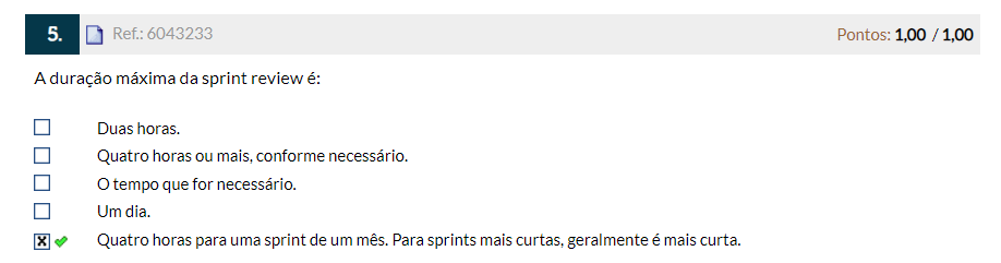 <p>5. Ref.: 6043233 Pontos: A duração maxima da sprint review é: Duas horas. Quatro horas ou mais, conforme necessário. tempo que for necessário. Um dia. Quatro horas para uma sprint de um mês. Para sprints mais curtas, geralmente é mais curta.</p>