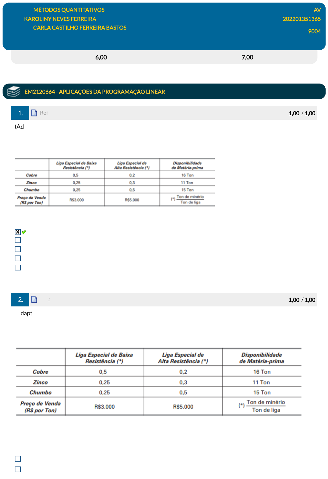 <p>12/06/2023, 08:40 EPS</p><p>https://simulado.estacio.br/alunos/ 1/6</p><p>Disciplina: MÉTODOS QUANTITATIVOS  AV</p><p>Aluno: KAROLINY NEVES FERREIRA 202201351365</p><p>Professor: CARLA CASTILHO FERREIRA BASTOS</p><p>Turma: 9004</p><p>DGT0035_AV_202201351365 (AG)   28/03/2023 08:52:55 (F)</p><p>Avaliação: 6,00 pts Nota SIA: 7,00 pts</p><p>EM2120664 - APLICAÇÕES DA PROGRAMAÇÃO LINEAR</p><p>1. Ref.: 5514340 Pontos: 1,00  / 1,00</p><p>(Adaptado de GOLDBARG; LUNA, 2005) A Tabela a seguir apresenta a proporção de cada material na mistura para a</p><p>obtenção das ligas passíveis de fabricação por uma metalúrgica que deseja maximizar sua receita bruta. O preço está</p><p>cotado em Reais por tonelada da liga fabricada. Também em toneladas estão expressas as restrições de</p><p>disponibilidade de matéria-prima.</p><p>O modelo matemático para este problema de programação linear deve ter:</p><p>Duas variáveis de decisão.</p><p>Seis variáveis de decisão.</p><p>Oito variáveis de decisão.</p><p>Quatro variáveis de decisão.</p><p>Três variáveis de decisão.</p><p>2. Ref.: 5573460 Pontos: 1,00  / 1,00</p><p>(Adaptado de GOLDBARG; LUNA, 2005) A Tabela a seguir apresenta a proporção de cada material na mistura para a</p><p>obtenção das ligas passíveis de fabricação por uma metalúrgica que deseja maximizar sua receita bruta. O preço está</p><p>cotado em Reais por tonelada da liga fabricada. Também em toneladas estão expressas as restrições de</p><p>disponibilidade de matéria-prima.</p><p>A variável de decisão para a modelagem deste problema é xi, que indica a quantidade em toneladas produzidas da</p><p>liga especial de baixa resistência (i = 1) e especial de alta resistência (i = 2). Assim, a restrição associada à</p><p>disponibilidade do cobre é:</p><p>0,5x1 + 0,2x2≥16</p><p>0,25x1 + 0,5x2≤15</p><p>javascript:alert('C%C3%B3digo da quest%C3%A3o: 5514340.');</p><p>javascript:alert('C%C3%B3digo da quest%C3%A3o: 5573460.');</p><p>12/06/2023, 08:40 EPS</p><p>https://simulado.estacio.br/alunos/ 2/6</p><p>0,25x1 + 0,3x2≥11</p><p>0,5x1 + 0,2x2≤16</p><p>0,25x1 + 0,3x2≤11</p><p>3. Ref.: 5573462 Pontos: 0,00  / 1,00</p><p>(Adaptado de GOLDBARG; LUNA, 2005) Um fazendeiro está de�nindo a sua estratégia de plantio para as culturas</p><p>de trigo, arroz e milho na próxima safra. A produtividade de sua terra para as culturas desejadas é: 0,3 kg/m² para o</p><p>trigo; 0,4 kg/m² para o arroz; e 0,5 kg/m² para o milho. O lucro de produção é de 11 centavos por kg de trigo, 5</p><p>centavos por kg de arroz e 2 centavos por kg de milho.</p><p>O fazendeiro dispõe de 400.000m² de área cultivável, sendo que, para atender às demandas de sua própria fazenda,</p><p>deve ser plantado, no mínimo, 500m² de trigo, 1000m² de arroz e 20.000m² de milho. Ainda, devido à restrição de</p><p>capacidade de armazenamento dos silos da fazenda, a produção está limitada a 100 toneladas.</p><p>Adote a área a ser plantada como a variável de decisão para o modelo matemático deste problema, ou seja, xi= área</p><p>em m2 a ser plantada da cultura do tipo i = (T-Trigo, A-Arroz, M-Milho). Assim, a restrição associada armazenamento</p><p>é:</p><p>0,3xt+0,4xa+0,5xm≥100.000</p><p>0,3xt+0,4xa+0,5xm≤100</p><p>0,3xt+0,4xa+0,5xm≤100.000</p><p>xt+xa+xm≤400.000</p><p>0,3xt+0,4xa+0,5xm≥100</p><p>EM2120820 - A PESQUISA OPERACIONAL COMO FERRAMENTA DE APOIO À DECISÃO</p><p>4. Ref.: 7803076 Pontos: 0,00  / 1,00</p><p>Considere as seguintes a�rmações sobre Pesquisa Operacional:</p><p>I. Entre as técnicas de Pesquisa Operacional, apenas a Programação Matemática estuda, desenvolve e aplica</p><p>métodos analíticos avançados para auxiliar na tomada de melhores decisões nas mais diversas áreas de atuação</p><p>humana.</p><p>II. A Pesquisa Operacional surgiu para auxiliar no planejamento e controle da produção, tendo sido empregada,</p><p>também no meio militar.</p><p>III. Empresas dos mais diversos setores empregam técnicas de Pesquisa Operacional com intuito de tornar seu</p><p>processo de tomada de decisão mais e�ciente e assertivo.</p><p>Está correto apenas o que se a�rma em:</p><p>II, apenas.</p><p>I, apenas.</p><p>III, apenas.</p><p>I e III, apenas.</p><p>II e III, apenas.</p><p>5. Ref.: 7803172 Pontos: 1,00  / 1,00</p><p>É possível concluir que um modelo é uma representação abstrata e simpli�cada de um sistema real, com o qual se</p><p>pode explicar, reproduzir, simular e testar seu comportamento, em seu todo ou em partes. Nesse sentido, avalie as</p><p>javascript:alert('C%C3%B3digo da quest%C3%A3o: 5573462.');</p><p>javascript:alert('C%C3%B3digo da quest%C3%A3o: 7803076.');</p><p>javascript:alert('C%C3%B3digo da quest%C3%A3o: 7803172.');</p><p>12/06/2023, 08:40 EPS</p><p>https://simulado.estacio.br/alunos/ 3/6</p><p>assertivas abaixo.</p><p>I - Mapa rodoviário.</p><p>II - Maquete de uma casa.</p><p>III - Modelo algébrico.</p><p>IV - Tabela de dados não estruturados.</p><p>Assinale a alternativa que corresponde a um exemplo de modelo físico.</p><p>III e IV, apenas.</p><p>II, III e IV.</p><p>I, II e III.</p><p>I e II, apenas.</p><p>II e IV, apenas.</p><p>EM2120821 - DUALIDADE E ANÁLISE DE SENSIBILIDADE</p><p>6. Ref.: 5573530 Pontos: 1,00  / 1,00</p><p>Uma confeitaria produz três tipos de bolos: de chocolate, de laranja e de limão. As quantidades de alguns</p><p>ingredientes de cada tipo de bolo estão na tabela a seguir</p><p>O modelo matemático para o planejamento da produção diária de bolos, com o objetivo de maximizar o lucro da</p><p>confeitaria, é dado por:</p><p>Com base nesses dados, respondonda às questões.</p><p>Em relação ao dual para o problema, é correto a�rmar que:</p><p>As restrições do dual são do tipo =.</p><p>As restrições do dual são do tipo ≤.</p><p>Não existem restrições para o dual.</p><p>As restrições do dual são do tipo ≥.</p><p>Não há restriç