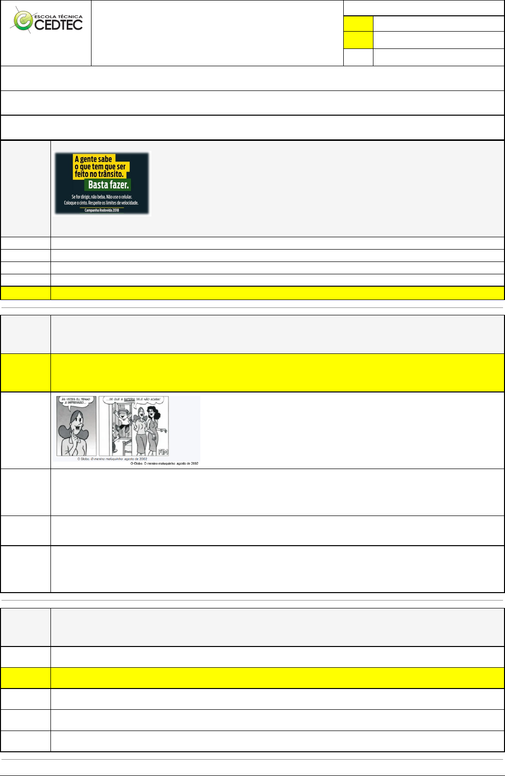 <p>Pincel Atômico - 24/09/2024 10:28:23 1/2</p><p>GILSON LUCAS DA</p><p>COSTA DO</p><p>NASCIMENTO</p><p>Exercício Caminho do Conhecimento - Etapa 7 (33880)</p><p>Atividade finalizada em 18/09/2024 14:54:38 (2690331 / 1)</p><p>LEGENDA</p><p>Resposta correta na questão</p><p># Resposta correta - Questão Anulada</p><p>X Resposta selecionada pelo Aluno</p><p>Disciplina:</p><p>LÍNGUA PORTUGUESA - 1ª ETAPA [1263813] - Avaliação com 5 questões, com o peso total de 14,29 pontos [capítulos - 1]</p><p>Turma:</p><p>Supletivo EJA: Ensino Médio - Grupo: EAD EJA - 08/24 - SEnsi0A100824 [139120]</p><p>Aluno(a):</p><p>91659779 - GILSON LUCAS DA COSTA DO NASCIMENTO - Respondeu 4 questões corretas, obtendo um total de 11,43 pontos como nota</p><p>[364841_2480</p><p>10]</p><p>Questão</p><p>001</p><p>Leia o texto abaixo e resolva à questão:</p><p>O texto acima tem o foco comunicativo no destinatário (leitor), de modo que o objetivo é persuadi-lo através da mensagem transmitida.</p><p>Logo, a função predominante da linguagem é:</p><p>Metalinguística</p><p>Referencial ou Denotativa</p><p>Emotiva ou Expressiva</p><p>Poética</p><p>X Conativa ou Apelativa</p><p>[364842_2480</p><p>01]</p><p>Questão</p><p>002</p><p>O termo (ou expressão) destacado que está empregado em seu sentido próprio, denotativo, ocorre em:</p><p>X</p><p>“O dicionário-padrão da língua e os dicionários unilíngues são os tipos mais comuns de dicionários. Em nossos dias, eles se tornaram um</p><p>objeto de consumo obrigatório para as nações civilizadas e desenvolvidas.”</p><p>(Maria T. Camargo Biderman. O dicionário-padrão da língua. Alfa (28), 2743, 1974 Supl.)</p><p>“(....)</p><p>É de laço e de nó</p><p>De gibeira o jiló</p><p>Dessa vida, cumprida a sol (....)”</p><p>(Renato Teixeira. Romaria. Kuarup Discos. setembro de 1992.)</p><p>“Humorismo é a arte de fazer cócegas no raciocínio dos outros. Há duas espécies de humorismo: o trágico e o cômico. O trágico é o que</p><p>não consegue fazer rir; o cômico é o que é verdadeiramente trágico para se fazer.”</p><p>(Leon Eliachar. www.mercadolivre.com.br <http://www.mercadolivre.com.br)</p><p>“Protegendo os inocentes</p><p>é que Deus, sábio demais,</p><p>põe cenários diferentes</p><p>nas impressões digitais.”</p><p>(Maria N. S. Carvalho. Evangelho da Trova. /s.n.b.)</p><p>[364841_2305</p><p>77]</p><p>Questão</p><p>003</p><p>“Palavras homônimas ou homônimos são palavras que são pronunciadas da mesma forma, mas têm significados diferentes. As relações</p><p>de homonímia são estudadas pela semântica.” Com base nessa definição, explique o motivo da utilização dos “porquês” neste trecho:</p><p>“Estou cansada, porque trabalho o dia inteiro. Além disso, não gosto de shows ao vivo e todos sabem o porquê.”</p><p>A primeira forma indica causa, tendo o valor de “porém”, não estando acentuado porque é um substantivo que está no início de frase. A</p><p>segunda indica explicação, estando acentuado porque é um substantivo que está no final da frase.</p><p>A primeira forma indica a explicação para o sujeito estar cansado, tendo o valor de “pois”. A segunda é um substantivo, o qual indica que o</p><p>sujeito não gosta de shows ao vivo e que todos sabem disso, podendo ser substituído por “motivo”.</p><p>Os dois porquês são utilizados aqui para trazer a explicação para o cansaço do sujeito e para o fato de não gostar de ir ao show ao vivo,</p><p>um estando sem acento porque está no início da frase e o outro levando acento porque está no final da frase.</p><p>X A primeira forma indica causa, tendo o valor de “pois”, não estando acentuado porque é um substantivo e que está no início da frase. A</p><p>segunda também indica causa, estando acentuado porque é um substantivo que está no final da frase.</p><p>A primeira forma indica motivo, tendo o valor de “pois”, não sendo acentuado porque não é um substantivo. A segunda também indica um</p><p>motivo, não sendo substantivo e levando o acento apenas porque está no final da frase.</p><p>Pincel Atômico - 24/09/2024 10:28:23 2/2</p><p>[364842_2479</p><p>81]</p><p>Questão</p><p>004</p><p>Homônimo é uma palavra que tem a mesma pronúncia e/ou a mesma grafia que outra, mas que possui um significado diferente desta.</p><p>Complete as lacunas, usando adequadamente mas / mais / mal / mau:</p><p>“Pedro e João ____ entraram em casa, perceberam que as coisas não estavam bem, pois sua irmã caçula escolhera um ____ momento</p><p>para comunicar aos pais que iria viajar nas férias, ____ seus dois irmãos deixaram os pais ____ sossegados quando disseram que a jovem</p><p>iria com as primas e tias”</p><p>mal – mau – mais – mais</p><p>mau – mau – mas – mais</p><p>mau – mal – mais – mas</p><p>X mal – mau – mas – mais</p><p>mal – mal – mais – mais</p><p>[364843_2479</p><p>82]</p><p>Questão</p><p>005</p><p>Parônimos são palavras que são pronunciadas ou escritas de maneira semelhante, mas que têm significados lexicais diferentes.</p><p>Parônimos contrastam com homônimos, que são palavras com significados diferentes, com a mesma pronúncia ou ortografia.</p><p>Analise atentamente o trecho:</p><p>“Algumas pessoas não determinam donde provém sua insatisfação, porque não sabem ____ vão os sentimentos, nem ____ mora a</p><p>consideração pelo próximo”.</p><p>Assinale a alternativa que completa corretamente as lacunas acima.</p><p>X aonde – onde</p><p>onde – aonde</p><p>onde – onde</p><p>aonde – aonde</p><p>onde – donde</p>