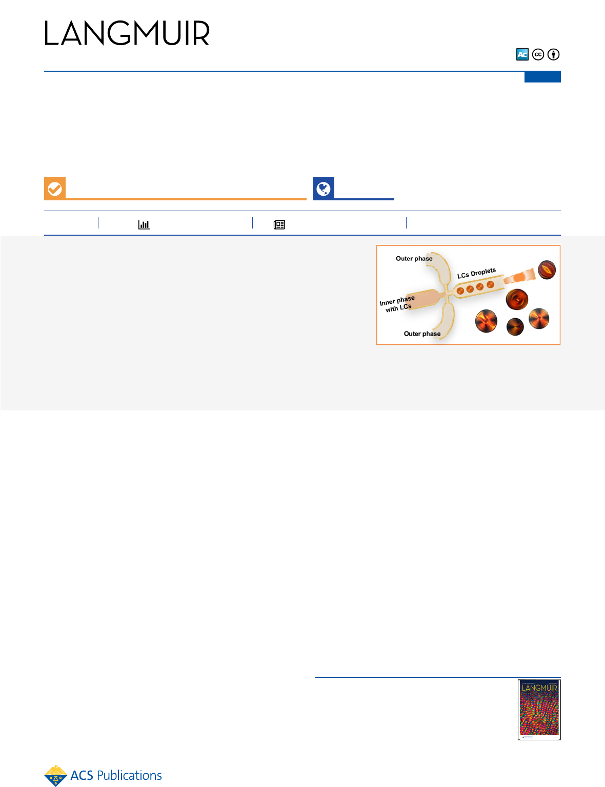 <p>Sunset Yellow Confined in Curved Geometry: A Microfluidic</p><p>Approach</p><p>Caterina Maria Tone,* Alessandra Zizzari,* Lorenza Spina, Monica Bianco, Maria Penelope De Santo,*</p><p>Valentina Arima,* Riccardo Cristoforo Barberi, and Federica Ciuchi</p><p>Cite This: Langmuir 2023, 39, 6134−6141 Read Online</p><p>ACCESS Metrics & More Article Recommendations *sı Supporting Information</p><p>ABSTRACT: The behavior of lyotropic chromonic liquid crystals (LCLCs) in</p><p>confined environments is an interesting research field that still awaits exploration,</p><p>with multiple key variables to be uncovered and understood. Microfluidics is a</p><p>highly versatile technique that allows us to confine LCLCs in micrometric spheres.</p><p>As microscale networks offer distinct interplays between the surface effects,</p><p>geometric confinement, and viscosity parameters, rich and unique interactions</p><p>emerging at the LCLC−microfluidic channel interfaces are expected. Here, we</p><p>report on the behavior of pure and chiral doped nematic Sunset Yellow (SSY)</p><p>chromonic microdroplets produced through a microfluidic flow-focusing device.</p><p>The continuous production of SSY microdroplets with controllable size gives the</p><p>possibility to systematically study their topological textures as the function of their diameters. Indeed, doped SSY microdroplets</p><p>produced via microfluidics, show topologies that are typical of common chiral thermotropic liquid crystals. Furthermore, few</p><p>droplets exhibit a peculiar texture never observed for chiral chromonic liquid crystals. Finally, the achieved precise control of the</p><p>produced LCLC microdroplets is a crucial step for technological applications in biosensing and anticounterfeiting.</p><p>■ INTRODUCTION</p><p>In recent years, thermotropic liquid crystals (LCs) have been</p><p>confined and studied in droplets and shells showing complex</p><p>topological defects strongly related to their intrinsic aniso-</p><p>tropy.1−5</p><p>Lyotropic chromonic liquid crystals are a special class of</p><p>lyotropic LCs that are formed by anisotropic assemblies of</p><p>water-soluble disk-shaped molecules that have an aromatic</p><p>core surrounded by ionic groups. Among LCLCs, there are</p><p>DNA and its bases, disodium cromoglycate (DSCG), a</p><p>commonly used drug, and sunset yellow (SSY), a dye used</p><p>in the food industry.6,7 Unlike lyotropic LCs, LCLCs do not</p><p>form micelles; rather, they stack up as linear aggregates, held</p><p>together by noncovalent interactions, which lead to a self-</p><p>assembled nematic phase or a columnar phase with a</p><p>hexagonal arrangement possessing unique optical proper-</p><p>ties.8−11 The weak interaction forces driving the self-assembled</p><p>phase formation make LCLCs highly responsive to external</p><p>stimuli (temperature, concentration, pH, ionic content, etc.)</p><p>and geometric constraints, thus conferring them distinctive</p><p>properties such as negative birefringence and a large anisotropy</p><p>in the elastic constants. Moreover, owing to biocompatibility</p><p>and anisotropic properties, LCLCs have been explored in</p><p>biological applications such as drug delivery12 and optical</p><p>biosensing13 and in technological applications.14 Curved</p><p>confinement can trigger unconventional effects on LCLCs</p><p>because their alignment direction sufficiently anchored at the</p><p>boundary will be transmitted into the bulk in the form of an</p><p>orientation field deformation. The latter leads to the</p><p>generation of new structures with controllable topological</p><p>defects or dislocations. Recently, few research groups have</p><p>studied the confinement-induced reflection symmetry breaking</p><p>of nematic LCLCs in curved geometries like tactoids,</p><p>microspheres, or cylinders.15−19 Cholesteric LCLCs confined</p><p>in microspheres have been studied as well, the chirality in some</p><p>cases is native,20 while in others, it can be induced by doping</p><p>the nematic phase with suitable molecules, for example, amino</p><p>acids.21,22 Microspheres are obtained by emulsification, i.e.,</p><p>through the mechanical agitation of a mixture based on an</p><p>immiscible matrix and the LCLC phase.23,24</p><p>Despite the large number of microspheres produced by this</p><p>method, it is not possible to achieve fine control of their size,</p><p>which plays a fundamental role in their final optical texture.</p><p>This is important for applications (i.e., anticounterfeiting or</p><p>biosensing) in which the production of precise size</p><p>distributions of microstructures with particular optical features</p><p>is the prerequisite for the correct functionality of the</p><p>device.25,26 The size control can be achieved using a</p><p>Received: January 30, 2023</p><p>Revised: April 4, 2023</p><p>Published: April 19, 2023</p><p>Articlepubs.acs.org/Langmuir</p><p>© 2023 The Authors. Published by</p><p>American Chemical Society</p><p>6134</p><p>https://doi.org/10.1021/acs.langmuir.3c00275</p><p>Langmuir 2023, 39, 6134−6141</p><p>D</p><p>ow</p><p>nl</p><p>oa</p><p>de</p><p>d</p><p>vi</p><p>a</p><p>U</p><p>N</p><p>IV</p><p>O</p><p>F</p><p>SA</p><p>O</p><p>P</p><p>A</p><p>U</p><p>L</p><p>O</p><p>o</p><p>n</p><p>Se</p><p>pt</p><p>em</p><p>be</p><p>r</p><p>11</p><p>, 2</p><p>02</p><p>4</p><p>at</p><p>1</p><p>7:</p><p>49</p><p>:3</p><p>2</p><p>(U</p><p>T</p><p>C</p><p>).</p><p>Se</p><p>e</p><p>ht</p><p>tp</p><p>s:</p><p>//p</p><p>ub</p><p>s.</p><p>ac</p><p>s.</p><p>or</p><p>g/</p><p>sh</p><p>ar</p><p>in</p><p>gg</p><p>ui</p><p>de</p><p>lin</p><p>es</p><p>f</p><p>or</p><p>o</p><p>pt</p><p>io</p><p>ns</p><p>o</p><p>n</p><p>ho</p><p>w</p><p>to</p><p>le</p><p>gi</p><p>tim</p><p>at</p><p>el</p><p>y</p><p>sh</p><p>ar</p><p>e</p><p>pu</p><p>bl</p><p>is</p><p>he</p><p>d</p><p>ar</p><p>tic</p><p>le</p><p>s.</p><p>https://pubs.acs.org/action/doSearch?field1=Contrib&text1="Caterina+Maria+Tone"&field2=AllFiel