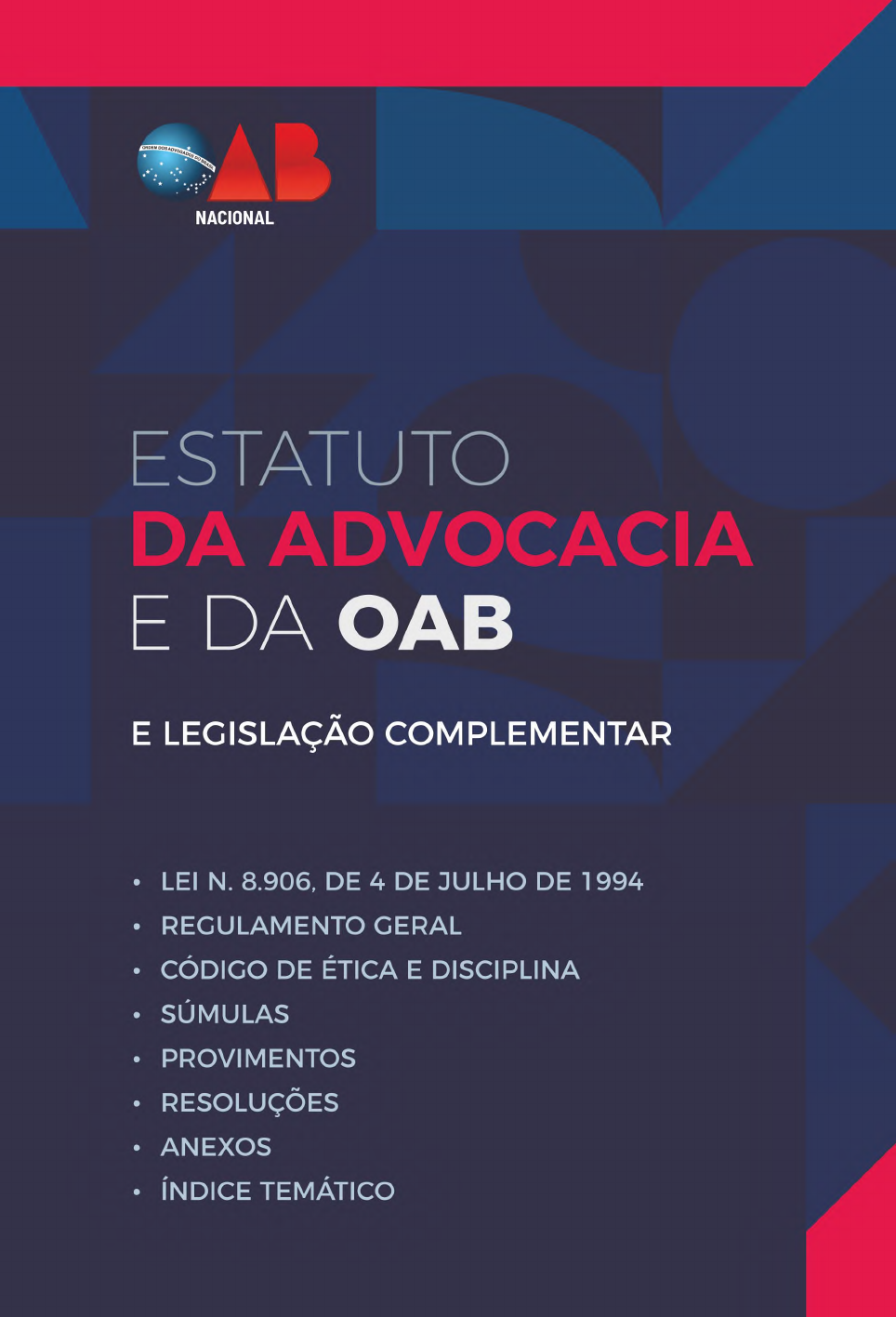 <p>Estatuto da Advocacia e da OAB</p><p>e Legislação Complementar</p><p>ORDEM DOS ADVOGADOS DO BRASIL - CONSELHO FEDERAL</p><p>Estatuto da Advocacia e da OAB</p><p>e Legislação Complementar</p><p>Lei n. 8.906, de 4 de julho de 1994</p><p>Regulamento Geral</p><p>Código de Ética e Disciplina</p><p>Súmulas</p><p>Provimentos</p><p>Resoluções</p><p>Anexos</p><p>Índice Temático</p><p>Brasília - DF, 2024</p><p>© Ordem dos Advogados do Brasil</p><p>Conselho Federal, 2024</p><p>Setor de Autarquias Sul - Quadra 5, Lote 1, Bloco M</p><p>Brasília – DF CEP: 70070-939</p><p>Distribuição: Conselho Federal da OAB – GRE</p><p>E-mail: oabeditora@oab.org.br</p><p>Dados Internacionais de Catalogação na Publicação (CIP)</p><p>(Conselho Federal da Ordem dos Advogados do Brasil – Biblioteca Arx Tourinho)</p><p>B823e</p><p>Brasil.</p><p>[Estatuto da advocacia e Ordem dos Advogados do Brasil (1994)].</p><p>Estatuto da advocacia e da OAB e legislação complementar – versão</p><p>eletrônica – Brasília: OAB, Conselho Federal, 2024.</p><p>PDF (ix, 468 p).</p><p>Organização, atualização e revisão: Aline Portela Bandeira, Francisca Miguel,</p><p>Luana Silva de Souza, Priscilla Lisboa Pereira e Tarcizo Roberto do Nascimento.</p><p>Conteúdo: Lei n. 8.906, de 4 de julho de 1994 -- Regulamento geral -- Código de</p><p>ética e disciplina -- Súmulas -- Provimentos – Resoluções -- Anexos -- Índice</p><p>temático.</p><p>ISBN: 978-65-5819-059-2.</p><p>1. Advocacia, estatuto, Brasil. 2. Advocacia, regulamentação, Brasil. 3.</p><p>Advogado, ética profissional, Brasil. 4. Ética forense, Brasil. I. Brasil.</p><p>Estatuto da Advocacia e Ordem dos Advogados do Brasil (1994). II. Título.</p><p>CDD: 341.415</p><p>CDU: 347.965.8 (094.5)</p><p>Gestão 2022/2025</p><p>Diretoria</p><p>José Alberto Simonetti Presidente</p><p>Rafael de Assis Horn Vice-Presidente</p><p>Sayury Silva de Otoni Secretária-Geral</p><p>Milena da Gama Fernandes Canto Secretária-Geral Adjunta</p><p>Leonardo Pio da Silva Campos Diretor-Tesoureiro</p><p>Conselheiros Federais</p><p>AC: Alessandro Callil de Castro, Harlem Moreira de Sousa, Helcinkia Albuquerque dos Santos; Célia</p><p>da Cruz Barros Cabral Ferreira e Raquel Eline da Silva Albuquerque; AL: Cláudia Lopes Medeiros,</p><p>Fernando Antônio Jambo Muniz Falcão, Sérgio Ludmer; Marialba dos Santos Braga, Marcos Barros</p><p>Méro Júnior e Rachel Cabus Moreira; AP: Aurilene Uchôa de Brito, Felipe Sarmento Cordeiro, Sinya</p><p>Simone Gurgel Juarez; André de Carvalho Lobato e Wiliane da Silva Favacho; AM: Ezelaide Viegas</p><p>da Costa Almeida; Gina Carla Sarkis Romeiro, Marco Aurélio de Lima Choy; Jonny Cleuter Simões</p><p>Mendonça, Maria Gláucia Barbosa Soares e Ricardo da Cunha Costa; BA: Luiz Augusto Reis de</p><p>Azevedo Coutinho, Luiz Viana Queiroz, Marilda Sampaio de Miranda Santana; Fabrício de Castro</p><p>Oliveira, Mariana Matos de Oliveira e Silvia Nascimento Cardoso dos Santos Cerqueira; CE: Ana</p><p>Vládia Martins Feitosa, Caio Cesar Vieira Rocha, Hélio das Chagas Leitão Neto; Ana Paula Araújo de</p><p>Holanda, Cassio Felipe Goes Pacheco e Katianne Wirna Rodrigues Cruz Aragão; DF: Cristiane</p><p>Damasceno Leite, Francisco Queiroz Caputo Neto, Ticiano Figueiredo de Oliveira; José Cardoso Dutra</p><p>Júnior, Maria Dionne de Araújo Felipe e Nicole Carvalho Goulart; ES: Jedson Marchesi Maioli, Márcio</p><p>Brotto de Barros, Sayury Silva de Otoni; Alessandro Rostagno, Lara Diaz Leal Gimenes e Luciana</p><p>Mattar Vilela Nemer; GO: Ariana Garcia do Nascimento Teles, David Soares da Costa Júnior, Lúcio</p><p>Flávio Siqueira de Paiva; Arlete Mesquita, Layla Milena Oliveira Gomes e Roberto Serra da Silva Maia;</p><p>MA: Ana Karolina Sousa de Carvalho Nunes, Daniel Blume Pereira de Almeida, Thiago Roberto</p><p>Morais Diaz; Cacilda Pereira Martins, Charles Henrique Miguez Dias e Fernanda Beatriz Almeida</p><p>Castro; MT: Claudia Pereira Braga Negrão, Leonardo Pio da Silva Campos, Ulisses Rabaneda dos</p><p>Santos; Ana Carolina Naves Dias Barchet, Mara Yane Barros Samaniego e Stalyn Paniago Pereira; MS:</p><p>Andrea Flores, Mansour Elias Karmouche, Ricardo Souza Pereira; Afeife Mohamad Hajj, Gaya Lehn</p><p>Schneider Paulino e Giovanna Paliarin Castellucci; MG: Marcelo Tostes de Castro Maia, Misabel de</p><p>Abreu Machado Derzi, Sergio Murilo Diniz Braga; Daniela Marques Batista Santos de Almeida, Nubia</p><p>Elizabette de Jesus Paula e Wagner Antonio Policeni Parrot; PA: Alberto Antonio de Albuquerque</p><p>Campos, Cristina Silva Alves Lourenço, Jader Kahwage David; Ana Ialis Baretta, Luiz Sérgio Pinheiro</p><p>Filho e Suena Carvalho Mourão; PB: Marina Motta Benevides Gadelha, Paulo Antônio Maia e Silva,</p><p>Rodrigo Azevedo Toscano de Brito; André Luiz Cavalcanti Cabral, Michelle Ramalho Cardoso e</p><p>Rebeca Sodré de Melo da Fonseca Figueiredo; PR: Ana Claudia Piraja Bandeira, José Augusto Araújo</p><p>de Noronha, Rodrigo Sanchez Rios; Artur Humberto Piancastelli, Graciela Iurk Marins e Silvana</p><p>Cristina de Oliveira Niemczewski; PE: Bruno de Albuquerque Baptista, Ronnie Preuss Duarte; Ana</p><p>Lúcia Bernardo de Almeida Nascimento, Mozart Borba Neves Filho e Yanne Katt Teles Rodrigues; PI:</p><p>Carlos Augusto de Oliveira Medeiros Júnior, Élida Fabrícia Oliveira Machado Franklin, Shaymmon</p><p>Emanoel Rodrigues de Moura Sousa; Antonio Augusto Pires Brandão, Isabella Nogueira Paranaguá de</p><p>Carvalho Drumond e Jamylle Torres Viana Vieira de Alencar Leite Lima; RJ: Juliana Hoppner</p><p>Bumachar Schmidt, Marcelo Fontes Cesar de Oliveira, Paulo Cesar Salomão Filho; Eurico de Jesus</p><p>Teles Neto, Fernanda Lara Tortima e Marta Cristina de Faria Alves; RN: André Augusto de Castro,</p><p>Milena da Gama Fernandes Canto, Olavo Hamilton Ayres Freire de Andrade; Gabriella de Melo Souza</p><p>Rodrigues Rebouças Barros; Mariana Iasmim Bezerra Soares e Síldilon Maia Thomaz do Nascimento;</p><p>RS: Greice Fo