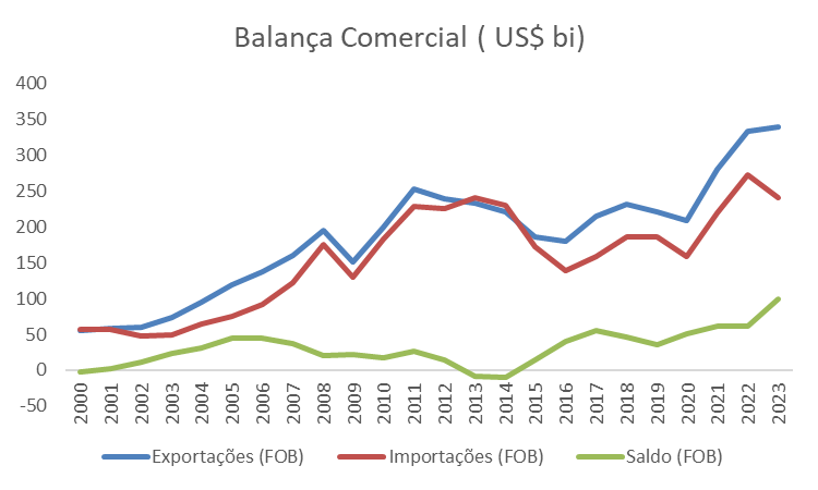 <p>Balança Comercial ( US$ bi) 400 350 300 250 200 150 100 50 -50 Exportações (FOB) Importações (FOB) Saldo (FOB)</p>