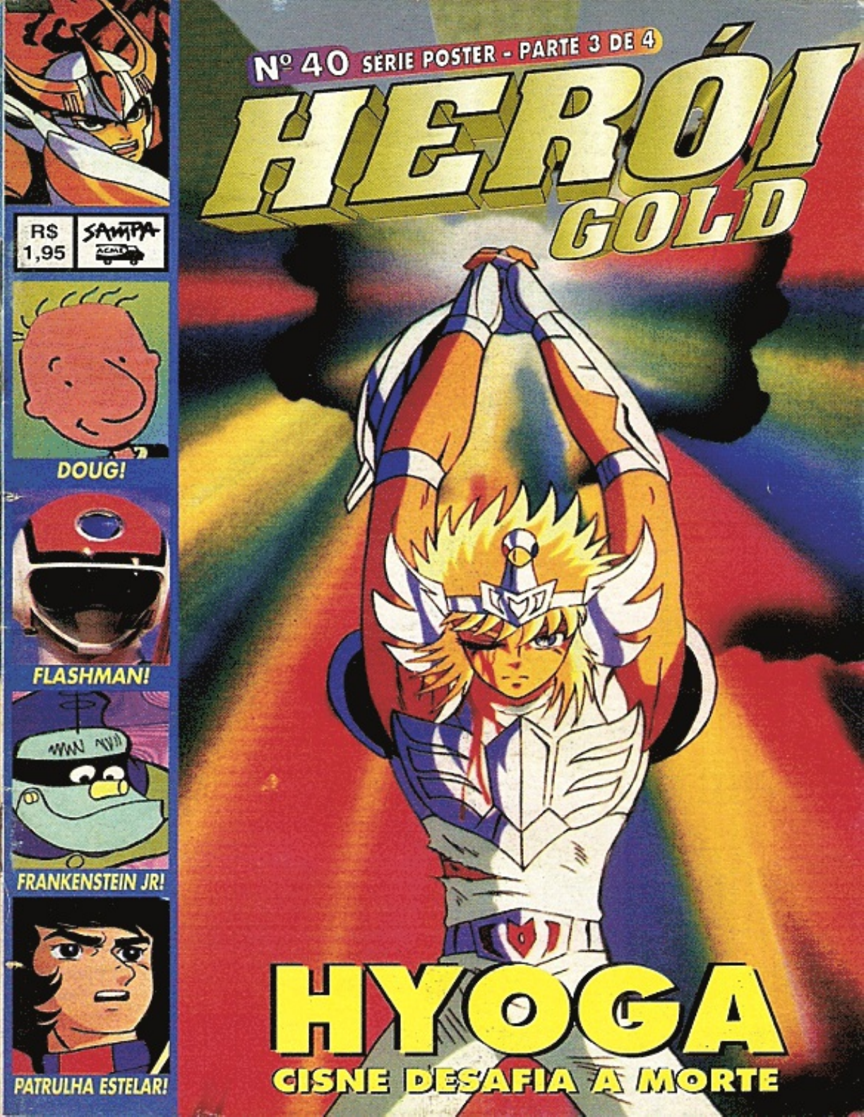 <p>SÉRIE POSTER PARTE 3 DE 4 R$ SAMPA GOLD 1,95 DOUG! FLASHMAN! FRANKENSTEIN JR! HYOGA PATRULHA ESTELAR! CISNE DESAFIA A MORTE</p><p>HERÓI PREFERIDO DE QUEM ENTENDE DE HEROIS Descubra porque muita gente não troca SPIRIT por nenhum outro mascarado. Todo mês, um novo A venda nas bancas quadrinhos</p><p>que de mais no mundo dos desenhos, do Não fácil fazer revista assim. Mas melhor. a gente Dizerri que 40. Aqui HERO! ele ficar melhor ainda! e GOLD EQUIPE Redação Arte Thales de Menezes HEROI n° 40 6 uma da Bikini (Manda-Chuva) Diretriz Editora com Maria Amélia de Azevedo Odair Braz Jr. (Bacana) Editora Acme. Sampa: Adriana Cristina Siqueira Carlos Acme: Direfores: Ester A. de Azevedo (Batatinha) Norbertino Andre James Fernando Endereço: R. da 213, Rogério Valadares (Chuchu) Leandro Silveira Alves Vila Mariana CEP: 01544-000 Elvis Ricardo Jr. (Espelo) Renata Hanks São Paulo/SP. W.Roth Renato Yada Todas Colaboradores to são usodos de Alexandre Nagado Correspondentes do Carlos Primati Barcinski (N. York) Flashmen Camilo Rocha (Londres) Edson E DC Comics; Impossi Fábio Cobiaco Publicidade Magic D Marcelo Del Greco Cláudio Camargo, of the Ricardo Giassetti Salaminho Francisco fone Vira</p><p>40 32 DON E SEU POVO 24 0</p><p>38</p><p>e OS IMPOSSIVEIS (Frankenstein Jr. e The Impossibles)</p><p>S e você não lembra, Frankstein que os fäs do era um gigantesco power trio não mascarado, criado pelo desconfiam é que na moleque Bob Conroy, filho do eles são Professor Conroy. garoto combatentes do crimel acionava o robô com o seu Recebendo missões de seu anel radar. No ombro do seu chefe através de uma pequena enorme amigo, Bob gritava tela de TV oscondida na "Alakazam!" toda vez que guitarra, eles partem para o saiam do laboratório do ação gritando "E vamos Professor Conroy para nós!!!". Eles então se combater o mal. transformam nos tinha todo tipo de arma que Homem-Mola, você pode imaginar. Multi-Homem e Homem-Fluido. Para cada situação Homem-Mola é de aparecia um novo tipo enrolar as suas pernas como de raio, que podia sair uma Multi-Homem do emblema, da cabeça OU consegue multiplicar a sua dos dedos do Bob própria figura muitas vezes e acionava o ataque com uns o Homem-Fluído fica de botões que ficavam na nuca qualquer formato liquido. Os do robô, mas o importante é adversários dos Impossíveis que a dupla tinha sempre a não são menos solução para qualquer sempre quando derrotados, problema! são obrigados a admitir Os Impossíveis são uma que os banda de rock, são impossíveis formada por três mesmo! outra página Frankenstein Jr e Bob Conroy. Aqui os super-heróis do Os Impossíveis</p><p>Um dia, cinco crianças foram raptadas da Terra e COM ANDO FLAS</p><p>evadas ans confins do vinte anos ESTRELAR IMAN</p><p>V pela Galáxia a bordo para consequir cobalas para suas do Cruzador Mez. experiências com mutação Monarca La Deus e sintetizada. Sequestrados por Doutor se empenham em Caçadores a serviço de La criar e manipular todas as cinco da Terra são salvos formas de vida. pelo povo do distante Planeta eles contam Flash e treinados para serem com serviço de grandes Eles como os Caçadores poderes armas. uniformes e três veículos que se no robô Flash King. Assim. os jovens Din. Dan. Sara. Goh e se tornam Flashman - Comando Um dia. Cruzador Imperial Mez chega à Terra e a equipe Flashman decide se vingar de La Deus. De volta ao Planeta Terra. os Flashmen iniciam sua batalha contra as forças de Mez e começam a procurar por seus verdadeiros pais. De todos, apenas Sara descobre sua real Seu pai é cientista Dr. mas não motivo para alegria. A energia Flash que heróis no corpo causa uma espécie de rejeição energética atmosfera da Terra e a vida deles começa a se esgotar. Para sobreviver. os cinco devem fugir da Kaura, o lider dos espaciais Terra e voltar para</p><p>Comando Estelar Flashman Flashman Dan Cosmic Goh, Sarah, Planeta Flash. Antes, porém, dia voltar para a Terra. eles decidem destruir a gangue a fórmula de de La Deus e Kefler. Lutando no dos "Super limite de suas a equipe pode ser Flashman triunfa e retorna a traduzido por exército, Flash com a promessa de um ou</p><p>Titan Junior, o segundo robô deles Os Flashman enterram o amigo Barak Gran Titan, arma suprema Flash King, o primeiro robô da equipe</p><p>Flash King contra o monstro Za Scondar Red Flash x Kaura: a luta FICHA Tyo Shin Flashman a segunda Flashman produção desse estilo a passar Exibição original: De 01/03/86 a 21/ no Brasil. logo após Changeman 02/87 TV Asahi, Japão a Herái 32). Foi também a Total: episódios para TV e um primeira série a apresentar mais para cinema de um para a equipe. No Saburo Yatsude caso. eram as Titan Roteiro: Takao Boy e Gran Titan. Nagalshi principals Apesar da qualidade da Design: Suguru Idebuti Flashman cativa as Trilha sonora: Kouhel Tanaka crianças até hoje. nas tardes Direção: Tojo. da TV Record. A maior prova Takao principals disso estréla do serviço Produção: Company telefônico Distribuição no Brasil: Tikara Filmes lançado há alguns meses No Japão. o sucesso de Flashman foi grande o Red Flash: Fujita Taremizu Green Flash: Kihatiro Uemura suficiente para que a série Blue Flash: Yasuhiro seguinte recebesse mais Sara/ Yellow Flash: Yoko Nakamura recursos e uma produção bem melhor por parte da Toei Com- Lu/ Pink Flash: Mayumi Yoshida Tokimura: Akira pany. resultado foi a série Nefer: Sayoko Haki que você val ver em Kaura: Johji Nakata breve nas páginas da Dubles: Japan Action Club JAC Aguarde! Versão Alamo ALEXANDRE NAGADO</p><p>QUADRINHOS N uma em que se consolidava o formato das minisséries nos quadrinhos, Lendas CLASSICOS veio como uma resposta da DC Comics a Guerras Secretas, da Marvel. Para reunir todos os do universo DC em uma história, LENDAS os roteiristas John Ostrander e Len Wein escolheram o grande vilão da casa, Darkseid. Seus planos para destruir a humanidade conseguem jogar a opinião pública c