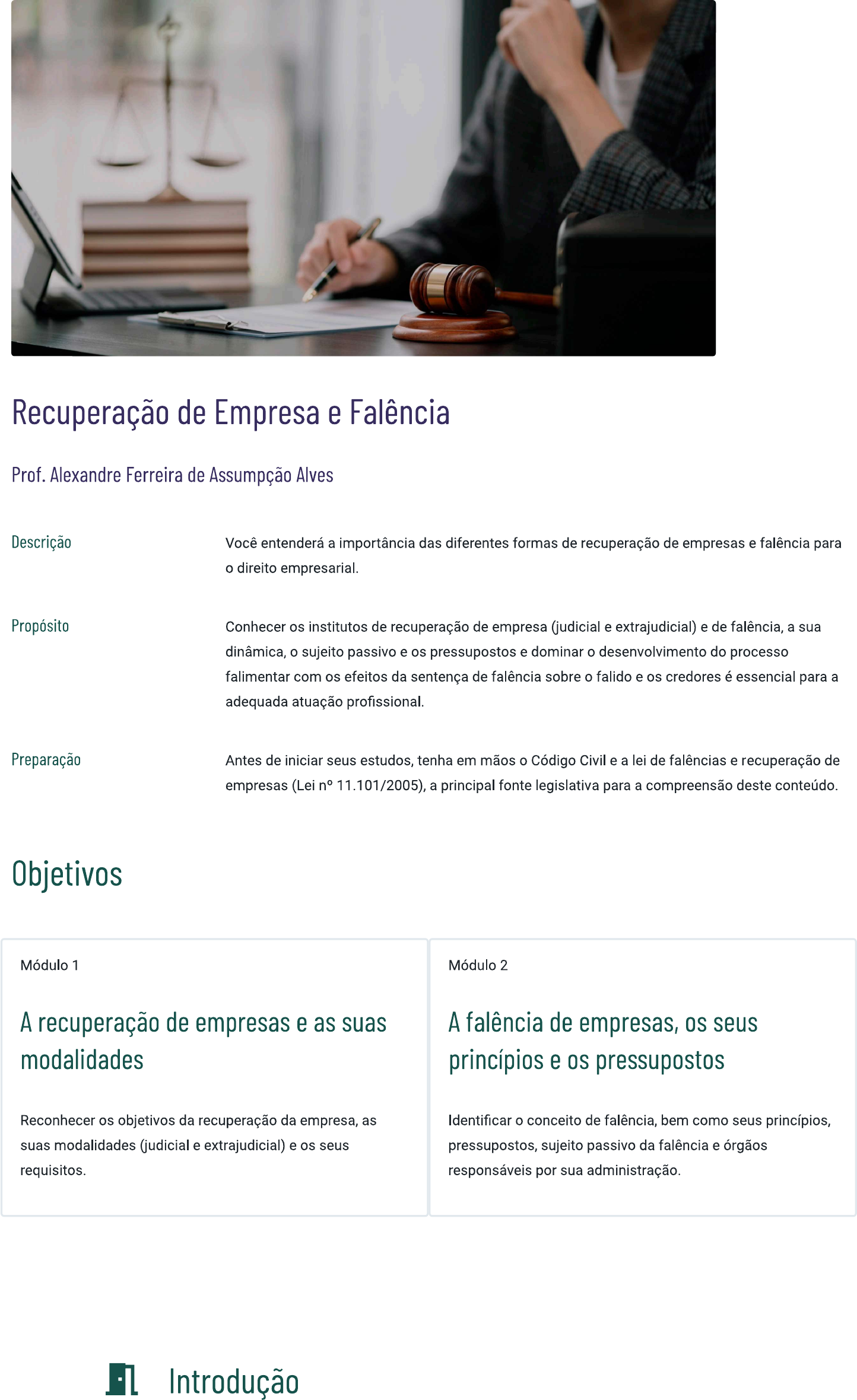 <p>Recuperação de Empresa e Falência Prof. Alexandre Ferreira de Assumpção Alves Descrição Você entenderá a importância das diferentes formas de recuperação de empresas e falência para o direito empresarial. Propósito Conhecer os institutos de recuperação de empresa (judicial e extrajudicial) e de falência, a sua dinâmica, o sujeito passivo e os pressupostos e dominar o desenvolvimento do processo falimentar com os efeitos da sentença de falência sobre o falido e os credores é essencial para a adequada atuação profissional. Preparação Antes de iniciar seus estudos, tenha em mãos o Código Civil e a lei de falências e recuperação de empresas (Lei n° 11.101/2005), a principal fonte legislativa para a compreensão deste conteúdo. Objetivos Módulo 1 Módulo 2 A recuperação de empresas e as suas A falência de empresas, seus modalidades princípios e pressupostos Reconhecer os objetivos da recuperação da empresa, as Identificar o conceito de falência, bem como seus princípios, suas modalidades (judicial e extrajudicial) e os seus pressupostos, sujeito passivo da falência e órgãos requisitos. responsáveis por sua administração. Introdução</p><p>Neste conteúdo, você vai compreender os objetivos e as modalidades de recuperação empresarial a partir do conhecimento de requisitos subjetivos e objetivos para o pedido, o papel dos credores na aprovação do plano de recuperação e as peculiaridades do plano especial para micro e pequenas empresas A recuperação é reservada a empresários registrados, permitindo a renegociação de dívidas para evitar a falência. Existem dois tipos dela: a judicial, em que o devedor apresenta um plano aos credores, e a extrajudicial, em que não há processo judicial. Abordaremos os conceitos de falência, sujeitos envolvidos, administração, classificação de créditos e procedimento falimentar. É importante saber que a Lei n° 11.101/2005 proíbe o falido de retomar suas atividades durante o processo, priorizando a venda dos bens para pagar aos credores. Apesar de o legislador visar à manutenção da empresa na recuperação, a decisão final caberá aos credores e ao juiz. Material para download Clique no botão abaixo para fazer o download do conteúdo completo em formato Download material 1 - A recuperação de empresas e as suas modalidades Ao final deste módulo, você será capaz de reconhecer os objetivos da recuperação da empresa, as suas modalidades (judicial e extrajudicial) e os seus requisitos.</p><p>Objetivos e requisitos para 0 pedido de recuperação judicial Dos objetivos Toda recuperação tem como principal objetivo evitar a decretação da falência, que pode ser iminente, devido à grave situação financeira pela qual o devedor passa no momento do pedido. Historicamente, desde o Código Comercial, de 1850, até o Decreto-lei 7.661/1945 (isto é, a lei de falências anterior à Lei n° 11.101/2005), o comerciante podia propor a seus credores um prazo maior para pagar suas dívidas com ou sem abatimento e sem apresentar um plano de recuperação. Tratava-se de uma simples moratória ou concordata, que, além de ter um limite máximo para o pagamento (três ou dois anos), só atingia os credores quirografários, ou seja, aqueles sem preferência ou privilégio no recebimento do crédito. Atualmente, a Lei 11.101/2005 disciplina tanto o instituto da falência como a recuperação de empresas, e seu artigo 47 dispõe: A recuperação judicial tem por objetivo viabilizar a superação da situação de crise econômico-financeira do devedor, a fim de permitir a manutenção da fonte produtora, do emprego dos trabalhadores e dos interesses dos credores, promovendo, assim, a preservação da empresa, sua função social e o estímulo à atividade econômica. artigo traz cinco princípios a serem observados na condução de todo o processo de recuperação judicial, de forma que os órgãos da recuperação e os credores possam dar apoio à empresa com reais chances de recuperação, harmonizando e tutelando os interesses da coletividade, sem de vista os princípios fundamentais. Acompanhe cada um deles a seguir. Superação da crise o primeiro princípio revela que a medida para a reorganização do empresário é importante. Veremos a necessidade de comprovar na petição de recuperação a deterioração da situação patrimonial do devedor em curto ou médio prazo, por meio de documentos Embora o artigo 47 não mencione o termo falência, deduzimos que a situação de crise do devedor pode levá-lo a isso, pois, se o plano for rejeitado pelos credores, o administrador judicial submeterá, no ato, à votação da assembleia-geral de credores a Empresária analisando documentação e fazendo cálculos. concessão de prazo de 30 dias para que o plano de recuperação judicial seja</p><p>apresentado pelos credores do art. 56 da Lei n° 11.101/2005). Manutenção da fonte produtora o segundo princípio diz respeito à manutenção da fonte produtora, que é a empresa em si. Também há uma relação indireta com a falência, pois, nesse instituto, o estabelecimento é lacrado e a empresa sofre liquidação do seu patrimônio. Com a recuperação, evita-se a liquidação, e a empresa mantém sua atividade regular. Emprego dos trabalhadores terceiro princípio implica o seguinte: se a empresa é a organização dos fatores de produção pelo empresário (e, entre eles, estão compreendidos o capital e a mão de obra), é natural que a continuidade da companhia também mantenha os empregos, porém, sem Empresário conversando com funcionários em nenhuma garantia ou punição para o depósito. empresário que demitir. A ressalva de que o empresário não terá nenhuma garantia ou punição é extremamente importante, porque a leitura do artigo 47 pode dar a impressão de que a recuperação asseguraria a estabilidade no emprego, quando não, pois os empregados podem ser atingidos com a medida, tanto