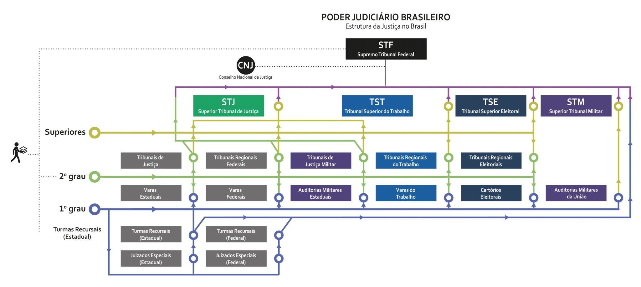 <p>PODER JUDICIÁRIO BRASILEIRO Estrutura da Justiça no Brasil STF Supremo Tribunal Federal CNJ Conselho Nacional de Justiça STJ TST TSE STM Superior Tribunal de Justiça Tribunal Superior do Trabalho Tribunal Superior Eleitoral Superior Tribunal Militar Superiores Tribunais de Tribunais Regionais Tribunais de Tribunais Regionais Tribunais Regionais Justiça Federais Justiça Militar do Trabalho Eleitoriais 2° grau Varas Varas Auditorias Militares Varas do Cartórios Auditorias Militares Estaduais Federais Estaduais Trabalho Eleitorais da União 1° grau Turmas Recursais Turmas Recursais Turmas Recursais (Estadual) (Estadual) (Federal) Juizados Especiais Juizados Especiais (Estadual) (Federal)</p>