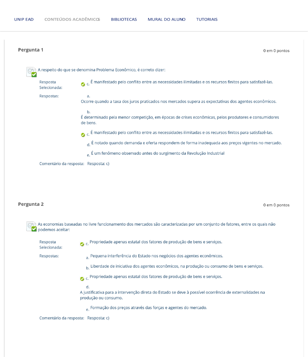 <p>16/04/2024, 20:02 Revisar envio do teste: ATIVIDADE TELEAULA I – ECONOMIA ...</p><p>https://ava.ead.unip.br/webapps/assessment/review/review.jsp?attempt_id=_103848345_1&course_id=_334426_1&content_id=_3842094_1&ret… 1/2</p><p>16/04/2024, 20:02 Revisar envio do teste: ATIVIDADE TELEAULA I – ECONOMIA ...</p><p>https://ava.ead.unip.br/webapps/portal/execute/tabs/tabAction?tab_tab_group_id=_10_1</p><p>https://ava.ead.unip.br/webapps/portal/execute/tabs/tabAction?tab_tab_group_id=_27_1</p><p>https://ava.ead.unip.br/webapps/portal/execute/tabs/tabAction?tab_tab_group_id=_47_1</p><p>https://ava.ead.unip.br/webapps/portal/execute/tabs/tabAction?tab_tab_group_id=_29_1</p><p>https://ava.ead.unip.br/webapps/portal/execute/tabs/tabAction?tab_tab_group_id=_25_1</p><p>Pergunta 3 0 em 0 pontos</p><p>Entre os modelos adotados pelos economistas para a explicação dos assuntos econômicos destaca-se a FPP (Fronteira de Possibilidades de Produção),</p><p>que:</p><p>Resposta a.</p><p>Selecionada: Demonstra a variação na disponibilização de dois produtos (ou mesmo de um conjunto de produtos) com base em diferentes</p><p>empregos de fatores de produção.</p><p>Respostas: a.</p><p>Demonstra a variação na disponibilização de dois produtos (ou mesmo de um conjunto de produtos) com base em diferentes</p><p>empregos de fatores de produção.</p><p>Explicita basicamente as alternativas de menor e ciência de uso</p><p>b. de recursos produtivos.</p><p>c.</p><p>Admite que as produções de bens e serviços não guardam dependência com o status tecnológico da sociedade.</p><p>d. Só é válida para o estudo de economias emergentes.</p><p>e. É usada exclusivamente quando se comparam vestuários e armamentos.</p><p>Comentário da resposta: Resposta: a)</p><p>Pergunta 4 0 em 0 pontos</p><p>No que tange às externalidades, é correto:</p><p>Resposta e.</p><p>Selecionada: Podem ser positivas ou negativas, à medida que os custos sociais sejam, respectivamente, menores ou maiores do que os</p><p>privados.</p><p>Respostas: a. Sempre afetam de forma negativa a atuação dos agentes econômicos. b.</p><p>Será sempre negativa, nos casos de agentes que atuam em sistemas capitalistas constituídos por grandes empresas e</p><p>conglomerados nanceiros.</p><p>c. Será negativa, indicando benefícios aos produtores em detrimento dos consumidores de bens e serviços. d.</p><p>Podem ser positivas ou negativas e sua correção depende, por completo, da intervenção direta do Estado nas atividades econômicas.</p><p>e.</p><p>Podem ser positivas ou negativas, à medida que os custos sociais sejam, respectivamente, menores ou maiores do que os</p><p>privados.</p><p>Comentário da resposta: Resposta: e)</p><p>Terça-feira, 16 de Abril de 2024 20h02min10s GMT-03:00</p><p>← OK</p><p>https://ava.ead.unip.br/webapps/assessment/review/review.jsp?attempt_id=_103848345_1&course_id=_334426_1&content_id=_3842094_1&ret… 2/2</p>