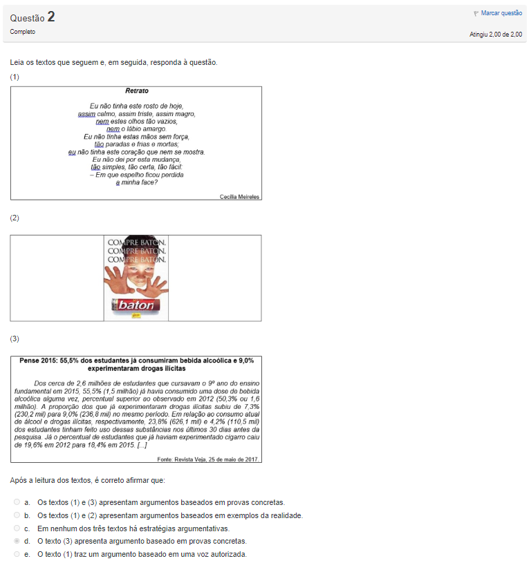<p>Questão 2 Marcar questão Completo Atingiu 2.00 de 2.00 Leia os textos que seguem e em responda à questão. (1) Retrato Eu não tinha este rosto de assim calmo, assim assim nem estes olhos tão vazios, nem lábio Eu não tinha estas mãos sem força, tão paradas e frias eu não tinha este coração que nem se mostra Eu não dei por esta tão tão tão Em que espelho ficou perdida a minha face? Meireles (2) COMPRE BATON baton (3) Pense 2015: 55,5% dos estudantes já consumiram bebida alcoólica e 9.0% experimentaram drogas Dos cerca de 2.6 milhões de estudantes que cursavam go ano do ensino fundamental em 2015 55.5% (1.5 milhão) havia consumido uma dose de bebida alcoólica alguma percentual superior 80 observado em 2012 ou 1.6 A proporção dos que já experimentaram drogas ilicitas subiu de 7.3% mil) para 9.0% (236,8 mil) no mesmo Em relação ao consumo atual de álcool e drogas 23.8% (626,1 mil) e 4.2% mil) dos estudantes tinham feito uso dessas substâncias nos 30 dias antes da Já percentual de estudantes que já haviam experimentado cigarro calu de 19.6% em 2012 para 18.4% em 2015 Fonte Revista Veja 25 de maio de 2017 Após a leitura dos é correto afirmar que: a Os textos (1) e (3) apresentam argumentos baseados em provas Os textos (1) e (2) apresentam argumentos baseados em exemplos da Em nenhum dos três textos há estratégias d. texto (3) apresenta argumento baseado em provas texto (1) traz um argumento baseado em uma voz</p>