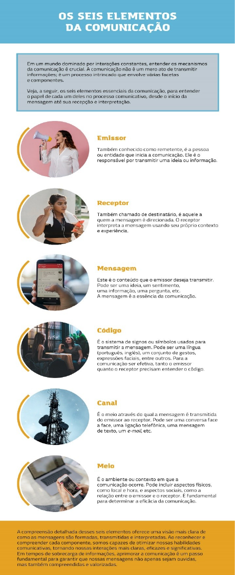 <p>Teoria da comunicação: elementos da comunicação</p><p>O referente situacional engloba os elementos da situação do emissor, do receptor e do contexto em que se dá a comunicação. Por exemplo: � Venha aqui em casa e traga teus cadernos para estudarmos. O termo “aqui” se refere à situação espacial, e “venha e traga”, à temporal. O uso das palavras que mostram (pronomes demonstrativos, pronomes pessoais, tempos verbais, etc.) proporciona às línguas naturais uma grande agilidade. No entanto, as frases que veiculam esses elementos só podem ser compreendidas em estreita relação com determinadas situações. Já o referente textual engloba os elementos do contexto linguístico. Ou seja, ele surge quando se faz referência aos elementos contidos no próprio texto. Por exemplo: � A garota trouxe os lápis, a borracha e a régua e os pôs sobre a escrivaninha que está no escritório. � Compre tudo o que consta na lista: tomate, alface, pepino, pimentão e repolho</p><p>Físicas, como um obstáculo entre dois interlocutores que os impede de dialogar. Por exemplo: a queda no sinal de um telefone quando se está conversando via telefonia, ou a queda da internet, quando o diálogo se dá por redes sociais.</p><p>� Culturais, como o desconhecimento do código de comunicação dentro de uma cultura (saber uma língua, por exemplo, nem sempre é garantia suficiente para interpretar adequadamente uma mensagem). Por exemplo, um morador de Portugal e uma pessoa que vive no Brasil podem não se entender, mesmo falando a língua portuguesa. Isso ocorre pois em cada cultura determinados termos significam coisas diferentes, dificultando o entendimento</p><p>. � Pessoais, como a maneira de estar, de ser e de agir de cada sujeito envolvido na relação de comunicação, bem como as capacidades ou deficiências físicas pessoais que facultam ou dificultam a comunicação, etc. Por exemplo: uma pessoa que não sabe a língua de sinais terá dificuldades para conversar com alguém que usa a Libras. �</p><p>Psicossociais, como o estatuto e o papel social que os sujeitos envolvidos na relação comunicacional atribuem uns aos outros. Estes marcam uma dada distância social, ou a saturação dos sujeitos envolvidos na comunicação em relação ao tema que motiva o ato comunicacional. Problemas de relacionamento podem ser um exemplo de barreira causada por questões psicossociais.</p><p>O ruído semântico é a junção da interferência externa e interna. Acontece quando o locutor usa uma linguagem com significado diferente para a plateia. Ou seja, o emissor e o ouvinte têm interpretações distintas do sentido de certas palavras. Os jargões e regionalismos são exemplos disso.</p><p>Ruído Psicológico: Refere-se às interferências psicológicas que ocorrem na mente do receptor, afetando a compreensão da mensagem. Isso pode incluir preconceitos, emoções fortes, distrações mentais ou qualquer estado emocional que influencie a maneira como o destinatário recebe e interpreta a mensagem</p><p>image1.jpeg</p>
