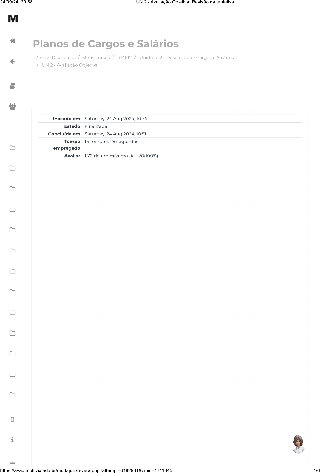 <p>UN 2 - Avaliação Objetiva: Revisão da tentativa 24/09/24, 20:58 M Planos de Cargos e Salários Minhas Disciplinas / Meus cursos / 414612 / Unidade 2 - Descrição de Cargos e Salários / UN 2 - Avaliação Objetiva Iniciado em Saturday, 24 Aug 2024, 10:36 Estado Finalizada Concluída em Saturday, 24 Aug 2024, 10:51 Tempo 14 minutos 25 segundos empregado Avaliar 1,70 de um máximo de 1,70(100%) i 1/6</p><p>24/09/24, 20:58 UN 2 Avaliação Objetiva: Revisão da tentativa Questão 1 M Correto Atingiu 0,34 de 0,34 Sabemos que cargo é a ocupação oficial do empregado. Para determiná-lo, é preciso entender as diversas operações da empresa e estabelecer a necessidade ou objetivo de cada função; dessa forma, consegue-se obter os cargos específicos, podendo classificá-los como JR, PL e SR. profissional pleno (PL) é o que possui maior qualificação, ocupando cargos que exigem conhecimentos específicos. Esse profissional possui muito conhecimento e experiência prática. trabalho apresenta complexidade, exigindo grande habilidade A supervisão é indireta ou até global. Esse profissional tem muita capacitação e experiência. Possui cinco anos ou mais no cargo. PORQUE profissional sênior (SR) desenvolve atividades que exigem conhecimentos com experiência e prática prévias. Recebe uma supervisão mais indireta, mas deve ser acompanhado nas várias fases do desempenho de seu trabalho. Possui conhecimento técnico, sendo avaliado pelo resultado do trabalho exercido. Possui de três a cinco anos de experiência. PORQUE profissional júnior (JR), também conhecido como trainee, é que está no início da carreira, em fase de aprendizado, realizando atividades repetitivas ou rotineiras. Deve ter supervisão direta nas atividades. Possui de zero a dois anos de experiência. A respeito dessas assertivas, assinale a resposta CORRETA. Escolha uma opção: a. As duas primeiras assertivas são verdadeiras, e a terceira é falsa. b. A primeira assertiva é verdadeira, e as duas últimas são falsas. C. As três assertivas são verdadeiras e possuem relação entre si. d. As duas primeiras assertivas são falsas, e a terceira assertiva é verdadeira. e. As três assertivas são falsas. 2/6</p><p>24/09/24, 20:58 UN 2 - Avaliação Objetiva: Revisão da tentativa Questão 2 M Correto Atingiu 0,34 de 0,34 Sabemos que a análise de cargos é muito importante para a empresa, pois ela não se resume apenas aos elementos operacionais, mas abrange também fatores estratégicos que envolvem o cargo e sua importância para a empresa. Uma boa análise de cargos tem vários objetivos importantes, sendo possível encontrar alguns deles nas assertivas abaixo: - Fornecimento de subsídios para o recrutamento e seleção. - Elaboração de material para treinamento. III - Base para avaliação e classificação de cargos. IV - Base para programas de higiene e segurança. V - Avaliação de desempenho. Analise as questões abaixo e assinale a correta, de acordo com os objetivos da análise de cargos: Escolha uma opção: a. As afirmativas I, e III são verdadeiras, e as afirmativas IV e V são falsas. b. Todas as afirmativas são verdadeiras. C. Todas as afirmativas são falsas. d. As afirmativas IV e V são verdadeiras, e as afirmativas I, II e III são falsas. e. As afirmativas I, II e V são verdadeiras, e as afirmativas e IV são falsas. 3/6</p><p>24/09/24, 20:58 UN 2 - Avaliação Objetiva: Revisão da tentativa Questão 3 M Correto Atingiu 0,34 de 0,34 Conforme Chiavenato (2009), os cargos são preenchidos de acordo com as descrições que relacionam as tarefas, deveres e responsabilidades. Essas especificações estabelecem os requisitos necessários a quem ocupará e conteúdo do cargo - que se refere ao papel a desempenhar - definido na descrição. Ressalta-se que, para se descrever um cargo, são necessárias algumas noções fundamentais que o administrador de RH deve saber. Em uma empresa, pode haver vários auxiliares administrativos, auxiliares de limpeza e recepcionistas; porém, cada um deles pode exercer funções diferentes uns dos outros. Em uma empresa, podem existir tantas funções quanto empregados. As informações das descrições dos cargos servem de base para obter os dados que serão utilizados para fins de remuneração, seleção e treinamento. As análises de todos os cargos podem ser feitas da mesma forma. Escolha a sequência que melhor define as afirmações acima, sendo V (verdadeira) ou F (falsa). Escolha uma opção: b. F. i 4/6</p><p>24/09/24, 20:58 UN 2 - Avaliação Objetiva: Revisão da tentativa Questão 4 M Correto Atingiu 0,34 de 0,34 "Um sistema de avaliação de cargos e administração de salários eficiente está no desenvolvimento aprimorado da descrição e especificação dos cargos. As descrições e especificações dos cargos fornecem o alicerce firme para a avaliação dos cargos, da qual resultará a fixação de salários internamente coerentes" (PONTES, 2011). No que se refere ao pagamento de salários, analise as afirmativas abaixo e estabaleça-as como V (verdadeira) ou (falsa): No pagamento mensal, o salário deve ser pago no máximo até quinto dia útil do mês seguinte ao vencido. pagamento do salário poderá ser feito por meio de vales, bônus, ouro, cupons ou outras formas representativas do dinheiro. empregado poderá receber, in natura (utilidade), alimentação, habitação, vestuário, higiene e transporte como parte do seu salário. Essas parcelas podem chegar ao máximo de 70% do salário mínimo. Nas revisões salariais, os empregados que forem admitidos após a data-base terão seus salários corrigidos igualmente aos dos demais empregados. Os salários devem ser pagos seguindo uma periodicidade; por isso, não podem existir modalidades de pagamentos por hora, dia ou semana. Escolha uma opção: C. e. 5/6</p><p>24/09/24, 20:58 UN 2 Avaliação Objetiva: Revisão da tentativa Questão 5 M Correto Atingiu 0,34 de 0,34 Sabemos que t