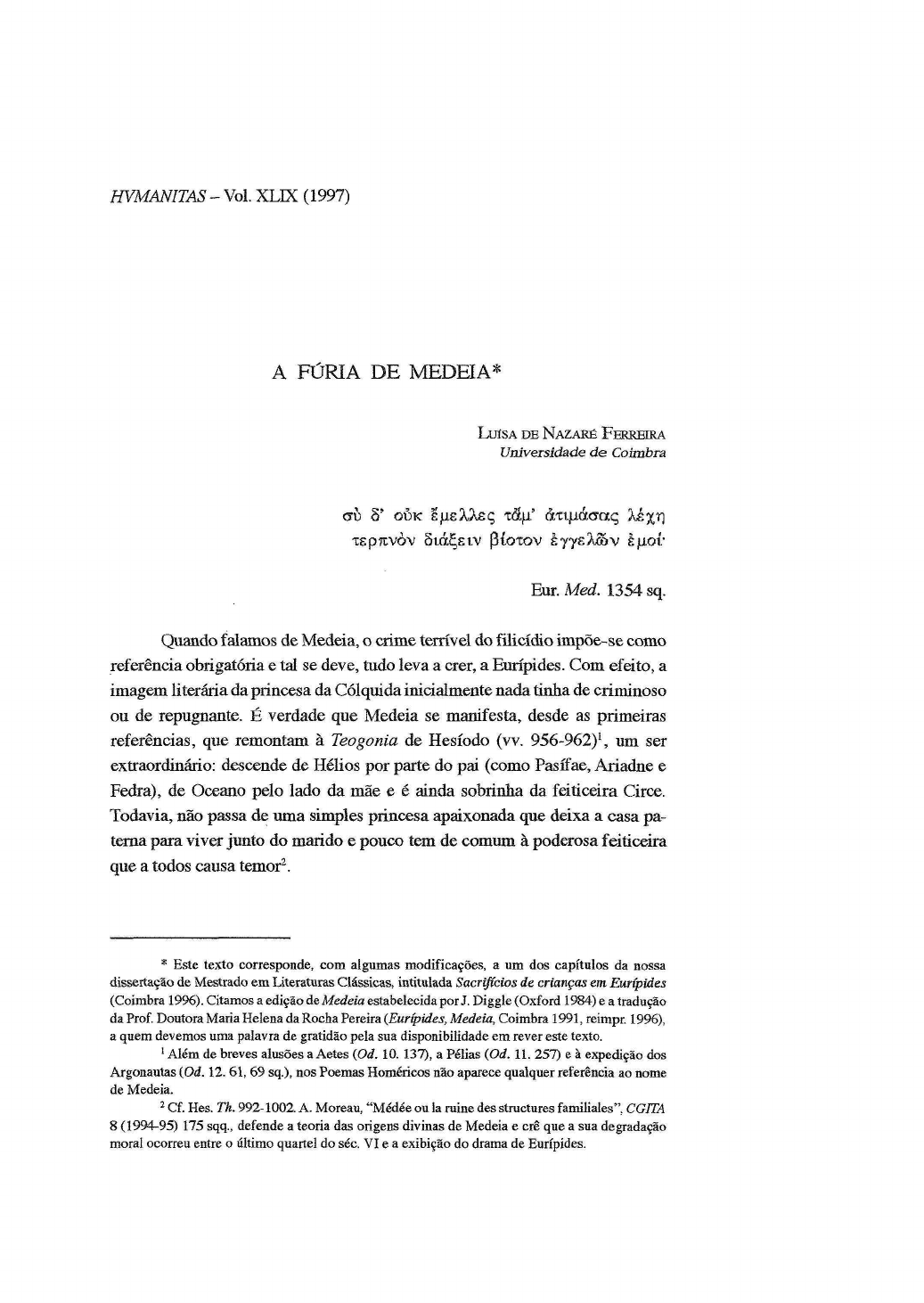 <p>HVMANITAS - Vol. XLDC (1997)</p><p>A FÚRIA DE MEDEIA*</p><p>L U í S A DE N A Z A R é FERREIRA</p><p>Universidade de Coimbra</p><p>σο 5' ουκ έμελλες ταμ' άτιμάσας λέχη</p><p>τερπνόν διάξειν βίοτον έγγελων εμον</p><p>Eur. Med. 1354 sq.</p><p>Quando falamos de Medeia, o crime terrível do filicídio impõe-se como</p><p>referência obrigatória e tal se deve, tudo leva a crer, a Eurípides. Com efeito, a</p><p>imagem literária da princesa da Cólquida inicialmente nada tinha de criminoso</p><p>ou de repugnante. É verdade que Medeia se manifesta, desde as primeiras</p><p>referências, que remontam à Teogonia de Hesíodo (vv. 956-962)1, um ser</p><p>extraordinário: descende de Hélios por parte do pai (como Pasífae, Ariadne e</p><p>Fedra), de Oceano pelo lado da mãe e é ainda sobrinha da feiticeira Circe.</p><p>Todavia, não passa de uma simples princesa apaixonada que deixa a casa pa</p><p>terna para viver junto do marido e pouco tem de comum à poderosa feiticeira</p><p>que a todos causa temor2.</p><p>* Este texto corresponde, com algumas modificações, a um dos capítulos da nossa</p><p>dissertação de Mestrado em Literaturas Clássicas, intitulada Sacrifícios de crianças em Eurípides</p><p>(Coimbra 1996). Citamos a edição de Medeia estabelecida por J. Diggle (Oxford 1984) e a tradução</p><p>da Prof. Doutora Maria Helena da Rocha Pereira (Eurípides, Medeia, Coimbra 1991, reimpr. 1996),</p><p>a quem devemos uma palavra de gratidão pela sua disponibilidade em rever este texto.</p><p>1 Além de breves alusões a Aetes (Od. 10. 137), a Pélias (Od. 11. 257) e à expedição dos</p><p>Argonautas (Od. 12. 61, 69 sq.), nos Poemas Homéricos não aparece qualquer referência ao nome</p><p>de Medeia.</p><p>2 Cf. Hes. Th. 992-1002. A. Moreau, "Médée ou la ruine des structures familiales", CGJTA</p><p>8 (1994-95) 175 sqq., defende a teoria das origens divinas de Medeia e crê que a sua degradação</p><p>moral ocorreu entre o último quartel do séc. VI e a exibição do drama de Eurípides.</p><p>62 LUÍSA DE NAZARÉ FERREIRA</p><p>No que diz respeito à morte dos seus filhos, a tradição literária legou-</p><p>-nos alguns testemunhos que merecem a nossa atenção. De acordo com um</p><p>fragmento do poema épico atribuído a Eumelo, Korinthiaka, preservado num</p><p>escólio a Píndaro3, Hélios, "o filho brilhante de Hipérion", ofereceu a cidade de</p><p>Corinto a Aetes, mas este partiu para a Cólquida e confiou a terra a Bunos até</p><p>que voltasse. Pausânias, na descrição de Corinto, parafraseia aqueles versos e</p><p>acrescenta que os habitantes de Corinto proclamaram Medeia sua rainha. Foi</p><p>assim que Jasão se tornou soberano desta terra4. A seguir, ainda citando Eumelo,</p><p>conta como os príncipes perderam a vida às mãos da própria mãe:</p><p>Μηδείαι δε παΐδας μεν γίνεσθαι, το δε άει τικτόμενον</p><p>κατακρύπτειν αυτό ες το ιερόν φέρουσαν της "Ηρας, κατακρύπτειν</p><p>δε αθανάτους εσεσθαι νομίζουσαν τέλος δε αυτήν τε μαθεΐν ©ς</p><p>ήμαρτήκοι της ελπίδος και αμα υπό του 'Ιάσονος φωραθεΐσαν - ού</p><p>γαρ αυτόν εχειν δεομένηι συγγνώμην, αποπλέοντα <δέ> ες Ίωλκόν</p><p>οΐχεσθαι-, τούτων δε ένεκα άπελθεΐν και Μήδειαν παραδοδσαν</p><p>Σισύφωι την αρχήν.</p><p>Medeia teve filhos e, cada vez que algum nascia, levava-o para o templo</p><p>de Hera, onde o escondia, julgando que, se os escondesse, tornar-se-iam</p><p>imortais. Por fim, compreendeu que não obtinha o que esperava e, ao mesmo</p><p>tempo, foi surpreendida em flagrante por Jasão, que não teve perdão para as</p><p>suas súplicas, mas antes navegou para Iolco e se foi embora; por causa disso,</p><p>Medeia confiou o reino a Sísifo e também partiu.</p><p>Nesta versão épica, o filicídio involuntário é o desfecho infeliz de uma</p><p>prática mágico-religiosa que tem como objectivo conferir a imortalidade às</p><p>crianças. Medeia vê goradas as suas expectativas, no momento em que é</p><p>surpreendida em flagrante por Jasão, que não lhe perdoa, certamente porque os</p><p>filhos acabaram por morrer — só assim se explica a sua ira — embora o relato</p><p>não seja muito claro5.</p><p>3 Aã O. 13. 74 = fr. 2A Davies. Cf. D. L. Page (ed.), Euripides, Medea (Oxford 1938,</p><p>reimpr. 1961) xxii.</p><p>4 Paus. 2.3. 10 sqq. = fr. 3A Davies. Cf. ΣMed. 9: δτι δέ βεβασΐλευκε της Κορίνθου</p><p>ή Μήδεια, Ηίμηλος Ιστορεί καΐ Σιμωνίδης(= Eumel., fr. 3 Β Davies).</p><p>5 Esta narrativa apresenta a estrutura de um tema bastante popular, presente, por exemplo,</p><p>no ritual de imortalizaçao de Demofonte (H. Cer. 226-291; Apollod. 1. 5. 1) e de Aquiles: uma</p><p>A FÚRIA DE MEDEIA 63</p><p>O escólio ao v. 264 de Medeia apresenta duas versões diferentes que</p><p>atribuem a autoria do infanticídio aos Coríntios. Segundo a versão do gramático</p><p>Parmenisco:</p><p>Ταΐς δε Κορινθίαις ού βουλομέναις υπό βαρβάρου και</p><p>φαρμακίδος γυναικός αρχεσθαι αύτηι τε έπιβουλευσαι και τα τέκνα</p><p>αύτης άνελειν, επτά μεν αρσενα, επτά δε θήλεα [...] ταύτα δε</p><p>διωκόμενα καταφυγεΐν εις τό της 'Ακραίας Ήρας ιερόν και έπι τό</p><p>ιερόν καθίσαι. Κορινθίους δε αύτων ουδέ ούτως άπέχεσθαι, αλλ' επί</p><p>του βωμού πάντα ταύτα άποσφάξαι. λοιμού δέ γενομένου είς την</p><p>πόλιν π