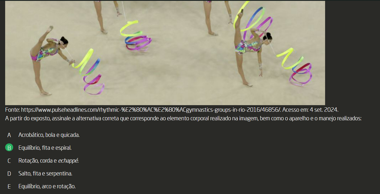 <p>Fonte: Acesso em: 4 set. 2024 A partir do exposto, assinale a alternativa correta que corresponde ao elemento corporal realizado na imagem, bem como aparelho e manejo realizados: A Acrobático, bola e quicada. B Equilíbrio, fita e espiral. Rotação, corda e echappé. D Salto, fita e serpentina. E Equilíbrio, arco e rotação.</p>