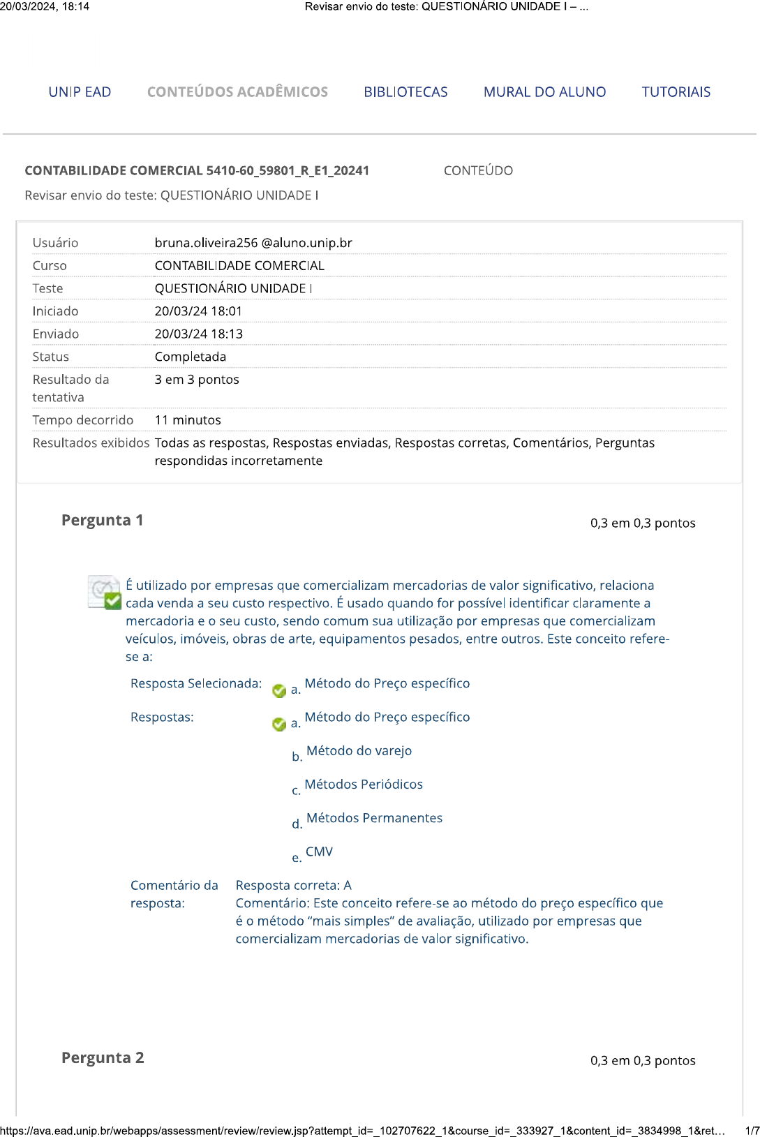 <p>20/03/2024, 18:14 Revisar envio do teste: QUESTIONÁRIO UNIDADE UNIP EAD CONTEÚDOS ACADÊMICOS BIBLIOTECAS MURAL DO ALUNO TUTORIAIS CONTABILIDADE COMERCIAL 5410-60_59801_R_E1_20241 CONTEÚDO Revisar envio do teste: QUESTIONÁRIO UNIDADE Usuário bruna.oliveira256@aluno.unip.br Curso CONTABILIDADE COMERCIAL Teste QUESTIONÁRIO UNIDADE Iniciado 20/03/24 18:01 Enviado 20/03/24 18:13 Status Completada Resultado da 3 em 3 pontos tentativa Tempo decorrido 11 minutos Resultados exibidos Todas as respostas, Respostas enviadas, Respostas corretas, Comentários, Perguntas respondidas incorretamente Pergunta 1 0,3 em 0,3 pontos É utilizado por empresas que comercializam mercadorias de valor significativo, relaciona cada venda a seu custo respectivo. É usado quando for possível identificar claramente a mercadoria e o seu custo, sendo comum sua utilização por empresas que comercializam veículos, imóveis, obras de arte, equipamentos pesados, entre outros. Este conceito refere- se a: Resposta Selecionada: Método do Preço específico a. Respostas: Método do Preço específico a. b. Método do varejo Métodos Periódicos C. Métodos Permanentes d. e. CMV Comentário da Resposta correta: A resposta: Comentário: Este conceito refere-se ao método do preço específico que é o método "mais simples" de avaliação, utilizado por empresas que comercializam mercadorias de valor significativo. Pergunta 2 0,3 em 0,3 pontos 1/7</p><p>20/03/2024, 18:14 Revisar envio do teste: QUESTIONÁRIO UNIDADE - Por esse método de registro da conta Mercadoria, quando a empresa utiliza o inventário periódico, usa-se uma única conta Mercadorias para registrar o estoque inicial debitando a conta Mercadorias; as compras também são lançadas a débito da conta Mercadorias, enquanto as vendas são nela creditadas, este método é considerado uma exceção em toda a contabilidade. Selecione a alternativa correta. Resposta Selecionada: Método Conta mista e. Respostas: Métodos Permanentes a. b. Método do varejo Método do Preço específico C. d. Métodos Periódicos Método Conta mista e. Comentário Resposta correta: E da resposta: Comentário: Pode-se entender que "o controle da conta de mercadorias com método conta mista constitui uma exceção em toda a Contabilidade" uma vez que, conforme será demonstrado a seguir, a conta de Mercadorias ora é classificada como conta patrimonial, ora como de resultado. Pergunta 3 0,3 em 0,3 pontos Utilizando um exemplo de movimentação de mercadorias em que há uma venda líquida de $ 1.000,00; CMV de $ 500,00; despesas operacionais de $ 100,00; outras receitas operacionais de $ 100,00 - responda: qual o resultado a que chegaremos e qual a nomenclatura dada a esse resultado? Resposta Selecionada: b. RLP (Resultado Líquido do Período) de $ 500,00. Respostas: LB (Lucro Bruto) de $ 500,00. a. b. RLP (Resultado Líquido do Período) de $ 500,00. RCM (Resultado com Mercadoria) de $ 400,00. C. d. ROL (Receita Operacional Líquida) de $ 500,00. LB (Lucro Bruto) de $ 600,00. e. Comentário da Resposta correta: B resposta: Comentário: O resultado líquido do período é equivalente ao lucro líquido, ou seja: Vendas líquidas $ 1.000,00 (-) CMV $ 500,00 (=) Lucro bruto $ 500,00 (-) Despesas operacionais $ 100,00 (+) Outras receitas operacionais $ 100,00 (=) Resultado líquido do período $ 500,00 2/7</p><p>20/03/2024, 18:14 Revisar envio do teste: QUESTIONÁRIO UNIDADE - Pergunta 4 0,3 em 0,3 pontos Uma empresa comercial vende suas mercadorias pelo preço de custo, ou seja, por $ 100.000,00. Assinale a alternativa correta: Resposta e. Selecionada: Essa operação é equivalente ao CMV (Custo da Mercadoria Vendida) e o valor de registro, nessa conta, é equivalente ao valor de baixa dos estoques. Respostas: a. Essa operação não altera o RCM (Resultado com Mercadorias). b. Essa operação deverá ser revertida e somada ao RLP (Resultado Líquido do Período). C. Essa operação representa os custos agregados à expectativa de lucro da empresa. d. preço de venda deverá sempre ser superior ao do custo. e. Essa operação é equivalente ao CMV (Custo da Mercadoria Vendida) e o valor de registro, nessa conta, é equivalente ao valor de baixa dos estoques. Comentário Resposta correta: E da resposta: Comentário: Independentemente do método que a empresa utilizará para a apuração dos estoques e dos custos da mercadoria vendida, o valor do CMV é exatamente igual à baixa dessa mercadoria dos estoques, tanto em quantidade como em valores monetários. Pergunta 5 0,3 em 0,3 pontos A apuração do RCM (Resultado com Mercadorias) é feita pela seguinte fórmula: 3/7</p><p>20/03/2024, 18:14 Revisar envio do teste: QUESTIONÁRIO UNIDADE - Resposta Selecionada: RCM =V-CMV d. Respostas: a. b. C. d. e. Comentário da Resposta correta: D resposta: Comentário: O resultado com mercadorias, ou lucro bruto, é obtido aritmeticamente pelas empresas comerciais, subtraindo-se da receita total das vendas de mercadorias o custo pelo qual essas mercadorias foram adquiridas, ou seja: RCM = V CMV. Pergunta 6 0,3 em 0,3 pontos Qual a finalidade de se apurar o RCM (Resultado com Mercadorias)? Resposta C. Selecionada: Demonstrar o resultado obtido com a compra e a venda de mercadorias. Respostas: Identificar o valor correto do estoque final de mercadorias. a. b. Estabelecer a alíquota do imposto do período. C. Demonstrar o resultado obtido com a compra e a venda de mercadorias. d. Implantar uma política de venda. Apresentar sempre um resultado positivo do período. e. Comentário Resposta correta: C da resposta: Comentário: resultado com mercadorias é importante para as empresas comerciais, por representar o resultado principal obtido pela sua atividade, em outras palavras, a partir do RCM ou LB que a empresa saberá se está ganhando ou perdendo com o investimento chamado estoques, se as receitas de vendas não cobrirem o custo de aquisição dessas mercadorias, a empresa não terá condi