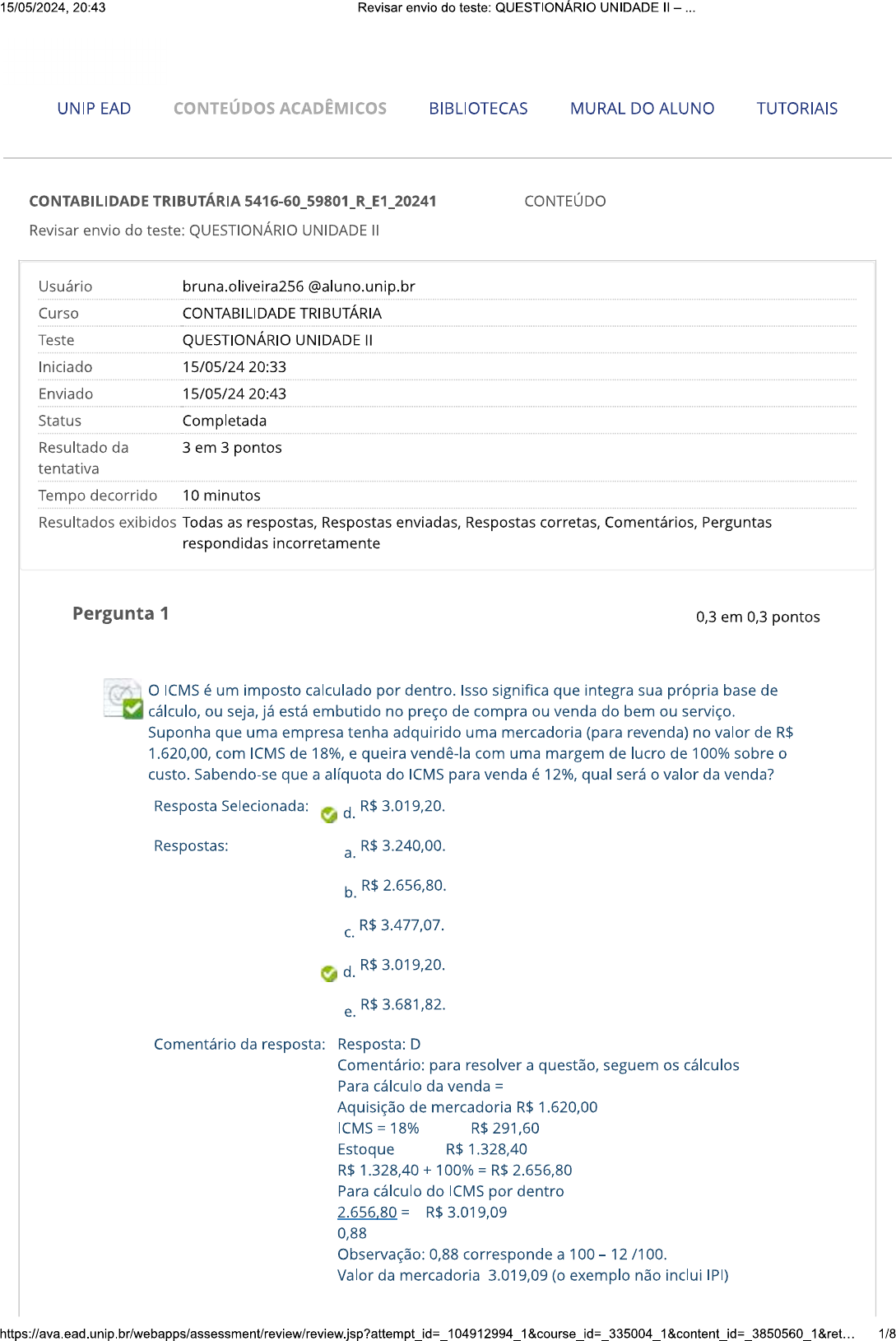 <p>15/05/2024, 20:43 Revisar envio do teste: QUESTIONÁRIO UNIDADE UNIP EAD CONTEÚDOS ACADÊMICOS BIBLIOTECAS MURAL DO ALUNO TUTORIAIS CONTABILIDADE TRIBUTÁRIA 5416-60_59801_R_E1_20241 CONTEÚDO Revisar envio do teste: QUESTIONÁRIO UNIDADE Usuário bruna.oliveira256@aluno.unip.br Curso CONTABILIDADE TRIBUTÁRIA Teste QUESTIONÁRIO UNIDADE Iniciado 15/05/24 20:33 Enviado 15/05/24 20:43 Status Completada Resultado da 3 em 3 pontos tentativa Tempo decorrido 10 minutos Resultados exibidos Todas as respostas, Respostas enviadas, Respostas corretas, Comentários, Perguntas respondidas incorretamente Pergunta 1 0,3 em 0,3 pontos ICMS é um imposto calculado por dentro. Isso significa que integra sua própria base de cálculo, ou seja, já está embutido no preço de compra ou venda do bem ou serviço. Suponha que uma empresa tenha adquirido uma mercadoria (para revenda) no valor de R$ 1.620,00, com ICMS de 18%, e queira vendê-la com uma margem de lucro de 100% sobre o custo. Sabendo-se que a alíquota do ICMS para venda é 12%, qual será o valor da venda? Resposta Selecionada: d. R$ 3.019,20. Respostas: a. R$ 3.240,00. b. R$ 2.656,80. C. d. R$ 3.019,20. e. R$ 3.681,82. Comentário da resposta: Resposta: D Comentário: para resolver a questão, seguem os cálculos Para cálculo da venda = Aquisição de mercadoria R$ 1.620,00 ICMS = 18% R$ 291,60 Estoque R$ 1.328,40 R$ 1.328,40 + 100% = R$ 2.656,80 Para cálculo do ICMS por dentro 2.656,80 = R$ 3.019,09 0,88 Observação: 0,88 corresponde a 100 - 12/100. Valor da mercadoria 3.019,09 (o exemplo não inclui IPI)</p><p>15/05/2024, 20:43 Revisar envio do teste: QUESTIONÁRIO UNIDADE Valor total da NF 3.019,09 Valor do ICMS (12%) 362,29. Pergunta 2 0,3 em 0,3 pontos ICMS é um imposto estadual cuja alíquota interna é fixada pelo governo de cada estado e as alíquotas interestaduais são fixadas pelo Senado Federal. Em relação às alíquotas sobre exportação, pode-se afirmar que também são definidas pelo Senado Federal? Resposta b. Sim, conforme determina a legislação vigente. Selecionada: Respostas: a. Não. Por ser justamente um imposto estadual, é o próprio estado que determina sua alíquota. b. Sim, conforme determina a legislação vigente. Não, exceto sobre os produtos determinados em lei. C. d. Sim, mas somente sobre bens destinados à atividade hospitalar. e. Não, as exportações são isentas de ICMS. Comentário Resposta: B da resposta: Comentário: base de cálculo e alíquotas: alíquota é o percentual definido em lei que, aplicado sobre a base de cálculo, determina o valor total do imposto a ser pago. A alíquota interna do ICMS é estabelecida em cada estado pela legislação estadual, ficando sob a responsabilidade do Senado Federal a fixação das alíquotas interestaduais e de exportação do ICMS. Pergunta 3 0,3 em 0,3 pontos A Cia. Sol Nascente, fabricante de malas para viagem, informa que as vendas, a prazo, ocorridas no mês para a loja Rei das Malas Ltda. foram de R$ 452.370,00, sendo o IPI de 15% (não incluso) e o ICMS de Sabendo que a empresa Cia. Sol Nascente possui ICMS a recuperar no valor de R$ 38.115,78, pode-se afirmar que o ICMS a ser recolhido aos cofres públicos será de: Resposta Selecionada: d. R$ 43.310,82. Respostas: a. R$ 81.426,60. b. R$ 38.115,78. R$ 96.640,59. C. d. R$ 43.310,82. R$ 55.524,81. e. 2/8</p><p>15/05/2024, 20:43 Revisar envio do teste: QUESTIONÁRIO UNIDADE Comentário da Resposta: D resposta: Comentário: o ICMS é um imposto não cumulativo, portanto, o ICMS sobre compras deverá ser recuperado. Seguem os cálculos: Valor do produto R$ 452.370,00 IPI (15%) R$ 67.855,50 Total da nota fiscal R$ 520.225,50 ICMS (18% X 452.370,00) R$ 81.426,60 Apuração do ICMS ICMS sobre vendas a pagar R$ 81.426,60 (-) ICMS a recuperar R$ 38.115,78 (=) ICMS a ser recolhido R$ 43.310,82 Obs.: trata-se de venda para comercialização, portanto, o ICMS incide sobre o valor do produto. Pergunta 4 0,3 em 0,3 pontos A Cia. Caravelas é uma empresa industrial e apurou em um determinado mês vendas para comercialização no valor de R$ 500.000,00, sendo o IPI de 10% (não incluso) e o ICMS de Nessa operação, o valor total dos impostos sobre as vendas equivale a: Resposta Selecionada: R$ 140.000,00. e. Respostas: R$ 100.000,00. a. b. d. R$ 149.000,00. R$ 140.000,00. e. Comentário da Resposta: E resposta: Comentário: o ICMS e o IPI são impostos não cumulativos, portanto, devem ser recuperados. Seguem os cálculos: Valor do produto R$ 500.00,00 IPI (10%) R$ 50.000,00 Total da nota fiscal R$ 550.000,00 ICMS (18% X 500.000,00) R$ 90.000,00 Total dos impostos sobre vendas: IPI R$ 50.000,00 ICMS R$ 90.000,00 Total R$ 140.000,00 Obs.: trata-se de venda para comercialização, portanto, o ICMS incide sobre o valor do produto. Pergunta 5 0,3 em 0,3 pontos 3/8</p><p>15/05/2024, 20:43 Revisar envio do teste: QUESTIONÁRIO UNIDADE O ICMS tem como base legal a Lei Complementar n. 87/96, também conhecida como Lei Kandir. Considerando as disposições contidas nessa Lei Complementar, avalie as afirmações a seguir. - É um imposto não cumulativo, compensando-se o que for devido em cada operação. O IPI não integra a base de cálculo quando a operação, realizada entre contribuintes e relativa a produto destinado à industrialização e comercialização, configurar fato gerador dos dois impostos. III É de competência dos Estados e do Distrito Federal. É correto que se afirma em: Resposta Selecionada: I, e III. e. Respostas: I, apenas. a. b. III, apenas. C. le II. d. e III. e. I, e III. Comentário Resposta: E da resposta: Comentário: a) Trata-se de um imposto não cumulativo, de acordo com o art. 19, da LC. b) Quando as mercadorias forem destinadas à industrialização e à comercialização, o IPI não integra a base de cálculo do ICMS, conforme art. 13, da LC. c) Compete aos Estados e ao Distrito Federal instituir o ICMS, de acordo com o art. 1°, da LC. Pergunta 6 0,3 em 0,3 pontos A Cia. Serra A