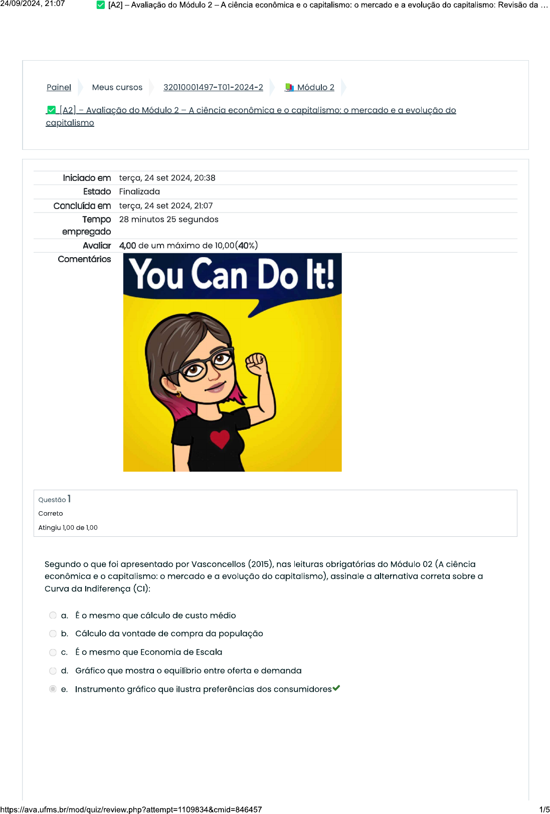 <p>24/09/2024, 21:07 [A2] - Avaliação do Módulo 2 - A ciência econômica e o capitalismo: o mercado e a evolução do capitalismo: Revisão da Painel Meus cursos 32010001497-T01-2024-2 Módulo 2 [A2] Avaliação do Módulo 2 - A ciência econômica e o capitalismo: o mercado e a evolução do capitalismo Iniciado em terça, 24 set 2024, 20:38 Estado Finalizada Concluída em terça, 24 set 2024, 21:07 Tempo 28 minutos 25 segundos empregado 4,00 de um máximo de 10,00(40%) Comentários You Can Do It! Questão 1 Correto Atingiu 1,00 de 1,00 Segundo o que foi apresentado por Vasconcellos (2015), nas leituras obrigatórias do Módulo 02 (A ciência econômica e o capitalismo: o mercado e a evolução do capitalismo), assinale a alternativa correta sobre a Curva da Indiferença (CI): a. É o mesmo que cálculo de custo médio b. Cálculo da vontade de compra da população C. É o mesmo que Economia de Escala d. Gráfico que mostra o equilíbrio entre oferta e demanda e. Instrumento gráfico que ilustra preferências dos consumidores https://ava.ufms.br/mod/quiz/review.php?attempt=1109834&cmid=846457 1/5</p><p>24/09/2024, 21:07 [A2] - Avaliação do Módulo 2 - A ciência econômica e o capitalismo: o mercado e a evolução do capitalismo: Revisão da Questão 2 Incorreto Atingiu 0,00 de 1,00 Segundo o que foi apresentado por Vasconcellos (2015), no Módulo 02 (A ciência econômica e o capitalismo: o mercado e a evolução do capitalismo), assinale a alternativa que contém os julgamentos corretos (verdadeiro ou falso), das afirmações a seguir, sobre restrição orçamentária e linha de preços: Restrição orçamentária é o quanto de renda se encontra disponível ao consumidor, em um dado momento ( ) Restrição orçamentária é o mesmo que reta orçamentária ( ) Linha de preços é o mesmo que reta orçamentária Linha de preços é o mesmo que restrição orçamentária a. V; F; V: F b. F; F; V; V C. V; V; V; F d. V; F x e. V; F; F; V Questão 3 Incorreto Atingiu 0,00 de 1,00 Segundo o que foi apresentado por Vasconcellos (2015), nas leituras obrigatórias do Módulo 02 (A ciência econômica e o capitalismo: o mercado e a evolução do capitalismo), a alternativa que contém os julgamentos corretos (verdadeiro ou falso), das afirmações a seguir, sobre lucro: ( ) Lucro contábil = receito total menos custos contábeis ( ) que passar do lucro contábil é chamado de lucro econômico ou lucro extraordinário ( ) Lucro normal é o custo de oportunidade do capital que é incluído nos custos totais Lucro econômico ou extraordinário é a receita total menos os custos totais a. V; F; F; V b. V; V; F; x C. V; F; F; F d. V; V; V; F e. V; F; V; V 2/5</p><p>24/09/2024, 21:07 [A2] - Avaliação do Módulo 2 A ciência econômica e o capitalismo: o mercado e a evolução do capitalismo: Revisão da Questão 4 Correto Atingiu 1,00 de 1,00 Segundo que foi apresentado por Vasconcellos (2015), no Módulo 02 (A ciência econômica e o capitalismo: o mercado e a evolução do capitalismo), sobre a Lei Geral da Demanda, assinale a alternativa correta: a. Não é estudada dentro da Microeconomia b. Diz que a quantidade ofertada de um bem/serviço possui relação inversa com seu preço, coeteris paribus. C. Diz que a quantidade demandada de um bem/serviço possui relação inversa com seu preço, coeteris paribus. d. Diz que a quantidade demandada de um bem/serviço possui relação direta com seu preço, coeteris paribus. e. É estudada na Macroeconomia Questão 5 Correto Atingiu 1,00 de 1,00 Com base na vídeo disponibilizada no módulo 2 (Incentivos, funcionamento dos mercados e efeito de impostos), assinale a alternativa correta sobre o conceito de "Curva de Demanda": a. Representação gráfica da renda das pessoas em relação ao seu poder de compra b. Representação gráfica da quantidade necessária de bens para a produção de um único item C. Representação gráfica da quantidade produzida d. Representação gráfica dos limites de produção de uma determinada economia e. Representação gráfica de uma demanda, mostrando a relação entre preço e quantidade Questão 6 Incorreto Atingiu 0,00 de 1,00 Segundo que foi apresentado por Vasconcellos (2015), nas leituras obrigatórias do Módulo 02 (A ciência econômica e o capitalismo: o mercado e a evolução do capitalismo), a alternativa correta sobre a teoria neoclássica: a. Na teoria neoclássica o objetivo da firma é minimizar o lucro total b. Segundo a teoria neoclássica, o objetivo da firma é maximizar o lucro total C. Na teoria neoclássica o objetivo da firma é minimizar o lucro marginal d. Na teoria neoclássica o objetivo da firma é maximizar o lucro marginal e. Segundo a teoria neoclássica, o objetivo da firma é maximizar os custos fixos https://ava.ufms.br/mod/quiz/review.php?attempt=1109834&cmid=846457 3/5</p><p>24/09/2024. 21:07 [A2] - Avaliação do Módulo 2 A ciência econômica e o capitalismo: o mercado e a evolução do capitalismo: Revisão da Questão 7 Incorreto Atingiu 0,00 de 1,00 Quais são os exemplos de bens complementares, a partir das leituras de Vasconcellos (2015): a. e Carros b. Alimentos e celulares x C. Combustível e d. Computadores e combustível e. Carros e combustível Questão 8 Incorreto Atingiu 0,00 de 1,00 Segundo o que foi apresentado por Vasconcellos (2015), nas leituras obrigatórias do Módulo 02 (A ciência econômica e o capitalismo: o mercado e a evolução do capitalismo), assinale a alternativa que contém os julgamentos corretos (verdadeiro ou falso), das afirmações a seguir, sobre Receita média e Receita Marginal: ( ) Receita Média: receita adicional, ou alteração na receita total, em razão da variação na quantidade vendida ( ) Receita Marginal: receita unitária. ( ) A Receita Média: receita unitária ( ) Receita Marginal: receita adicional, ou alteração na receita total, em razão da variação na quantidade vendida a. V; V; V; F b. V; V; F; FX C. F; F; V; V