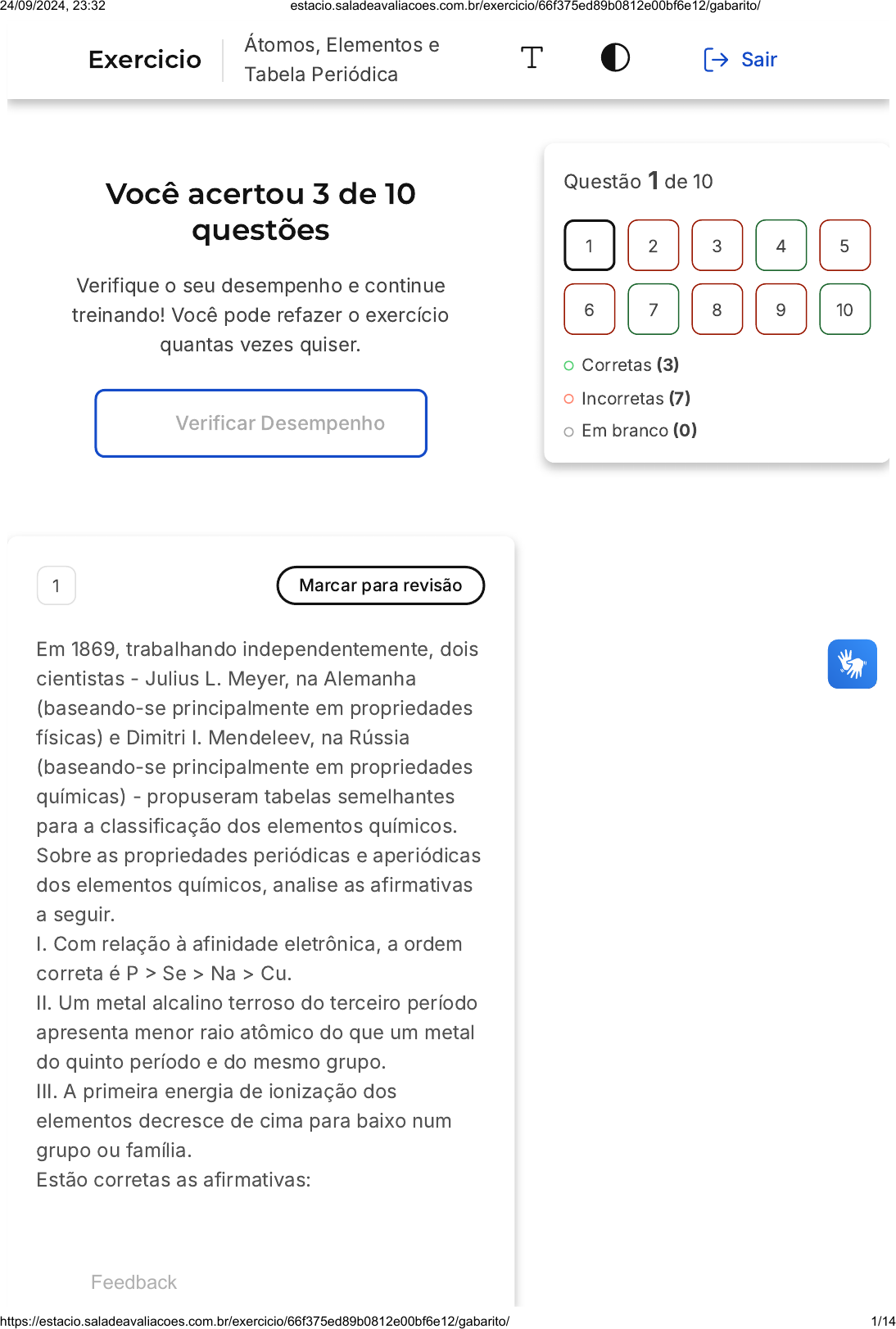 <p>Você acertou 3 de 10</p><p>questões</p><p>Verifique o seu desempenho e continue</p><p>treinando! Você pode refazer o exercício</p><p>quantas vezes quiser.</p><p>Verificar Desempenho</p><p>1 Marcar para revisão</p><p>Em 1869, trabalhando independentemente, dois</p><p>cientistas - Julius L. Meyer, na Alemanha</p><p>(baseando-se principalmente em propriedades</p><p>físicas) e Dimitri I. Mendeleev, na Rússia</p><p>(baseando-se principalmente em propriedades</p><p>químicas) - propuseram tabelas semelhantes</p><p>para a classificação dos elementos químicos.</p><p>Sobre as propriedades periódicas e aperiódicas</p><p>dos elementos químicos, analise as afirmativas</p><p>a seguir.</p><p>I. Com relação à afinidade eletrônica, a ordem</p><p>correta é P � Se > Na > Cu.</p><p>II. Um metal alcalino terroso do terceiro período</p><p>apresenta menor raio atômico do que um metal</p><p>do quinto período e do mesmo grupo.</p><p>III. A primeira energia de ionização dos</p><p>elementos decresce de cima para baixo num</p><p>grupo ou família.</p><p>Estão corretas as afirmativas:</p><p>Questão 1 de 10</p><p>Corretas �3�</p><p>Incorretas �7�</p><p>Em branco �0�</p><p>1 2 3 4 5</p><p>6 7 8 9 10</p><p>Feedback</p><p>Exercicio</p><p>Átomos, Elementos e</p><p>Tabela Periódica</p><p>Sair</p><p>24/09/2024, 23:32 estacio.saladeavaliacoes.com.br/exercicio/66f375ed89b0812e00bf6e12/gabarito/</p><p>https://estacio.saladeavaliacoes.com.br/exercicio/66f375ed89b0812e00bf6e12/gabarito/ 1/14</p><p>A</p><p>B</p><p>C</p><p>D</p><p>E</p><p>I, II e III.</p><p>I, apenas.</p><p>I e II, apenas.</p><p>I e III, apenas.</p><p>II e III, apenas.</p><p>Resposta incorreta</p><p>Opa! A alternativa correta é a letra</p><p>E. Confira o gabarito comentado!</p><p>Gabarito Comentado</p><p>As afirmativas II e III estão corretas. A</p><p>afirmativa II está correta porque, de acordo</p><p>com a tabela periódica, um metal alcalino</p><p>terroso do terceiro período realmente</p><p>apresenta um menor raio atômico do que</p><p>um metal do quinto período do mesmo</p><p>grupo. Isso ocorre porque, à medida que</p><p>descemos em um grupo na tabela</p><p>periódica, o número de camadas de</p><p>elétrons aumenta, resultando em um maior</p><p>raio atômico. A afirmativa III também está</p><p>correta, pois a primeira energia de</p><p>ionização dos elementos realmente</p><p>decresce de cima para baixo em um grupo</p><p>ou família. Isso se deve ao fato de que os</p><p>elétrons mais externos estão mais distantes</p><p>do núcleo e, portanto, são menos atraídos</p><p>por ele, tornando mais fácil removê-los. A</p><p>afirmativa I, no entanto, está incorreta. A</p><p>24/09/2024, 23:32 estacio.saladeavaliacoes.com.br/exercicio/66f375ed89b0812e00bf6e12/gabarito/</p><p>https://estacio.saladeavaliacoes.com.br/exercicio/66f375ed89b0812e00bf6e12/gabarito/ 2/14</p><p>A</p><p>B</p><p>C</p><p>D</p><p>E</p><p>ordem correta da afinidade eletrônica é Cu</p><p>> Na > Se > P.</p><p>2 Marcar para revisão</p><p>De acordo com a tabela periódica dos</p><p>elementos químicos, analise as afirmativas:</p><p>I. Em uma mesma família, os elementos</p><p>apresentam o mesmo número de camadas.</p><p>II. Os elementos com configuração geral ns são</p><p>elementos do grupo 1 da tabela periódica.</p><p>III. O elemento será de transição quando o</p><p>subnível mais energético é do tipo s ou p.</p><p>Assinale:</p><p>1</p><p>Apenas o item I está correto.</p><p>Apenas o item II está correto.</p><p>Apenas o item III está correto.</p><p>Apenas os itens I e II estão corretos.</p><p>Apenas os itens I e III estão corretos.</p><p>Resposta incorreta</p><p>Opa! A alternativa correta é a letra</p><p>B. Confira o gabarito comentado!</p><p>Gabarito Comentado</p><p>apenas o item II está correto. Isso se deve</p><p>ao fato de que os elementos com</p><p>24/09/2024, 23:32 estacio.saladeavaliacoes.com.br/exercicio/66f375ed89b0812e00bf6e12/gabarito/</p><p>https://estacio.saladeavaliacoes.com.br/exercicio/66f375ed89b0812e00bf6e12/gabarito/ 3/14</p><p>A</p><p>B</p><p>configuração geral ns realmente</p><p>pertencem ao grupo 1 da tabela periódica.</p><p>No entanto, as afirmativas I e III estão</p><p>incorretas. Na afirmativa I, é importante</p><p>esclarecer que em uma mesma família, os</p><p>elementos não apresentam o mesmo</p><p>número de camadas, mas sim a mesma</p><p>quantidade de elétrons na camada de</p><p>valência. Já a afirmativa III está equivocada</p><p>porque os elementos de transição são</p><p>aqueles cujo subnível mais energético é do</p><p>tipo d ou f, e não s ou p.</p><p>1</p><p>3 Marcar para revisão</p><p>As afirmativas a seguir descrevem estudos</p><p>sobre modelos atômicos, realizados por Niels</p><p>Bohr, John Dalton e Ernest Rutherford.</p><p>. Partículas alfa foram desviadas de seu trajeto,</p><p>devido à repulsão que o núcleo denso e a carga</p><p>positiva do metal exerceram, conhecido como</p><p>sistema solar.</p><p>. Átomos (esferas indivisíveis e permanentes)</p><p>de um elemento são idênticos em todas as suas</p><p>propriedades. Átomos de elementos diferentes</p><p>têm propriedades diferentes.</p><p>. Os elétrons movem-se em órbitas, em torno</p><p>do núcleo, sem perder ou ganhar energia.</p><p>Assinale a alternativa que indica a sequência</p><p>correta do relacionamento desses estudos com</p><p>seus autores.</p><p>Bohr, Rutherford, Dalton</p><p>Rutherford, Bohr, Dalton</p><p>24/09/2024, 23:32 estacio.saladeavaliacoes.com.br/exercicio/66f375ed89b0812e00bf6e12/gabarito/</p><p>https://estacio.saladeavaliacoes.com.br/exercicio/66f375ed89b0812e00bf6e12/gabarito/ 4/14</p><p>C</p><p>D</p><p>E</p><p>Dalton, Bohr, Rutherford</p><p>Rutherford, Dalton, Bohr</p><p>Dalton, Rutherford, Bohr</p><p>Resposta incorreta</p><p>Opa! A alternativa correta é a letra</p><p>D. Confira o gabarito comentado!</p><p>Gabarito Comentado</p><p>No modelo de Rutherford o núcleo seria</p><p>rodeado por uma 