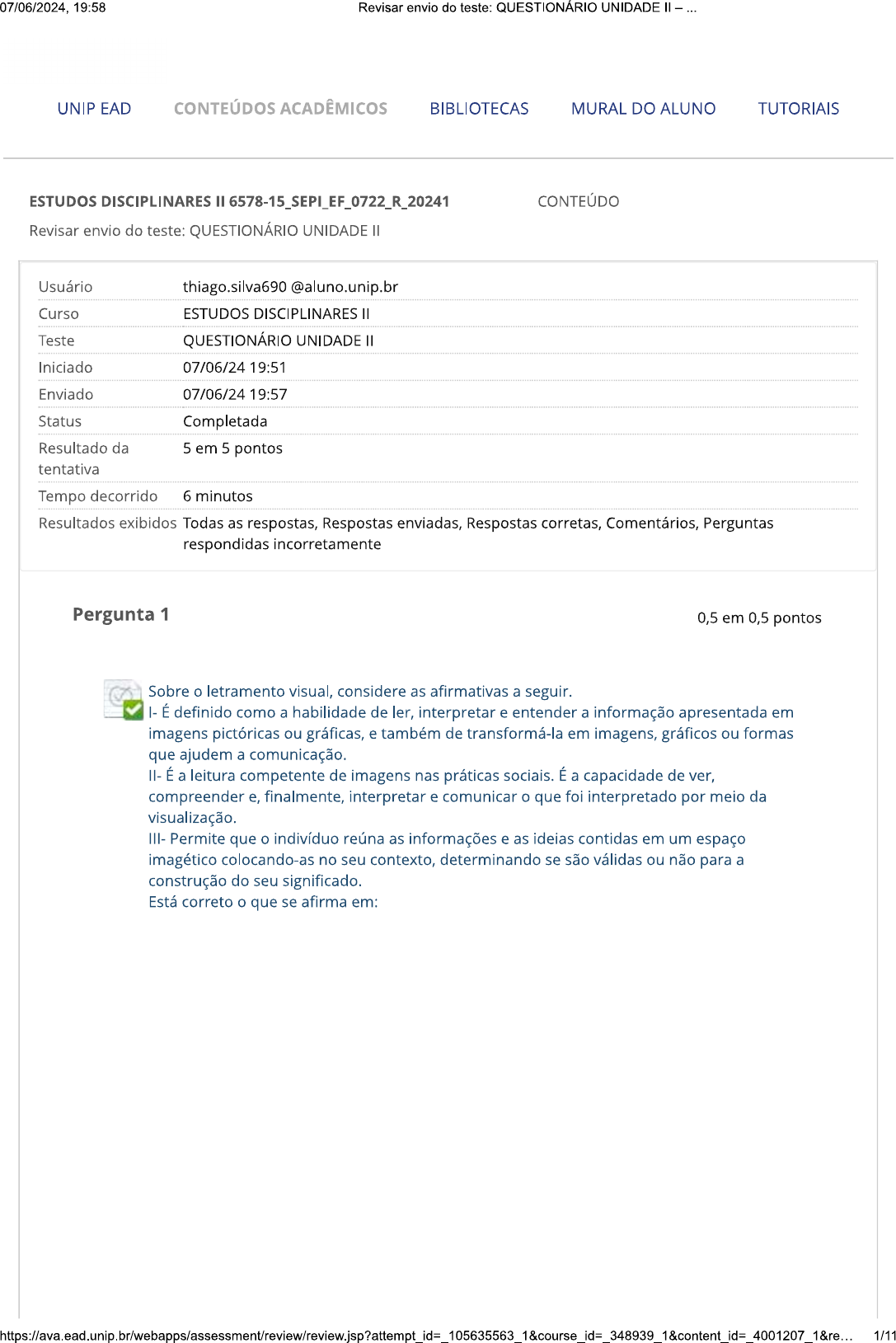 <p>07/06/2024, 19:58 Revisar envio do teste: QUESTIONÁRIO UNIDADE UNIP EAD CONTEÚDOS ACADÊMICOS BIBLIOTECAS MURAL DO ALUNO TUTORIAIS ESTUDOS DISCIPLINARES II 6578-15_SEPI_EF_0722_R_20241 CONTEÚDO Revisar envio do teste: QUESTIONÁRIO UNIDADE Usuário Curso ESTUDOS DISCIPLINARES Teste QUESTIONÁRIO UNIDADE II Iniciado 07/06/24 19:51 Enviado 07/06/24 19:57 Status Completada Resultado da 5 em 5 pontos tentativa Tempo decorrido 6 minutos Resultados exibidos Todas as respostas, Respostas enviadas, Respostas corretas, Comentários, Perguntas respondidas incorretamente Pergunta 1 0,5 em 0,5 pontos Sobre o letramento visual, considere as afirmativas a seguir. I- É definido como a habilidade de ler, interpretar e entender a informação apresentada em imagens pictóricas ou gráficas, e também de transformá-la em imagens, gráficos ou formas que ajudem a comunicação. II- É a leitura competente de imagens nas práticas sociais. É a capacidade de ver, compreender e, finalmente, interpretar e comunicar o que foi interpretado por meio da visualização. III- Permite que o indivíduo reúna as informações e as ideias contidas em um espaço imagético colocando-as no seu contexto, determinando se são válidas ou não para a construção do seu significado. Está correto o que se afirma em: 1/11</p><p>07/06/2024, 19:58 Revisar envio do teste: QUESTIONÁRIO UNIDADE Resposta Selecionada: I, e III. a. Respostas: a. I, e III. I e II. b. I e III. C. d. II e III. I, apenas. e. Comentário Resposta: A da resposta: Comentário: letramento visual consiste na leitura e na produção de textos não verbais e sincréticos, que possuem mais de uma linguagem. Assim, requer do leitor maior sensibilidade em relação à leitura de imagens visuais e para suas categorias, elementos, estruturas, que constituem, convencionalmente, os textos. Afinal, todo texto segue determinados padrões para ser identificado como pintura etc. Pergunta 2 0,5 em 0,5 pontos 2/11</p><p>07/06/2024, 19:58 Revisar envio do teste: QUESTIONÁRIO UNIDADE ... Dadas as imagens a seguir, assinale a alternativa falsa. Kinder Ovo Disponível Acesso em 18 mar. 2018. Disponível em Acesso em 18 mar. 2018. Disponível Acesso em 18 mar. 2018. Resposta b. Selecionada: As imagens visuais (charge, escultura, cena cinematográfica) diferem-se dos textos escritos. Respostas: a. Letramento visual exige habilidade de interpretar a informação visualmente apresentada, baseando-se na premissa de que imagens podem ser lidas e que seu significado pode ser decodificado por meio de um processo de leitura. 3/11</p><p>07/06/2024, 19:58 Revisar envio do teste: QUESTIONÁRIO UNIDADE - b. As imagens visuais (charge, escultura, cena cinematográfica) diferem-se dos textos escritos. C. Multiplicidade de significados dos textos multimodais pauta-se nos contextos sociais. d. Imagens visuais - linguagem e todos os modos semióticos - são socialmente construídas. e. Mudança no desenvolvimento da comunicação visual tem sua própria mensagem, imprimindo um caráter de autonomia em relação ao texto verbal. Comentário da Resposta: B resposta: Comentário: trata-se de uma afirmação falsa, porque charge e outras imagens são consideradas texto e precisam ser lidas como tais. Pergunta 3 0,5 em 0,5 pontos A seguir, temos uma charge. Leia-a e indique a resposta correta. RELAXA. SER FACIL CONVENCER o NOE DE QUE SOMOS UM CASAL DA MESMA Disponível do-noe-kkkkkkkkkkkkkkkkkkkkkkkk.html> Acesso em 18 mar. 2018. Resposta b. Selecionada: O tema da charge é sempre sobre assuntos atualizados, que estão sendo debatidos naquele momento na sociedade. Respostas: a. Charge é um texto com imagens visuais e, por isso, não requer do leitor determinadas habilidades para compreensão textual. b. O tema da charge é sempre sobre assuntos atualizados, que estão sendo debatidos naquele momento na sociedade. 4/11</p><p>07/06/2024, 19:58 Revisar envio do teste: QUESTIONÁRIO UNIDADE - C. A charge trata de imagens visuais que remetem ao texto bíblico, formalizando uma intertextualidade. Para a compreensão do texto chargístico, então, é só necessário o leitor ter conhecimento prévio sobre o episódio da arca de Noé. d. O leitor inteirado com o que se passa no mundo à sua volta não precisa, portanto, fazer inferências para realizar a leitura da charge ou, ainda, buscar complementar a leitura desse texto com a leitura de outros textos. e. A charge é criada para causar efeitos de ironia e humor, sem exigir do leitor conhecimento de situações que não são mencionadas no texto. Comentário da Resposta: B resposta: Comentário: a charge é sempre relacionada a um fato atual, político, exigindo do leitor conhecimentos sobre o assunto. Pergunta 4 0,5 em 0,5 pontos Pelas imagens visuais dos quadros de Tarsila do Amaral, o leitor consegue atribuir um referencial, que pode ser: Disponível em Disponível em <http://noticias.universia.com <http://enciclopedia.itaucultural.org. Disponível em .br/tempo- em <https://www.culturagenial.co livre/noticia/2012/11/12/9812 18 mar. 2018. Acesso em 18 58/conheca-cuca-tarsila-do- mar. 2018. amaral.html> Acesso em 18 mar. 2018. Resposta Selecionada: Brasilidade e imaginário popular. e. Respostas: Religiosidade e espiritualidade. a. b. Dramaticidade e ansiedade. C. Brejeirice e volúpia. d. Potência e força. Brasilidade e imaginário popular. e. Comentário da Resposta: E resposta: Comentário: pelos elementos das três obras, o leitor recupera referências do país e como as pessoas imaginam o Brasil: um país tropical, ensolarado, com natureza rica e variada.</p><p>07/06/2024, 19:58 Revisar envio do teste: QUESTIONÁRIO UNIDADE - Pergunta 5 0,5 em 0,5 pontos Na análise dos dois textos da revista Superinteressante, conclui-se que: Revista Superinteressante. Maio 1988. SUPER Como funcionam os catalisadores dos Revista Julho 2001. Resposta b. Selecionada: Houve mudanças no status da imagem, tornando-a complementar ao verbal. Respostas: O le