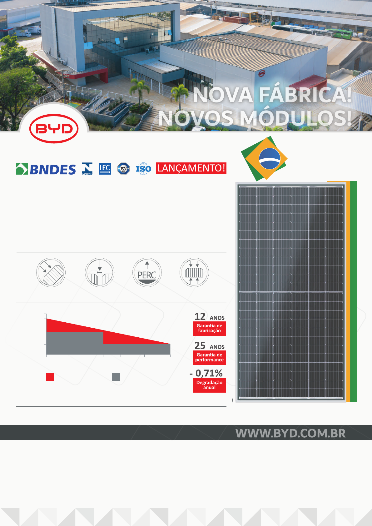<p>NOVOS MÓDULOS!</p><p>NOVA FÁBRICA!</p><p>O módulo fotovoltaico MLK-36 é produzido nacionalmente com tecnologias</p><p>avançadas de micro-gaps, ou seja, com espaçamentos milimétricos, são</p><p>múl�plos barramentos que conectam 144 células mono PERC half-cell de</p><p>22,6% de eficiência, este é um produto single glass. Ideal para situações em</p><p>que é necessário a�ngir maior potência num espaço �sico limitado.</p><p>MONOCRISTALINO PERC, SINGLE GLASS, HALF CELL E MULTI BUSBAR</p><p>FABRICAÇÃO NACIONAL</p><p>IEC 61215-1(ed.1); IEC 61215-1-1(ed.1); IEC 61215-2(ed.1); IEC 61730-1(ed.2); IEC 61730-2(ed.2)</p><p>Cer�ficações:</p><p>BYD MLK-36 MONOFACIAL 520W - 545W</p><p>Mul� busbar Micro-gap Mono PERC Half-cell</p><p>100%</p><p>97%</p><p>80%</p><p>1 5 12 15 20 25Po</p><p>tê</p><p>nc</p><p>ia</p><p>g</p><p>er</p><p>ad</p><p>a</p><p>Garan�a linear BYD Garan�a da indústria</p><p>FABRICAÇÃO</p><p>NACIONAL</p><p>#valorize o produto nacional</p><p>NOSSA ATUAÇÃO NO BRASIL</p><p>A BYD é a principal empresa fabricante de módulos fotovoltaicos no Brasil, a unidade fabril foi fundada em 2017, na cidade</p><p>de Campinas, São Paulo. Com uma forte atuação em inovação e incen�vo à pesquisa, a empresa vêm realizando constantes</p><p>inves�mentos em laboratórios, maquinários, usinas experimentais e especialização e capacitação de equipes de pesquisa e</p><p>desenvolvimento, engenharia, pós-vendas e suporte técnico, todas dedicadas para atender a crescente demanda do setor</p><p>fotovoltaico brasileiro. A BYD acredita no potencial de transição energé�ca do Brasil e cinco anos após a inauguração da</p><p>fábrica, a empresa volta a fazer aportes significa�vos visando o aumento da capacidade produ�va, dando início à</p><p>comercialização da nova geração de módulos fotovoltaicos, mais potentes e eficientes.</p><p>Declaração: Com o desenvolvimento técnico dos produtos, pode haver uma divergência entre os parâmetros técnicos dos produtos futuros da BYD e as especificações técnicas descritas neste</p><p>datasheet. Sendo assim, a BYD reserva o direito de realizar ajustes técnicos neste documento sem aviso prévio aos consumidores. A BYD também reserva o direito final de interpretação. (V:04/06/22)</p><p>BYD MLK-36 MONOFACIAL 520W-545W</p><p>PROPRIEDADES MECÂNICAS</p><p>Tipo de Célula</p><p>Número de Células</p><p>Dimensão do Módulo</p><p>Peso</p><p>Vidro Frontal</p><p>Estrutura de Frame</p><p>Caixa de Junção</p><p>Tamanho do Cabo</p><p>Conector</p><p>182mm*91mm</p><p>144</p><p>2256*1133*35mm</p><p>29kg ± 5%</p><p>3.2mm Vidro Temp. A.R</p><p>Alumínio Anodizado</p><p>IP68 (3 Diodos)</p><p>450mm (4.0mm²)</p><p>Compa�vel Conector MC4</p><p>DADOS ELÉTRICOS (STC*)</p><p>Tipo do Módulo</p><p>Taxa de Máx. Potência (Pmax) [W]</p><p>Tensão de Circuito Aberto (Voc) [V]</p><p>Corrente de Curto Circuito (Isc) [A]</p><p>Tensão de Máx. Potência (Vmp) [V]</p><p>Corrente de Máx. Potência (Imp) [A]</p><p>Eficiência do Módulo [%]</p><p>BYD520MLK-36</p><p>520Wp</p><p>48.52V</p><p>13.37A</p><p>41.17V</p><p>12.64A</p><p>20.13%</p><p>BYD525MLK-36</p><p>525Wp</p><p>48.82V</p><p>13.41A</p><p>41.39V</p><p>12.69A</p><p>20.32%</p><p>BYD530MLK-36</p><p>530Wp</p><p>49.12V</p><p>13.45A</p><p>41.61V</p><p>12.74A</p><p>20.52%</p><p>BYD535MLK-36</p><p>535Wp</p><p>49.42V</p><p>13.49A</p><p>41.83V</p><p>12.79A</p><p>20.71%</p><p>BYD545MLK-36</p><p>545Wp</p><p>50.02V</p><p>13.57A</p><p>42.27V</p><p>12.89A</p><p>21.10%</p><p>BYD540MLK-36</p><p>540Wp</p><p>49.72V</p><p>13.53A</p><p>42.05V</p><p>12.84A</p><p>20.90%</p><p>DADOS ELÉTRICOS (NMOT*)</p><p>Tipo do Módulo</p><p>Potência Máx. (Pmax) [W]</p><p>Tensão de Circuito Aberto (Voc) [V]</p><p>Corrente de Curto Circuito (Isc) [A]</p><p>Tensão de Máx. Potência (Vmp) [V]</p><p>Corrente de Máx. Potência (Imp) [A]</p><p>BYD520MLK-36</p><p>387.6W</p><p>45.4V</p><p>10.80A</p><p>38.0V</p><p>10.21A</p><p>BYD525MLK-36</p><p>391.2W</p><p>45.6V</p><p>10.84A</p><p>38.2V</p><p>10.24</p><p>BYD530MLK-36</p><p>394.8W</p><p>45.9V</p><p>10.87A</p><p>38.4V</p><p>10.27A</p><p>BYD535MLK-36</p><p>398.4W</p><p>46.2V</p><p>10.90A</p><p>38.7V</p><p>10.30A</p><p>BYD545MLK-36</p><p>405.7W</p><p>46.7V</p><p>10.96A</p><p>39.2V</p><p>10.36A</p><p>BYD540MLK-36</p><p>402W</p><p>46.5V</p><p>10.93A</p><p>38.9V</p><p>10.33A</p><p>PARÂMETROS OPERACIONAIS</p><p>Temperatura de Operação [°C]</p><p>Temperatura de Operação da célula</p><p>Tensão Máx. do Sistema [V]</p><p>Corrente Máx. do Fusível [A]</p><p>Proteção contra Incêndios</p><p>Tolerância de Potência</p><p>-40°C ~ +85°C</p><p>45°C ± 2°C</p><p>1500 (VDC)</p><p>25A</p><p>Classe C</p><p>0-5W</p><p>COEFICIENTE DE TEMPERATURA</p><p>Potência Pico</p><p>Tensão de Circuito Aberto</p><p>Corrente de Curto Circuito</p><p>-0.390%/°C</p><p>-0.300%/°C</p><p>+0.060%/°C</p><p>INFORMAÇÕES DE TRANSPORTE</p><p>Tipo de Veículo</p><p>Peças por Pallet</p><p>Pallet por Carreta</p><p>Peças por Carreta</p><p>Carreta 13.5m</p><p>30</p><p>22</p><p>660</p><p>Caixa de</p><p>Junção</p><p>Furo de</p><p>Montagem</p><p>Posi�vo (+)Nega�vo (-)</p><p>I</p><p>II</p><p>40</p><p>0</p><p>99</p><p>0</p><p>14</p><p>00</p><p>A A</p><p>1084</p><p>I</p><p>1:2</p><p>4.5 R</p><p>9</p><p>14</p><p>II</p><p>3.5-R</p><p>7</p><p>10</p><p>10</p><p>2 - ø4.2</p><p>Aterramento</p><p>Símbolo de</p><p>Aterramento</p><p>35</p><p>35</p><p>Selante</p><p>Condições de teste padrão (STC): irradiância de 1000 W/m², espectro AM 1,5 e temperatura da célula de 25°C</p><p>Temperatura nominal do módulo (NMOT): irradiância de 800W/m², espectro AM 1,5 temperatura ambiente 20°C, velocidade do vento 1m/s.</p><p>CURVA I-V</p><p>Curva de Corrente-Tensão (535W)</p><p>Voltagem [V]</p><p>Corrente [A]</p><p>1000W/m²</p><p>800W/m²</p><p>600W/m²</p><p>400W/m²</p><p>200W/m²</p><p>535.3W</p><p>428.5W</p><p>320.7W</p><p>212.2W</p><p>103.9W</p><p>14</p><p>12</p><p>10</p><p>8</p><p>6<