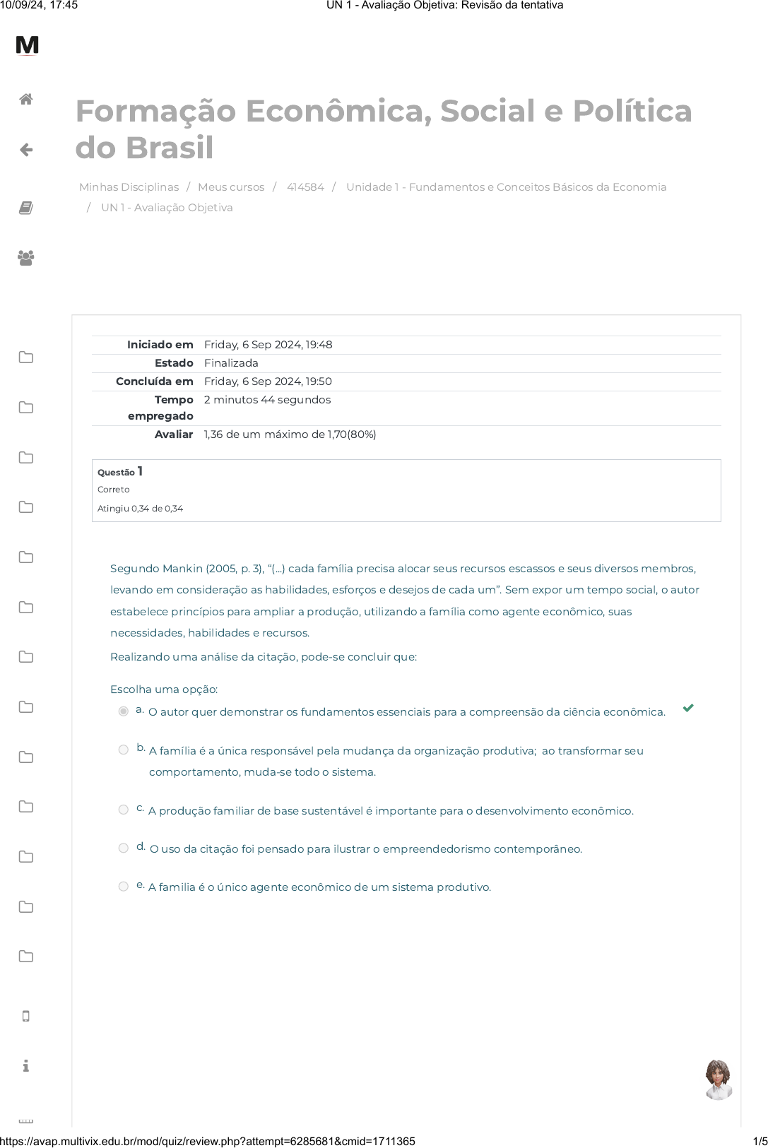 <p>Minhas Disciplinas / Meus cursos / 414584 / Unidade 1 - Fundamentos e Conceitos Básicos da Economia</p><p>/ UN 1 - Avaliação Objetiva</p><p>Formação Econômica, Social e Política</p><p>do Brasil</p><p>Iniciado em Friday, 6 Sep 2024, 19:48</p><p>Estado Finalizada</p><p>Concluída em Friday, 6 Sep 2024, 19:50</p><p>Tempo</p><p>empregado</p><p>2 minutos 44 segundos</p><p>Avaliar 1,36 de um máximo de 1,70(80%)</p><p>Questão 1</p><p>Correto</p><p>Atingiu 0,34 de 0,34</p><p>Segundo Mankin (2005, p. 3), “(...) cada família precisa alocar seus recursos escassos e seus diversos membros,</p><p>levando em consideração as habilidades, esforços e desejos de cada um”. Sem expor um tempo social, o autor</p><p>estabelece princípios para ampliar a produção, utilizando a família como agente econômico, suas</p><p>necessidades, habilidades e recursos.</p><p>Realizando uma análise da citação, pode-se concluir que:</p><p>Escolha uma opção:</p><p>a. O autor quer demonstrar os fundamentos essenciais para a compreensão da ciência econômica. </p><p>b. A família é a única responsável pela mudança da organização produtiva; ao transformar seu</p><p>comportamento, muda-se todo o sistema.</p><p>c. A produção familiar de base sustentável é importante para o desenvolvimento econômico.</p><p>d. O uso da citação foi pensado para ilustrar o empreendedorismo contemporâneo.</p><p>e. A familia é o único agente econômico de um sistema produtivo.</p><p></p><p></p><p></p><p></p><p></p><p></p><p></p><p></p><p></p><p></p><p></p><p></p><p></p><p></p><p></p><p></p><p></p><p></p><p></p><p></p><p>10/09/24, 17:45 UN 1 - Avaliação Objetiva: Revisão da tentativa</p><p>https://avap.multivix.edu.br/mod/quiz/review.php?attempt=6285681&cmid=1711365 1/5</p><p>https://avap.multivix.edu.br/my/</p><p>https://avap.multivix.edu.br/course/view.php?id=29135</p><p>https://avap.multivix.edu.br/course/view.php?id=29135§ion=2</p><p>https://avap.multivix.edu.br/mod/quiz/view.php?id=1711365</p><p>https://avap.multivix.edu.br/my/</p><p>https://avap.multivix.edu.br/course/view.php?id=29135</p><p>https://avap.multivix.edu.br/user/index.php?id=29135</p><p>https://avap.multivix.edu.br/course/view.php?id=29135§ion=1</p><p>https://avap.multivix.edu.br/course/view.php?id=29135§ion=2</p><p>https://avap.multivix.edu.br/course/view.php?id=29135§ion=3</p><p>https://avap.multivix.edu.br/course/view.php?id=29135§ion=4</p><p>https://avap.multivix.edu.br/course/view.php?id=29135§ion=5</p><p>https://avap.multivix.edu.br/course/view.php?id=29135§ion=6</p><p>https://avap.multivix.edu.br/course/view.php?id=29135§ion=7</p><p>https://avap.multivix.edu.br/course/view.php?id=29135§ion=8</p><p>https://avap.multivix.edu.br/course/view.php?id=29135§ion=9</p><p>https://avap.multivix.edu.br/course/view.php?id=29135§ion=10</p><p>https://avap.multivix.edu.br/course/view.php?id=29135§ion=11</p><p>https://avap.multivix.edu.br/course/view.php?id=29135§ion=12</p><p>https://avap.multivix.edu.br/course/view.php?id=29135§ion=13</p><p>https://avap.multivix.edu.br/hooks/portal/</p><p>https://avap.multivix.edu.br/mod/page/view.php?id=1252%2F%22%20target%3D%22_blank</p><p>https://avap.multivix.edu.br/calendar/view.php/</p><p>https://avap.multivix.edu.br/</p><p>https://avap.multivix.edu.br/</p><p>https://avap.multivix.edu.br/</p><p>https://avap.multivix.edu.br/</p><p>https://avap.multivix.edu.br/</p><p>https://avap.multivix.edu.br/</p><p>Questão 2</p><p>Correto</p><p>Atingiu 0,34 de 0,34</p><p>No campo da economia, quando há escassez, a sociedade deve decidir como alocar e usar os recursos,</p><p>constituindo-se em uma de suas principais razões de ser, pois cabe a ela estudar como melhor alocar os</p><p>recursos limitados aos desejos ilimitados. Dessa forma, conclui-se que a escassez está intimamente</p><p>relacionada com a lei de:</p><p>Escolha uma opção:</p><p>a. Mão invisível.</p><p>b. Monopólio.</p><p>c. Oferta e demanda. </p><p>d. Redução do consumismo.</p><p>e. In�ação.</p><p></p><p></p><p></p><p></p><p></p><p></p><p></p><p></p><p></p><p></p><p></p><p></p><p></p><p></p><p></p><p></p><p></p><p></p><p></p><p></p><p>10/09/24, 17:45 UN 1 - Avaliação Objetiva: Revisão da tentativa</p><p>https://avap.multivix.edu.br/mod/quiz/review.php?attempt=6285681&cmid=1711365 2/5</p><p>https://avap.multivix.edu.br/my/</p><p>https://avap.multivix.edu.br/course/view.php?id=29135</p><p>https://avap.multivix.edu.br/user/index.php?id=29135</p><p>https://avap.multivix.edu.br/course/view.php?id=29135§ion=1</p><p>https://avap.multivix.edu.br/course/view.php?id=29135§ion=2</p><p>https://avap.multivix.edu.br/course/view.php?id=29135§ion=3</p><p>https://avap.multivix.edu.br/course/view.php?id=29135§ion=4</p><p>https://avap.multivix.edu.br/course/view.php?id=29135§ion=5</p><p>https://avap.multivix.edu.br/course/view.php?id=29135§ion=6</p><p>https://avap.multivix.edu.br/course/view.php?id=29135§ion=7</p><p>https://avap.multivix.edu.br/course/view.php?id=29135§ion=8</p><p>https://avap.multivix.edu.br/course/view.php?id=29135§ion=9</p><p>https://avap.multivix.edu.br/course/view.php?id=29135§ion=10</p><p>https://avap.multivix.edu.br/course/view.php?id=29135§ion=11</p><p>https://avap.multivix.edu.br/course/view.php?id=29135§ion=12</p><p>https://avap.multivix.edu.br/course/view.php?id=29135§ion=13</p><p>https://avap.multivix.edu.br/hooks/portal/</p><p>https://avap.multivix.edu.br/mod/page/view.php?id=1252%2F%22%20target%3D%22_blank</p><p>https://avap.multivix.edu.br/calendar/view.php/</p><p>https://avap.multivix.edu.br/</p><p>https://avap.multivix.edu.br/</p><p>https://avap.multivix.edu.br/</p><p>https://avap.multivix.edu.br/</p><p>https://avap.multivix.edu.br/</p><p>https://avap.multivix.edu.br/</p><p>Questão 3</p><p>Incorreto</p><p>Atingiu 0,00 de 0,34</p><p>Adam Smith é considerado o pai da economia moderna, sendo o mais importante teórico do liberalismo. No</p><p>seu principal livro, A riqueza das nações, o autor busca in