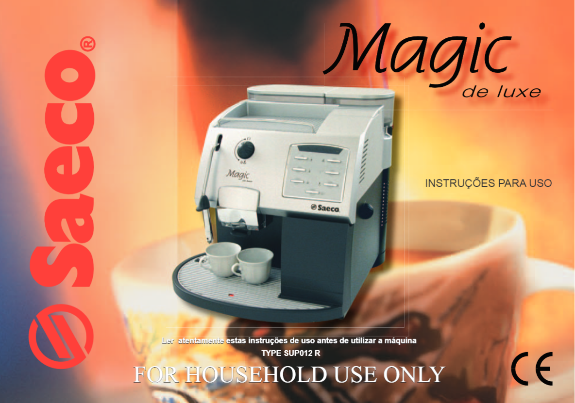 <p>Magic de luxe Magic INSTRUÇÕES PARA USO Saeca Ler atentamente estas instruções de uso antes de utilizar a máquina TYPE SUP012 R FOR HOUSEHOLD USE ONLY CE</p><p>2 PRECAUÇÕES IMPORTANTES CUIDADOS Quando se usam é aconselhável tomar algumas precauções para A máquina expresso foi unicamente para USO doméstico: Qualquer limitar 0 risco de incêndios, choques eléctricos e/ou acidentes. intervenção de assistência, com excepção das operações de limpeza e de manutanção 1 Ler atentamente todas a instruções e informações apresentadas neste manual e normal deverá ser prestada por um centro de assistência autorizado. Não mergulhar em qualquer outro folheto contido nas embalagens, antes de preparar OU utilizar a máquina em água. Qualquer reparação deverá ser efctuada unicamente por pessoal a máquina expresso. do centro de assistência autorizado. 2 Não tocar nas superfícies quentes. 3 Não mergulhar 0 fio, a ficha OU 0 corpo da máquina em água outro líquido, 1 Verificar se a voltagem indicada na placa técnica corresponde à sua. para evitar incêndios, choques eléctricos OU 2 Nunca utilizar água OU quente para encher 0 reservatório de água. Utilizar 4 Ter particular cuidado ao utilizar a máquina expresso na presença de crianças. unicamente água 5 Retirar a ficha da tomada quando a máquina não estiver a ser utilizada, 3 Não tocar com as mãos nas partes quentes da máquina, nem no fio de alimentação durante a sua limpeza. Deixar a máquina arrefecer antes de inserir OU retirar peças durante 0 seu funcionamento. e antes de proceder à sua limpeza. 4 Nunca limpar com detergentes corrosivos, nem com utensílios duros. suficiente 6 Não utilizar a máquina com 0 fio OU a ficha danificados, nem em caso de avarias OU um pano macio humidecido com água. roturas. Mandar verificar OU reparar 0 aparelho no centro de assistência mais próximo. 5 Para evitar a formação de calcário, pode-se utilizar água mineral natural. 7 A utilização de acessórios não aconselhados pelo fabricante pode provocar danos a coisas e pessoas. INSTRUÇOS SOBRE 0 CABO ELETRICO 8 Não utilizar a máquina expresso ao 9 Evitar que 0 fio pendurado da mesa OU esteja em contacto com superfícies quentes. 10 Manter a expresso longe de fontes de calor. A 0 cabo eletrico fornecido é curto para facilitar 0 USO e para impedir que prenda-se 11 Verificar se a máquina expresso está na posição "Off" antes de inserir a ficha na em outros objetos. tomada. Para a desligar, colocá-la no "Off" e retirar depois a ficha da tomada. B Podem ser utilizados prolongamentos mas prestando muito cuidado. Se utilizar um prolongamento controlar: 12 Utilizar a máquina unicamente para USO doméstico. 13 Ter muito cuidado durante a utilização do vapor. que a voltagem do prolongamento seja igual à do eletrodomestico. 2 que seja dotado de uma tomada com tres pin com ponto de terra (seja 0 cabo GUARDAR AS PRESENTES do eletrodomestico deste tipo); 3 que 0 cabo não pendure da mesa para não tropecar. INSTRUÇÕES DE USO</p><p>3 GENERALIDADES DADOS TÉCNICOS A máquina de café é indicada para a preparação de café expresso, utilizando Tensão nominal tanto café em grãos como café e possui um dispositivo para o fornecimento Ver etiqueta colocada no aparelho de vapor e de água quente. Potência nominal corpo da máquina, com design elegante, foi projetado para o uso doméstico e Ver etiqueta colocada no aparelho não é indicado para um funcionamento contínuo de tipo Material do corpo Metal Atenção. Não se assumem responsabilidades por eventuais danos no caso de: Dimensões X X (mm) utilização errada e não conforme as finalidades previstas; (Versão: Argento) reparações não feitas nos centros de assistência autorizados; 340 X 395 X 410 (Versão: Negro) alteração do cavo de alimentação; Peso (kg) alteração de qualquer componente da máquina; 13 utilização de peças de reposição e de acessórios não originais. Comprimento do cabo (mm) 1200 Nesses casos a garantia perde a sua validade. Painel de comandos Frontal (Digital) Depósito de água FACILITAR A LEITURA 2,4 Extraível triângulo de advertência indica todas as instruções importantes Alimentação ! para a segurança do usuário. Seguir cuidadosamente essas indi- Ver etiqueta colocada no aparelho cações para evitar ferimentos graves! Capacidade do recipiente de café (g) 300 de café em grãos Pressão da bomba (bar) 15 Caldeira Uso DESTAS INSTRUÇÕES PARA USO Aço Inoxidável Conservar estas instruções para o uso em local seguro e anexá-las à máquina Dispositivos de segurança de café caso uma outra pessoa deva utilizá-la. Para ulteriores informações ou Válvula de segurança da pressão da caldeira no caso de problemas não tratados totalmente ou de maneira insuficiente nas termostato de presentes instruções contatar os Centros de Assistência Autorizados. fabricante reserva-se o direito de realizar modificações na fabricação e exe- cução seguindo o progresso tecnológico. Máquina conforme a Diretiva Européia 89/336/CEE (Decreto legislativo 476 de 04/12/92) relativa à eliminação dos distúrbios</p><p>4 NORMAS DE SEGURANÇA Saeco. CASO DE EMERGÊNCIA PERIGOS Retirar imediatamente o plugue da tomada. aparelho não deve ser usado por crianças e pessoas não informadas em o APARELHO DEVE SER UTILIZADO EXCLUSIVAMENTE relação ao seu funcionamento. Em local fechado. aparelho é perigoso para crianças. Se não estiver sob vigilância, desativá-lo. Para a preparação de café, água quente, para espumar o leite ou para aquecer Não deixar os materiais utilizados para embalar a máquina ao alcance das bebidas utilizando vapor. crianças. Para o uso doméstico. Não direcionar para si e/ou para outros jato de vapor aquecido e/ou a água Por adultos em condições psicofísicas não alteradas. quente: perigo de queimaduras. Não introduzir objetos nas aberturas do aparelho (Perigo! Corrente elétri