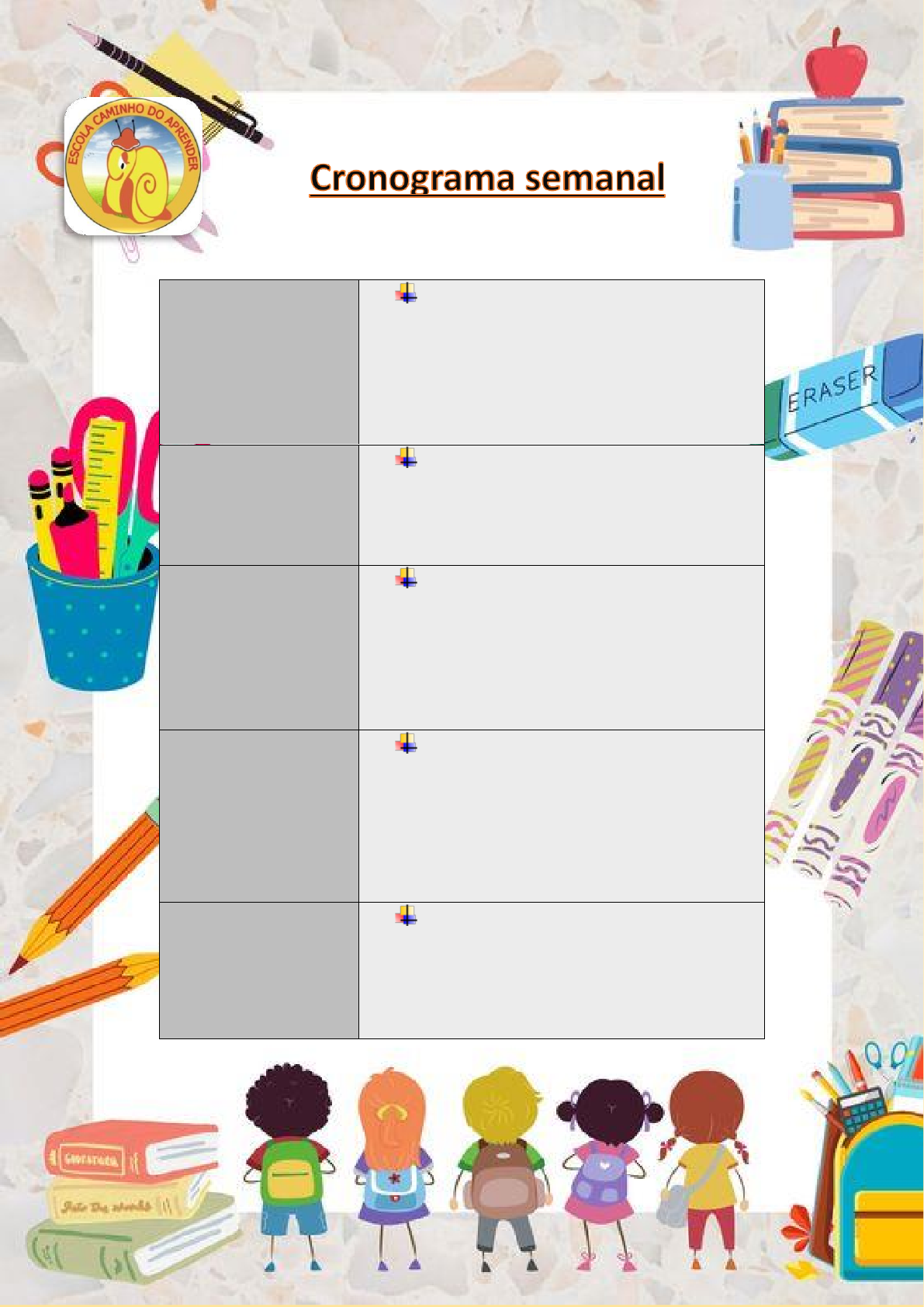 <p>Segunda-feira</p><p>16/09</p><p>Língua portuguesa</p><p>Tipos de frase</p><p>Classe: Língua portuguesa: 16, 17 e</p><p>19 / Caligrafia: 66 e 67.</p><p>Casa: Língua portuguesa: 08, 09,</p><p>10, 11, 12 e 13</p><p>Terça-feira</p><p>17/09</p><p>Matemática</p><p>Divisão de números naturais</p><p>Classe:Matemática:79,81,82, 84 e 85</p><p>Casa: Matemática:70, 71,72, 77 e 78</p><p>Quarta-feira</p><p>18/09</p><p>Geografia</p><p>Meios de transporte</p><p>Classe: Geografia: 190, 191, 192, 193</p><p>e 194/ História: 139</p><p>Casa: Geografia: 182, 183 e 189</p><p>História: 134 e 135</p><p>Quinta-feira</p><p>19/09</p><p>Ciências</p><p>Recursos da natureza</p><p>Classe: Ciências: 248, 249, 251 e 252/</p><p>Caligrafia: 68</p><p>Casa: Ciências:230 ,231, 237, 238,</p><p>239 e 240.</p><p>Sexta-feira</p><p>20/09</p><p>Atividades de reforço</p><p>Classe: Atividades de reforço: 18,19,</p><p>20 e 21</p><p>Casa: Atividades de reforço: 34,35</p><p>e 36</p>