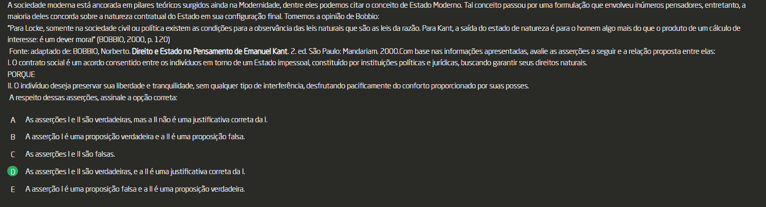 <p>A sociedade moderna está ancorada em pilares teóricos surgidos ainda na conceito passou por uma formulação que envolveu inúmeros pensadores, entretanto, a maioria deles concorda sobre a natureza contratual do Estado em sua configuração final. Tomemos a opinião de Bobbio: "Para Locke, somente na sociedade civil ou política existem as condições para a observância das leis naturais que são as leis da razão. Para Kant, a saída do estado de natureza é para homem algo mais do que produto de um cálculo de interesse: é um dever (BOBBIO, 2000, p. 120) Fonte: adaptado de: BOBBIO, Norberto. Direito e Estado no Pensamento de Emanuel Kant. 2. ed. São Paulo: 2000.Com base nas informações apresentadas, avalie as asserções a seguir e a relação proposta entre elas: contrato social é um acordo consentido entre os indivíduos em torno de um Estado impessoal, constituído por instituições políticas e jurídicas, buscando garantir seus direitos naturais. PORQUE II. indivíduo deseja preservar sua liberdade e tranquilidade, sem qualquer tipo de interferência, desfrutando pacificamente do conforto proporcionado por suas posses. A respeito dessas asserções, assinale a opção correta: A As asserções I e II são verdadeiras, mas a II não é uma justificativa correta da I. B A asserção I é uma proposição verdadeira e a II é uma proposição falsa. As asserções I e são falsas. D As asserções I e são verdadeiras, e a é uma justificativa correta da I. E A asserção I é uma proposição falsa e a II é uma proposição verdadeira.</p>