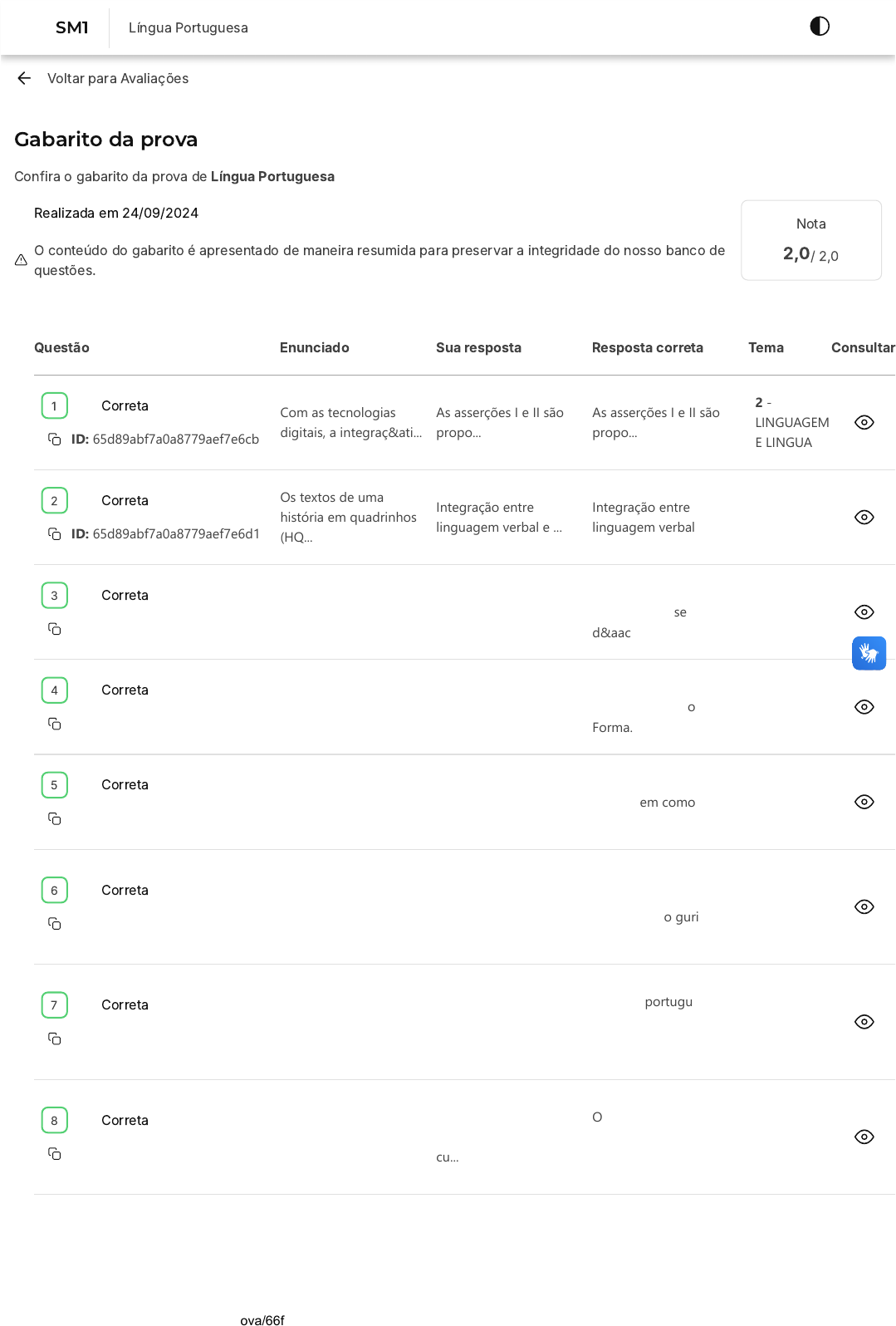 <p>Voltar para Avaliações</p><p>Gabarito da prova</p><p>Confira o gabarito da prova de Língua Portuguesa</p><p>Realizada em 24/09/2024</p><p>O conteúdo do gabarito é apresentado de maneira resumida para preservar a integridade do nosso banco de</p><p>questões.</p><p>Nota</p><p>2,0/ 2,0</p><p>Questão Enunciado Sua resposta Resposta correta Tema Consultar</p><p>Correta</p><p>ID: 65d89abf7a0a8779aef7e6cb</p><p>Com as tecnologias</p><p>digitais, a integraç&ati...</p><p>As asserções I e II são</p><p>propo...</p><p>As asserções I e II são</p><p>propo...</p><p>2 -</p><p>LINGUAGEM</p><p>E LINGUA</p><p>Correta</p><p>ID: 65d89abf7a0a8779aef7e6d1</p><p>Os textos de uma</p><p>história em quadrinhos</p><p>(HQ...</p><p>Integração entre</p><p>linguagem verbal e ...</p><p>Integração entre</p><p>linguagem verbal e ...</p><p>2 -</p><p>LINGUAGEM</p><p>E LINGUA</p><p>Correta</p><p>ID: 65d89abf7a0a8779aef7e6c5</p><p>Ao se fazer a distinção</p><p>entre lingua...</p><p>Muitas vezes a</p><p>comunicação se</p><p>d&aacu...</p><p>Muitas vezes a</p><p>comunicação se</p><p>d&aacu...</p><p>2 -</p><p>LINGUAGEM</p><p>E LINGUA</p><p>Correta</p><p>ID: 65d89abf7a0a8779aef7e695</p><p>(Prefeitura de Campos</p><p>Novos - SC / 2019 -</p><p>Adaptada...</p><p>Na Concepção da</p><p>Linguagem como</p><p>Forma...</p><p>Na Concepção da</p><p>Linguagem como</p><p>Forma...</p><p>2 -</p><p>LINGUAGEM</p><p>E LINGUA</p><p>Correta</p><p>ID: 654be693b5168ccb7467897b</p><p>(Prefeitura de Campos</p><p>Novos - SC / 2019 -</p><p>Adaptada...</p><p>Na Concepção da</p><p>Linguagem como</p><p>Forma...</p><p>Na Concepção da</p><p>Linguagem como</p><p>Forma...</p><p>2 -</p><p>LINGUAGEM</p><p>E LINGUA</p><p>Correta</p><p>ID: 654be509b5168ccb74652241</p><p>Assinale a alternativa</p><p>que apresenta uma</p><p>variação ...</p><p>Os hôme num saíram</p><p>pra percurá o guri.</p><p>Os hôme num saíram</p><p>pra percurá o guri.</p><p>3 - NORMA</p><p>CULTA</p><p>VARIACAO</p><p>LINGUISTICA</p><p>Correta</p><p>ID: 654be6a4b5168ccb746796af</p><p>Considerando as</p><p>situações de uso de</p><p>uma determinad...</p><p>A língua portuguesa</p><p>sofre variações em</p><p>relação às ...</p><p>A língua portuguesa</p><p>sofre variações em</p><p>relação às ...</p><p>3 - NORMA</p><p>CULTA</p><p>VARIACAO</p><p>LINGUISTICA</p><p>Correta</p><p>ID: 654be6a4b5168ccb746796eb</p><p>(CFF / 2017 - Adaptada)</p><p>Analise o texto abaixo e</p><p>m...</p><p>O texto se enquadra</p><p>aos padrões da norma</p><p>cu...</p><p>O texto se enquadra</p><p>aos padrões da norma</p><p>cu...</p><p>3 - NORMA</p><p>CULTA</p><p>VARIACAO</p><p>LINGUISTICA</p><p>1</p><p>2</p><p>3</p><p>4</p><p>5</p><p>6</p><p>7</p><p>8</p><p>Feedback</p><p>SM1 Língua Portuguesa</p><p>24/09/2024, 19:51 estacio.saladeavaliacoes.com.br/prova/66f33c105cb078f9b741fdbb/gabarito/</p><p>https://estacio.saladeavaliacoes.com.br/prova/66f33c105cb078f9b741fdbb/gabarito/ 1/2</p><p>https://estacio.saladeavaliacoes.com.br/avaliacoes/</p><p>Correta</p><p>ID: 654be6a4b5168ccb746796df</p><p>(FUNDEP / 2023) A</p><p>linguagem coloquial é</p><p>uma...</p><p>Onde está o meu livro?</p><p>Ontem o vi na estant...</p><p>Onde está o meu livro?</p><p>Ontem o vi na estant...</p><p>3 - NORMA</p><p>CULTA</p><p>VARIACAO</p><p>LINGUISTICA</p><p>Correta</p><p>ID: 654be6a4b5168ccb746796fd</p><p>Imagine que você</p><p>recebeu de um amigo</p><p>de inf&...</p><p>vai a um piquenique</p><p>engravatado, vestindo</p><p>terno co...</p><p>vai a um piquenique</p><p>engravatado, vestindo</p><p>terno co...</p><p>3 - NORMA</p><p>CULTA</p><p>VARIACAO</p><p>LINGUISTICA</p><p>9</p><p>10</p><p>Encontrou algum problema?</p><p>Você pode copiar o ID da questão, acessar o Campus Virtual �SIA) e abrir um requerimento.</p><p>24/09/2024, 19:51 estacio.saladeavaliacoes.com.br/prova/66f33c105cb078f9b741fdbb/gabarito/</p><p>https://estacio.saladeavaliacoes.com.br/prova/66f33c105cb078f9b741fdbb/gabarito/ 2/2</p>