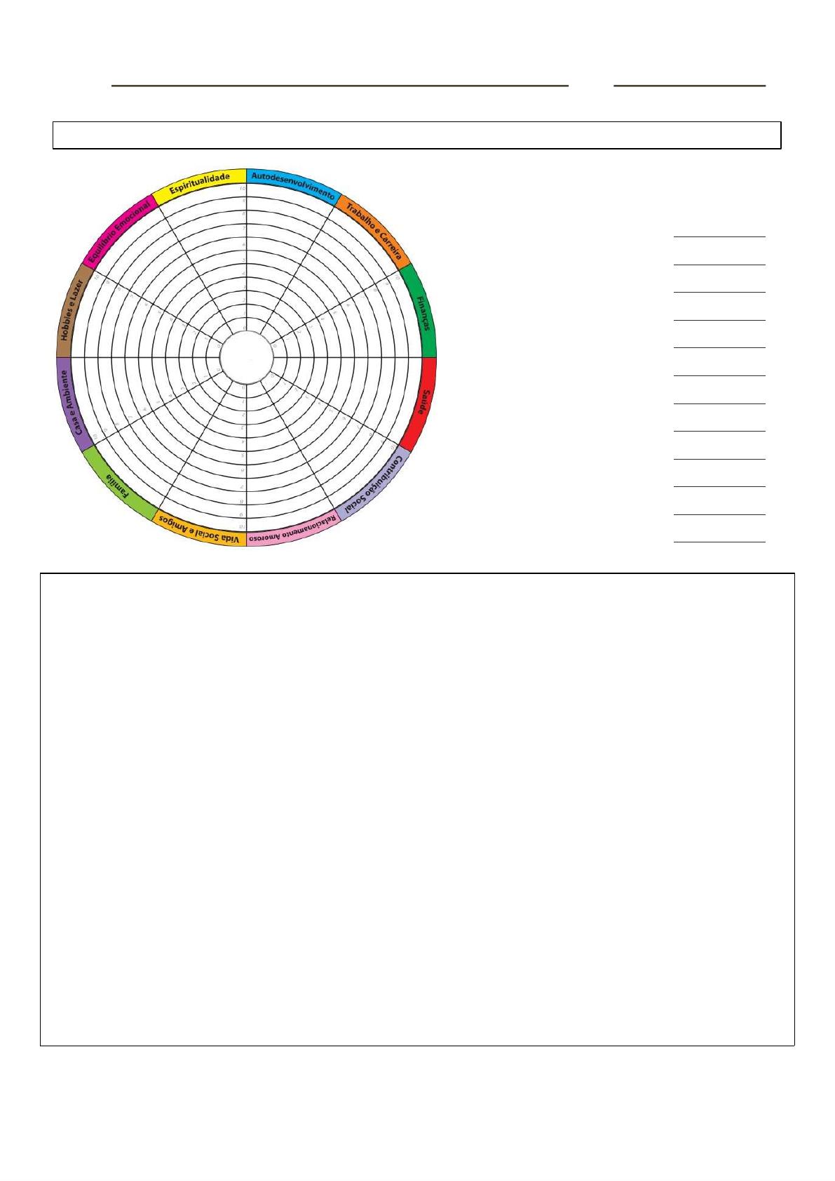 <p>RODA DA VIDA – FERRAMENTA DE AUTOAVALIAÇÃO</p><p>Nome: Data:</p><p>CATEGORIAS</p><p>1. Equilíbrio Emocional</p><p>2. Espiritualidade</p><p>3. Autodesenvolvimento</p><p>4. Trabalho e Carreira</p><p>5. Finanças</p><p>6. Saúde</p><p>7. Contribuição Social</p><p>8. Relacionamento</p><p>Amoroso</p><p>9. Vida Social e Amigos</p><p>10. Família</p><p>11. Casa e Ambiente</p><p>12. Hobbies e Lazer</p><p>PONTUAÇÃO</p><p>1. Equilíbrio Emocional: Considerar como está o seu equilíbrio</p><p>emocional neste último ano. Você tem se sentido bem? Você tem</p><p>sentido mais bem-estar do que mal-estar? Há muitas oscilações?</p><p>2. Espiritualidade: Deve-se avaliar se há paz interior, coerência</p><p>de valores e força interna para suportar as dificuldades sem se</p><p>desequilibrar. Este item pode ou não estar ligada à religiosidade,</p><p>mas se sua religião exerce influência nesses aspectos, a</p><p>espiritualidade terá relação com suas crenças.</p><p>3. Autodesenvolvimento: São atividades realizadas para o</p><p>desenvolvimento intelectual. São os cursos, leituras, estágios,</p><p>enfim, atividades que proporcionam enriquecimento com</p><p>informações que contribuirão para o seu crescimento.</p><p>4. Trabalho e Carreira: Verificar se a atividade profissional é</p><p>interessante e traz satisfação, se o ambiente de trabalho permite</p><p>crescimento, se possui desafios e se oferece oportunidades de</p><p>progresso na carreira.</p><p>5. Finanças: Analisar se o rendimento financeiro é suficiente</p><p>para suprir as suas necessidades de alimentação, vestuário, saúde</p><p>e lazer de forma satisfatória, ou se a vida financeira é motivo de</p><p>estresse e preocupação a ponto de trazer desgaste emocional.</p><p>6. Saúde: Deve-se avaliar como a sua saúde física está sendo</p><p>cuidada. Você tem feito exames periódicos de rotina, e quando</p><p>necessário, submete-se aos tratamentos propostos? Há</p><p>preocupação quanto a quantidade e a qualidade dos alimentos</p><p>ingeridos e, com a prática de exercícios físicos? O controle do peso</p><p>é fundamental para o controle do sobrepeso e para a manutenção</p><p>da saúde e da qualidade de vida.</p><p>7. Contribuição Social: Realização de trabalho voluntário ou</p><p>qualquer atividade que você faz visando a ajuda e o bem-estar de</p><p>outras pessoas que necessitam.</p><p>8. Relacionamento Amoroso: Considerar se o</p><p>vínculo emocional com o parceiro (a) é satisfatório.</p><p>Se há respeito mútuo das diferenças e dificuldades</p><p>individuais e coerência nos atos que impulsionam o</p><p>casal a continuar unido; se as respostas para</p><p>superar as dificuldades presentes na vida a dois</p><p>reforçam os laços afetivos do casal.</p><p>9. Vida Social e Amigos: Como vai sua vida</p><p>social? Você ampliou sua vida social no último</p><p>ano? Você ampliou sua rede de amigos? Você</p><p>ampliou sua rede de relacionamentos?</p><p>10. Família: Avalie seus relacionamentos</p><p>observando se é possível contar com sua família e</p><p>parentes nos bons momentos e também nas</p><p>situações difíceis (e se eles podem contar com</p><p>você também!); se os encontros sociais são</p><p>agradáveis e amistosos, sem grandes fontes de</p><p>tensão; se os eventuais problemas são resolvidos</p><p>com diálogo e boa vontade para “aparar as</p><p>arestas”. Deve-se destacar que este item não inclui</p><p>o relacionamento amoroso.</p><p>11. Casa e Ambiente: Pensar no nível de</p><p>organização de sua casa e ambiente e o quanto</p><p>você está efetivamente contribuindo com esta</p><p>organização. Qual o seu nível de satisfação nesta</p><p>área.</p><p>12. Hobbies e Lazer: É o tempo disponível para</p><p>fazer aquilo que dá prazer. Não entram neste item</p><p>as atividades de trabalho e estudo, por mais que</p><p>tragam satisfação. Esta área se refere a tudo aquilo</p><p>que “recarrega a sua energia”, que relaxa, diverte e</p><p>dá satisfação.</p><p>1. Qual o seu nível de satisfação atual com os resultados de sua vida em</p><p>cada uma das áreas?</p><p>2. Você saberia me dizer aonde você esta e onde você quer chegar?</p><p>3. Que te diz o seu retrato da roda da vida?</p><p>4. Que sente?</p><p>5. Qual área de foco?</p><p>6. Se essa mudança não for gerada, o que vai te custar?</p><p>7. Conseguindo equilibrar essa área de foco. O que vai ganhar?</p><p>8. Você esta dizendo que precisa dar mais foco nesta área. O que você</p><p>pensa em fazer então, ao dizer que essa área precisa de mais foco?</p><p>9. Que você aprendeu com esta experiência? Por que valeu a pena?</p>