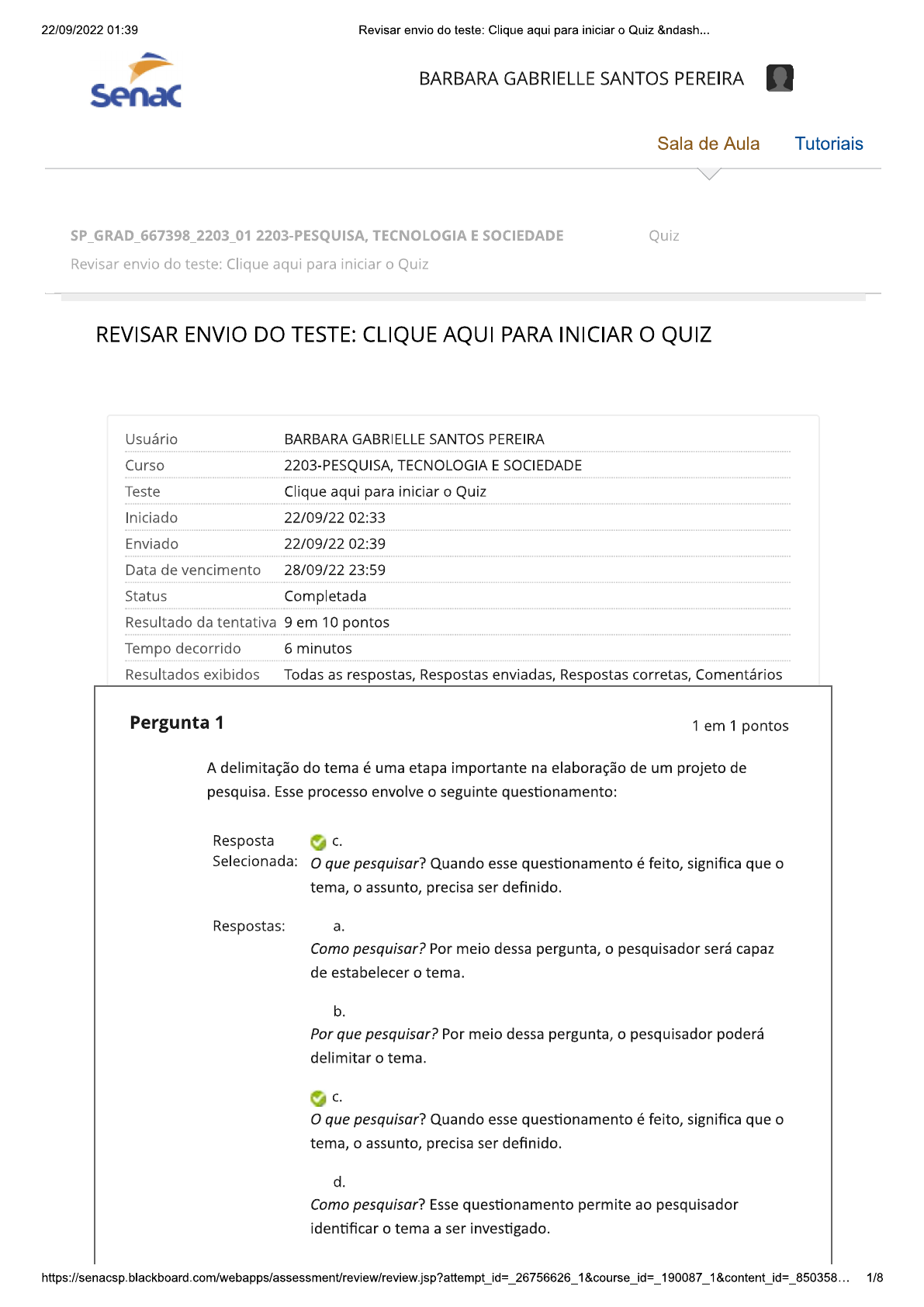 <p>22/09/2022 01:39 Revisar envio do teste: Clique aqui para iniciar o Quiz &ndash... BARBARA GABRIELLE SANTOS PEREIRA Senac Sala de Aula Tutoriais SP_GRAD_667398_2203_01 2203-PESQUISA, TECNOLOGIA E SOCIEDADE Quiz Revisar envio do teste: Clique aqui para iniciar o Quiz REVISAR ENVIO DO TESTE: CLIQUE AQUI PARA INICIAR O QUIZ Usuário BARBARA GABRIELLE SANTOS PEREIRA Curso 2203-PESQUISA, TECNOLOGIA E SOCIEDADE Teste Clique aqui para iniciar o Quiz Iniciado 22/09/22 02:33 Enviado 22/09/22 02:39 Data de vencimento 28/09/22 23:59 Status Completada Resultado da tentativa 9 em 10 pontos Tempo decorrido 6 minutos Resultados exibidos Todas as respostas, Respostas enviadas, Respostas corretas, Comentários Pergunta 1 1 em 1 pontos A delimitação do tema é uma etapa importante na elaboração de um projeto de pesquisa. Esse processo envolve o seguinte questionamento: Resposta C. Selecionada: o que pesquisar? Quando esse questionamento é feito, significa que o tema, o assunto, precisa ser definido. Respostas: a. Como pesquisar? Por meio dessa pergunta, o pesquisador será capaz de estabelecer o tema. b. Por que pesquisar? Por meio dessa pergunta, o pesquisador poderá delimitar o tema. C. que pesquisar? Quando esse questionamento é feito, significa que o tema, o assunto, precisa ser definido. d. Como pesquisar? Esse questionamento permite ao pesquisador identificar o tema a ser investigado. 1/8</p><p>22/09/2022 01:39 Revisar envio do teste: Clique aqui para iniciar o Quiz &ndash... e. Quais são as etapas da investigação? Respondendo a essa pergunta, o pesquisador estabelecerá o tema de sua investigação. Comentário De acordo com os autores citados: "Para que haja a proposição de uma da pesquisa, é necessário que exista um problema a ser investigado. resposta: Assim, a primeira etapa é identificar ou definir um problema" (CASARIN & CASARIN, 2012, p. 51). Pergunta 2 1 em 1 pontos Com o avanço da tecnologia, temos acesso a um número de dados e informações infinitamente maior do que há algumas décadas. No entanto, a velocidade com que uma informação é transmitida pode criar um efeito contrário quando a intenção do emissor não é necessariamente informar o seu receptor sobre algo. Estamos falando sobre um fenômeno contemporâneo denominado: Resposta Selecionada: b. fake news. Respostas: senso comum. a. b. fake news. C. redes sociais. d. tecnologia. teoria da comunicação. e. Comentário termo proveniente do inglês fake (falso) e news (notícias) significa da um tipo de notícia que veicula informações falsas sobre um resposta: determinado assunto. Pergunta 3 1 em 1 pontos No início do século XV, algumas mudanças na estrutura da sociedade provocaram uma alteração considerável no método científico. O início da Idade Moderna marca um período de efervescência cultural e artística, e tudo isso tem a ver com a nova forma de o homem se posicionar no mundo e se relacionar com ele. Diante disso, qual das afirmações a seguir descreve a mudança na forma como o homem se relaciona com o mundo? Resposta b. Selecionada: homem se compreende enquanto sujeito singular dotado de demandas relacionadas aos seus interesses particulares. Respostas: homem se torna observador dos fenômenos da natureza. a. 850358. 2/8</p><p>22/09/2022 01:39 Revisar envio do teste: Clique aqui para iniciar o Quiz &ndash... b. homem se compreende enquanto sujeito singular dotado de demandas relacionadas aos seus interesses particulares. C. homem compreende a sua vida enquanto passagem e preparação para a morte e assume uma postura alinhada aos preceitos religiosos. d. homem se entende enquanto parte de uma coletividade representada pelas determinações da Igreja Católica. e. homem se compreende enquanto sujeito subjugado diante dos fenômenos da natureza. Comentário Esse momento histórico inaugura a ideia do homem como sujeito da singular, como indivíduo dotado de uma racionalidade e demandas resposta: articuladas aos seus interesses particulares. Pergunta 4 1 em 1 pontos Uma das etapas de uma pesquisa científica é a localização e a leitura da base teórica. Durante esse processo, as anotações ou registros são importantes para que o pesquisador não precise retornar o tempo todo ao material completo para localizar uma informação específica. A fim de facilitar esse processo, como estratégia, podemos: Resposta elaborar um fichamento. d. Selecionada: Respostas: elaborar um artigo científico completo. a. b. elaborar anotações ao final da leitura de toda a referência. escolher palavras-chave e anotá-las em uma ficha. C. elaborar um fichamento. d. anotar os dados bibliográficos em fichas. e. Comentário A palavra fichamento vem do verbo fichar, que significa anotar em da fichas alguma coisa. Nesse sentido, a anotação de conceitos, resposta: procedimentos metodológicos ou resultados que dialoguem com a sua proposta de análise em pequenas fichas pode facilitar o seu estudo e a conseguinte produção escrita para divulgação em artigo científico ou trabalho acadêmico. Pergunta 5 0 em 1 pontos 3/8</p><p>22/09/2022 01:39 Revisar envio do teste: Clique aqui para iniciar o Quiz &ndash... Observe a imagem a seguir: Universidade 488.jpg A imagem mostra os três pilares da universidade. De acordo com o que foi estudado, podemos afirmar que as atividades de ensino se referem Resposta às demandas de troca entre a universidade e a comunidade. C. Selecionada: Respostas: ao desenvolvimento de atividades que fomentem a investigação. a. b. às atividades que envolvem o processo de aprendizagem do aluno, desde sua participação em sala de aula até a realização de atividades. às demandas de troca entre a universidade e a comunidade. C. d. à memorização de um conceito para a realização de uma avaliação. e. exclusivamente à realização de avaliações propostas pelos professores. Comentário As atividades de ensino se referem a tudo aquilo que se relaciona à da aprendizagem do a