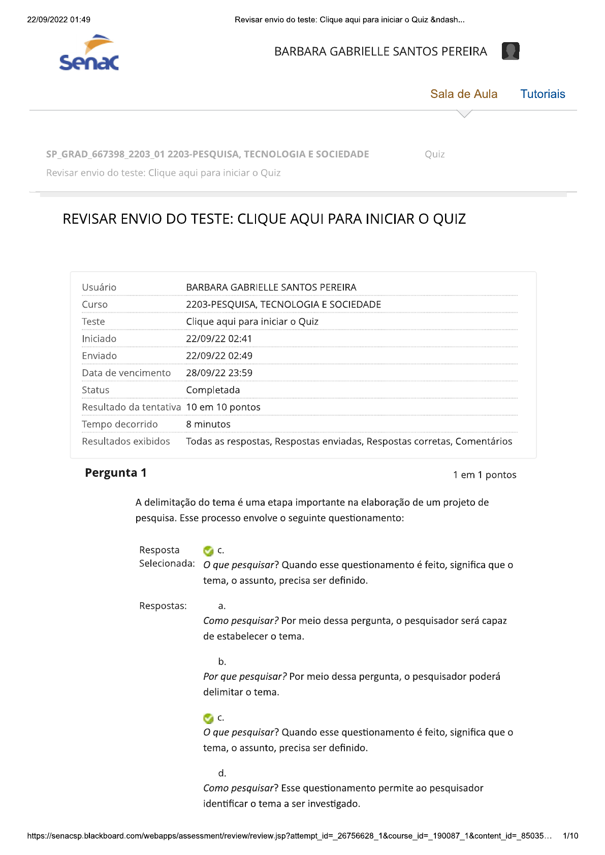 <p>22/09/2022 01:49 Revisar envio do teste: Clique aqui para iniciar o Quiz &ndash... BARBARA GABRIELLE SANTOS PEREIRA Senac Sala de Aula Tutoriais SP_GRAD_667398_2203_01 2203-PESQUISA, TECNOLOGIA E SOCIEDADE Quiz Revisar envio do teste: Clique aqui para iniciar o Quiz REVISAR ENVIO DO TESTE: CLIQUE AQUI PARA INICIAR O QUIZ Usuário BARBARA GABRIELLE SANTOS PEREIRA Curso 2203-PESQUISA, TECNOLOGIA E SOCIEDADE Teste Clique aqui para iniciar o Quiz Iniciado 22/09/22 02:41 Enviado 22/09/22 02:49 Data de vencimento 28/09/22 23:59 Status Completada Resultado da tentativa 10 em 10 pontos Tempo decorrido 8 minutos Resultados exibidos Todas as respostas, Respostas enviadas, Respostas corretas, Comentários Pergunta 1 1 em 1 pontos A delimitação do tema é uma etapa importante na elaboração de um projeto de pesquisa. Esse processo envolve o seguinte questionamento: Resposta C. Selecionada: o que pesquisar? Quando esse questionamento é feito, significa que o tema, o assunto, precisa ser Respostas: a. Como pesquisar? Por meio dessa pergunta, o pesquisador será capaz de estabelecer o tema. b. Por que pesquisar? Por meio dessa pergunta, o pesquisador poderá delimitar o tema. C. que pesquisar? Quando esse questionamento é feito, significa que o tema, o assunto, precisa ser definido. d. Como pesquisar? Esse questionamento permite ao pesquisador identificar o tema a ser investigado.</p><p>22/09/2022 01:49 Revisar envio do teste: Clique aqui para iniciar o Quiz &ndash... e. Quais são as etapas da investigação? Respondendo a essa pergunta, o pesquisador estabelecerá o tema de sua investigação. Comentário De acordo com os autores citados: "Para que haja a proposição de uma da pesquisa, é necessário que exista um problema a ser investigado. resposta: Assim, a primeira etapa é identificar ou definir um problema" (CASARIN & CASARIN, 2012, p. 51). Pergunta 2 1 em 1 pontos Ao participar de um debate sobre os impasses que envolvem a administração das contas públicas, um aluno do curso de Contabilidade decidiu encerrar a conversa dizendo que sua área de estudos não era necessariamente aquela, mas que ele se dedicava apenas às atividades financeiras de empresas privadas. Diante dessa situação, leia atentamente as afirmações a seguir e indique qual delas descreve um dos grandes desafios da ciência na atualidade. Resposta C. Selecionada: Um dos grandes desafios da ciência na atualidade se refere à superação do entendimento do saber de maneira compartimentada e desconexa; precisamos compreender a complexidade do conhecimento, superando as limitações impostas pela divisão do saber em disciplinas. Respostas: a. Um grande desafio se refere à necessidade de aprofundamento do conteúdo ensinado em cada área. b. Para o aperfeiçoamento da produção de conhecimento, um dos grandes desafios tem a ver com a maneira como os indivíduos se compreendem dentro do espaço acadêmico; é preciso que eles se limitem à mediação do professor para aprender. C. Um dos grandes desafios da ciência na atualidade se refere à superação do entendimento do saber de maneira compartimentada e desconexa; precisamos compreender a complexidade do conhecimento, superando as limitações impostas pela divisão do saber em disciplinas. d. Um dos grandes desafios se refere à falta de concorrência, pois somente assim os estudantes serão levados a refletir e a produzir conhecimento dentro da academia. e. 2/10</p><p>22/09/2022 01:49 Revisar envio do teste: Clique aqui para iniciar o Quiz &ndash... Atualmente, não temos grandes desafios, pois a ciência se encontra consolidada, promovendo apenas avanços e conquistas para a humanidade. Comentário Precisamos transgredir as fronteiras simbólicas e históricas da da fragmentação do saber em disciplinas. Os profissionais hoje em dia se resposta: tornam cada vez mais especializados e essa hiperespecialização se transforma em um impasse quando enxergamos tão-somente uma parcela do problema, sem articulá-lo a uma perspectiva mais abrangente. Pergunta 3 1 em 1 pontos Quando elaboramos um texto acadêmico, precisamos recorrer a um referencial teórico sólido para embasar nossa análise. De acordo com a ABNT, uma forma de citar o texto de algum teórico, sem incorrer em plágio, é: Resposta Selecionada: utilizar aspas, indicando ao final, entre parênteses, o sobrenome do autor, o ano de publicação da obra e a página de onde a citação foi retirada. Respostas: utilizar aspas, indicando ao final, entre parênteses, o sobrenome do autor, o ano de publicação da obra e a página de onde a citação foi retirada. b. copiar o texto do autor e mencionar, caso seja solicitado, a fonte ao final do texto, apenas nas referências. C. informar para o orientador a utilização da fonte, sem necessidade de apontar no corpo do texto. d. copiar o texto do autor e mencionar, no início do artigo, o nome da obra. utilizar aspas quando a citação ocupar mais de uma página. e. Comentário De acordo com a ABNT, ao recorrer ao texto de um outro autor, é da imprescindível atribuir os créditos a ele, utilizando a citação. No caso resposta: da citação direta curta, precisamos utilizar aspas e, ao final da transcrição, fazer a devida referência. Pergunta 4 1 em 1 pontos A teoria serve como base para a produção científica. Ao investigar um objeto, é importante contar com um acervo que dê respaldo às ideias defendidas. No momento 3/10</p><p>22/09/2022 01:49 Revisar envio do teste: Clique aqui para iniciar o Quiz &ndash... de elaborar o projeto de pesquisa, algumas escolhas teóricas precisam ser feitas. Entre as alternativas a seguir, qual apresenta os elementos teóricos de uma investigação? Resposta a. Selecionada: A escolha de um tema, o reconhecimento de um problema relacionado a esse tema, a definição dos objetivos da pesquisa, a elaboração de uma justificativa e o levantamento prévio de hipóteses. Respostas: a. A escolha de um tema, o reconhecime