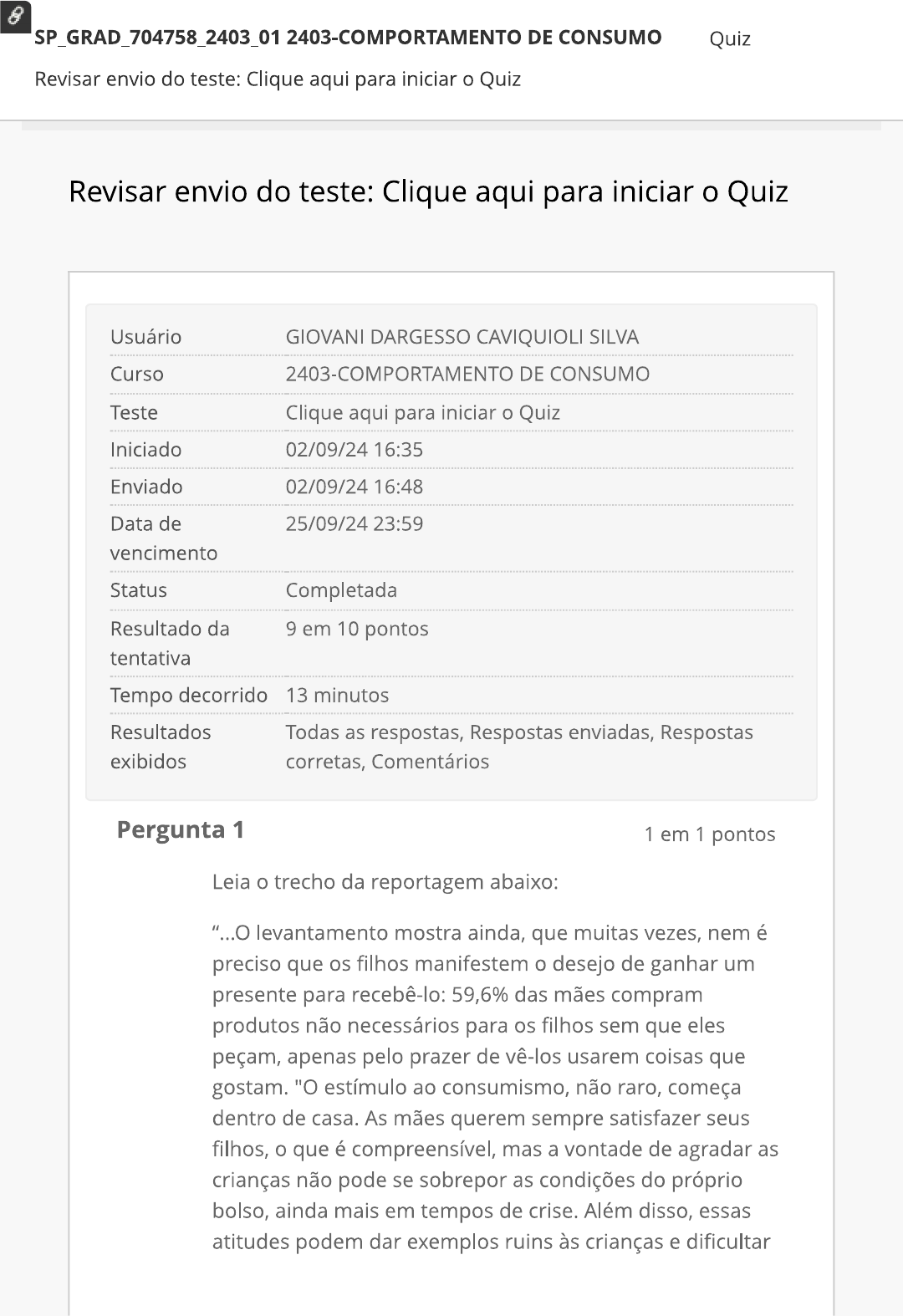 <p>SP_GRAD_704758_2403_01 2403-COMPORTAMENTO DE CONSUMO Quiz Revisar envio do teste: Clique aqui para iniciar Quiz Revisar envio do teste: Clique aqui para iniciar o Quiz Usuário GIOVANI DARGESSO CAVIQUIOLI SILVA Curso 2403-COMPORTAMENTO DE CONSUMO Teste Clique aqui para iniciar o Quiz Iniciado 02/09/24 16:35 Enviado 02/09/24 16:48 Data de 25/09/24 23:59 vencimento Status Completada Resultado da 9 em 10 pontos tentativa Tempo decorrido 13 minutos Resultados Todas as respostas, Respostas enviadas, Respostas exibidos corretas, Comentários Pergunta 1 1 em 1 pontos Leia trecho da reportagem abaixo: "...O levantamento mostra ainda, que muitas vezes, nem é preciso que os filhos manifestem o desejo de ganhar um presente para recebê-lo: 59,6% das mães compram produtos não necessários para os filhos sem que eles peçam, apenas pelo prazer de vê-los usarem coisas que gostam. "O estímulo ao consumismo, não raro, começa dentro de casa. As mães querem sempre satisfazer seus filhos, o que é compreensível, mas a vontade de agradar as crianças não pode se sobrepor as condições do próprio bolso, ainda mais em tempos de crise. Além disso, essas atitudes podem dar exemplos ruins às crianças e dificultar</p><p>um eventual ajuste financeiro quando necessário", afirma a economista-chefe do SPC Brasil, Marcela Kawauti." 6 em cada 10 mães cedem à vontade dos filhos na hora das compras. CDL Aracajú, 2015. Disponível em: ade-dos-filhos-na-hora-das-compras. Acesso em 30/09/2021. De acordo com o conceito das pessoas envolvidas no processo de compra do capítulo 02, a criança exerce que papel, em sua maioria, no consumo da família? Resposta Selecionada: d. Iniciador Respostas: Comprador a. b. Decisor Financiador C. d. Iniciador e. Terceirizado Comentário da A resposta correta é a D. O iniciador é a resposta: pessoa que sente uma necessidade e a intenção de satisfazê-la. É ela quem dá a ideia e o primeiro passo para a compra. Pergunta 2 1 em 1 pontos Leia o trecho da reportagem abaixo: "...Com a ascensão dos influenciadores digitais surgem mais oportunidade para as marcas, mas também exigências do público para a construção de uma narrativa coerente. Nem todo mundo quer ver apenas a vida ideal do influenciador, mas também saber seus valores e propósitos. Foi de olho nesse comportamento do consumidor que a Nestlé iniciou uma parceria com a agência Fizz para produzir marketing de influência para 21 marcas, incluindo as do segmento health and science.."</p><p>Nestlé aposta em influenciadores com mais de 50 anos e melhora resultados. Portal Exame, 2021. Disponível em: https://exame.com/marketing/nestle-aposta-em-influenciad em 30/09/2021. De acordo com o conceito a matriz de conteúdo apresentada no capítulo 03 uso de influenciadores, na abordagem de marketing de conteúdo, é mais comumente usados para: Resposta Selecionada: b. Inspirar Respostas: Reposicionar a. b. Inspirar Racionalizar C. d. Gameficar e. Entreter Comentário A resposta correta é a letra B. Usualmente os da resposta: influenciadores servem como inspiração dos consumidores sendo um importante passo para convence-los do consumo, principalmente quando são vistos como "críveis" pelo público. Pergunta 3 1 em 1 pontos Das afirmações a seguir, qual se relaciona com o objetivo do conceito de omnichannel? Resposta C. Selecionada: Alcançar os consumidores onde quer que estejam, em qualquer dispositivo que estejam usando. Respostas: a. Fazer com que o consumidor se emocione e consuma por impulso.</p><p>b. Tornar o WhatsApp o canal preferido do cliente para que facilite a comunicação. C. Alcançar os consumidores onde quer que estejam, em qualquer dispositivo que estejam usando. d. Gerar vendas adicionais por meio de vendas cruzadas. e. Criar um relacionamento de longo prazo com o consumidor por meio de programa de fidelidade omni. Comentário A resposta correta é a C. da resposta: Uma das premissas na hora de criar um processo de experiência de consumo omnichannel é "alcançar os consumidores onde quer que estejam, em qualquer dispositivo que estejam usando" estreitando a relação com o eles, ou seja, sem tornar a experiência fragmentada entre o meio digital e meio físico. Pergunta 4 1 em 1 pontos Qual dos mercados B2B a seguir representa o grupo formado por "não produzem ou transformam diretamente os produtos, mas viabilizam a revenda de produtos já acabados". Resposta Selecionada: b. Mercado de revendedor. Respostas: Mercado consumidor. a. b. Mercado de revendedor. C. Mercado de produtor. d. Mercado governamental. Mercado institucional. e.</p><p>Comentário A alternativa correta é a B. da resposta: O mercado de revendedor não produz ou transforma diretamente os produtos, mas viabiliza a revenda de produtos já acabados. Compõe-se de intermediários, como atacadistas e varejistas, que compram produtos acabados e os revendem com lucro (por exemplo, supermercados e concessionárias de veículos). Pergunta 5 1 em 1 pontos Como é denominada a técnica de mapeamento da jornada do consumidor com estas características: "O mapa é dividido em 4 quadrantes: diz, pensa, sente, faz e mostra a perspectiva do usuário em relação às tarefas relacionadas ao produto"? Resposta Selecionada: b. Mapa da empatia. Respostas: Mapa do pensamento. a. b. Mapa da empatia. Mapa cloroplético. C. d. Mapa da jornada. e. Mapa do processo decisório. Comentário A resposta correta é a B. da resposta: Conforme visto no capítulo, o mapa da empatia é uma ferramenta usada para articular o que sabemos sobre determinado tipo de usuário. O mapa é dividido em quatro quadrantes: diz, pensa, sente, faz e mostra a perspectiva do usuário em relação às tarefas relacionadas ao produto. Pergunta 6 1 em 1 pontos Leia o trecho a seguir:</p><p>"O modelo omnicanal adotado pela CVC dá a liberdade de o cliente nos contatar por onde ele preferir", destaca o executivo. A CVC opera no modelo de franquias e o objetivo é que todas 