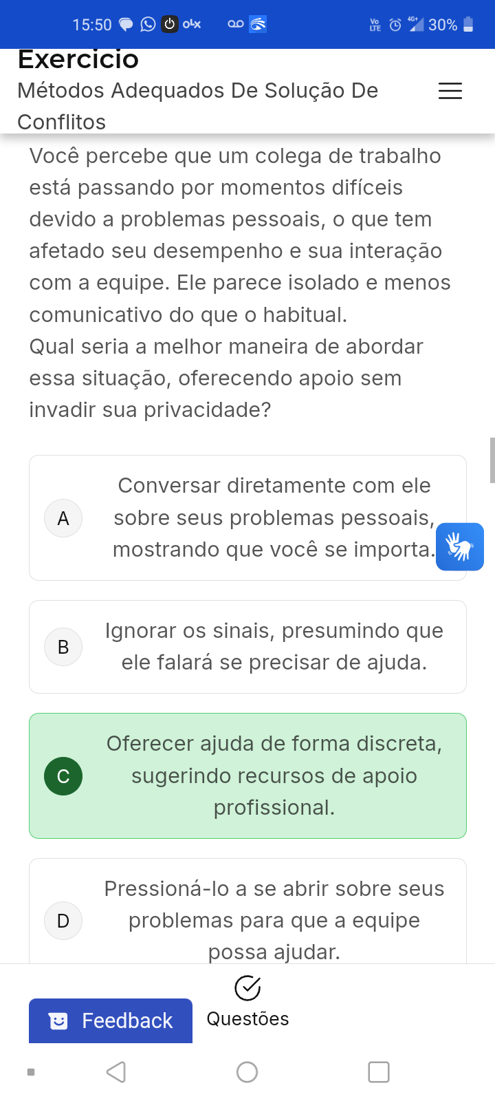 <p>Vo 4G+ 15:50 LTE 30% Exercicio Métodos Adequados De Solução De Conflitos Você percebe que um colega de trabalho está passando por momentos difíceis devido a problemas pessoais, o que tem afetado seu desempenho e sua interação com a equipe. Ele parece isolado e menos comunicativo do que habitual. Qual seria a melhor maneira de abordar essa situação, oferecendo apoio sem invadir sua privacidade? Conversar diretamente com ele A sobre seus problemas pessoais, mostrando que você se importa. Ignorar os sinais, presumindo que B ele falará se precisar de ajuda. Oferecer ajuda de forma discreta, C sugerindo recursos de apoio profissional. Pressioná-lo a se abrir sobre seus D problemas para que a equipe possa ajudar. Feedback Questões</p>