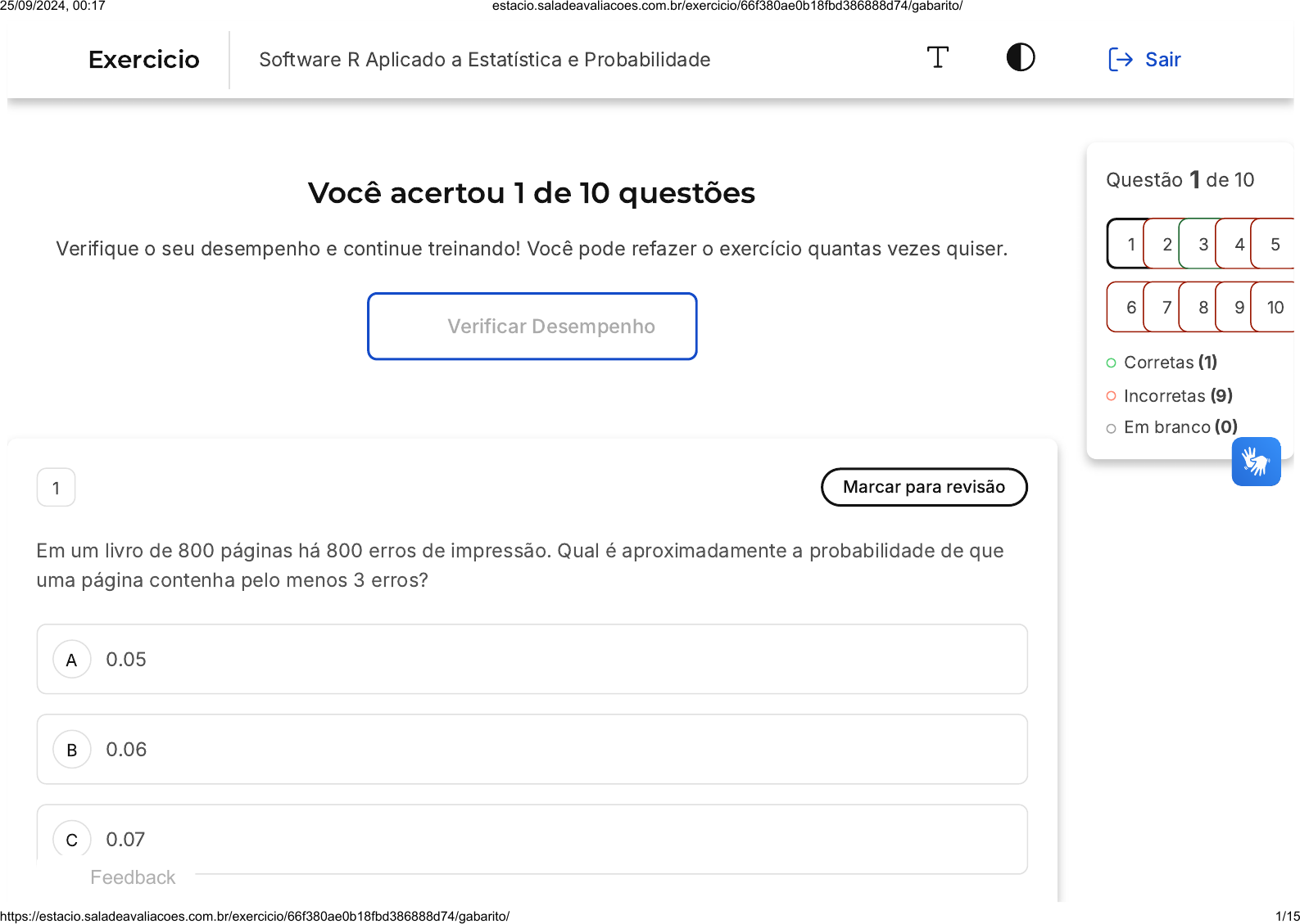 <p>Você acertou 1 de 10 questões</p><p>Verifique o seu desempenho e continue treinando! Você pode refazer o exercício quantas vezes quiser.</p><p>Verificar Desempenho</p><p>A</p><p>B</p><p>C</p><p>1 Marcar para revisão</p><p>Em um livro de 800 páginas há 800 erros de impressão. Qual é aproximadamente a probabilidade de que</p><p>uma página contenha pelo menos 3 erros?</p><p>0.05</p><p>0.06</p><p>0.07</p><p>Questão 1 de 10</p><p>Corretas �1�</p><p>Incorretas �9�</p><p>Em branco �0�</p><p>1 2 3 4 5</p><p>6 7 8 9 10</p><p>Feedback</p><p>Exercicio Software R Aplicado a Estatística e Probabilidade Sair</p><p>25/09/2024, 00:17 estacio.saladeavaliacoes.com.br/exercicio/66f380ae0b18fbd386888d74/gabarito/</p><p>https://estacio.saladeavaliacoes.com.br/exercicio/66f380ae0b18fbd386888d74/gabarito/ 1/15</p><p>D</p><p>E</p><p>0.08</p><p>0.09</p><p>Resposta incorreta</p><p>Opa! A alternativa correta é a letra D. Confira o gabarito comentado!</p><p>Gabarito Comentado</p><p>Para resolver essa questão, precisamos entender que temos um dado de contagem no problema, pois</p><p>são 800 erros em 800 páginas. Isso nos dá uma média de 1 erro por página (λ�1). Como a questão</p><p>pede a probabilidade de que uma página contenha pelo menos 3 erros, podemos usar a função</p><p>acumulada ppois() ou a de densidade dpois().</p><p>É importante lembrar que sempre que for solicitado valores maiores do que um certo número,</p><p>precisamos fazer "1 - valor". Isso ocorre porque as funções calculam a probabilidade de x ser menor</p><p>que um número e a questão pede que x seja maior. Portanto, a operação seria:</p><p>1-ppois(2,1)</p><p>O resultado é 0.0803014.</p><p>Outra maneira de calcular seria:</p><p>1 - ( dpois(0,1)+ dpois �1,1� + dpois(2,1) )</p><p>O resultado também é 0.0803014.</p><p>Portanto, a probabilidade de que uma página contenha pelo menos 3 erros é aproximadamente 0.08, o</p><p>que corresponde à alternativa D.</p><p>25/09/2024, 00:17 estacio.saladeavaliacoes.com.br/exercicio/66f380ae0b18fbd386888d74/gabarito/</p><p>https://estacio.saladeavaliacoes.com.br/exercicio/66f380ae0b18fbd386888d74/gabarito/ 2/15</p><p>A</p><p>B</p><p>C</p><p>D</p><p>E</p><p>2 Marcar para revisão</p><p>Utilizando a base de dados do Titanic no pacote Titanic, qual é aproximadamente a média de idade para os</p><p>homens? Desconsidere os valores de resposta "NA" (missing) e faça o cálculo somente para os dados</p><p>restantes.</p><p>A média de idade para os homens é de aproximadamente 30,7 anos.</p><p>A média de idade para os homens é de aproximadamente 20,7 anos.</p><p>A média de idade para os homens é de aproximadamente 35,7 anos.</p><p>A média de idade para os homens é de aproximadamente 37,7 anos.</p><p>A média de idade para os homens é de aproximadamente 47,7 anos.</p><p>Resposta incorreta</p><p>Opa! A alternativa correta é a letra A. Confira o gabarito comentado!</p><p>Gabarito Comentado</p><p>25/09/2024, 00:17 estacio.saladeavaliacoes.com.br/exercicio/66f380ae0b18fbd386888d74/gabarito/</p><p>https://estacio.saladeavaliacoes.com.br/exercicio/66f380ae0b18fbd386888d74/gabarito/ 3/15</p><p>Para resolver a questão, é necessário carregar a base de dados do Titanic, denominada</p><p>"Titanic_train". Em seguida, é preciso filtrar a base de dados para incluir apenas os indivíduos do sexo</p><p>masculino ("male"), resultando em uma nova base chamada "homens". No entanto, essa base contém</p><p>dados faltantes, também conhecidos como "missings". Portanto, é necessário remover esses dados</p><p>faltantes, resultando em uma base chamada "idade_H". Com essa base, é possível calcular a média de</p><p>idade dos homens.</p><p>Segue o código em R para realizar essas operações:</p><p>library(titanic)</p><p>data("titanic_train")</p><p>homens � titanic_train[titanic_train$Sex == "male", ]</p><p>idade_H��homens[!is.na(homens$Age),])</p><p>mean(idade_H$Age)</p><p>�1� 30.72664</p><p>Portanto, a média de idade para os homens, desconsiderando os dados faltantes, é de</p><p>aproximadamente 30,7 anos.</p><p>3 Marcar para revisão</p><p>Utilizando a base de dados pré-carregada dentro do software R chamada Iris, qual é o maior valor</p><p>encontrado para a variável Petal.Length em cm (tamanho da pétala)?</p><p>25/09/2024, 00:17 estacio.saladeavaliacoes.com.br/exercicio/66f380ae0b18fbd386888d74/gabarito/</p><p>https://estacio.saladeavaliacoes.com.br/exercicio/66f380ae0b18fbd386888d74/gabarito/ 4/15</p><p>A</p><p>B</p><p>C</p><p>D</p><p>E</p><p>4,3</p><p>5,2</p><p>3,3</p><p>6,9</p><p>1,2</p><p>Resposta correta</p><p>Parabéns, você selecionou a alternativa correta. Confira o gabarito comentado!</p><p>Gabarito Comentado</p><p>25/09/2024, 00:17 estacio.saladeavaliacoes.com.br/exercicio/66f380ae0b18fbd386888d74/gabarito/</p><p>https://estacio.saladeavaliacoes.com.br/exercicio/66f380ae0b18fbd386888d74/gabarito/ 5/15</p><p>A</p><p>B</p><p>C</p><p>Para encontrar o maior valor da variável Petal.Length na base de dados Iris, utilizamos a função max()</p><p>no software R. Primeiramente, carregamos a base de dados com o comando data(iris). Em seguida,</p><p>aplicamos a função max() à variável de interesse, como demonstrado abaixo:</p><p>data(iris)</p><p>max(iris$Petal.Length)</p><p>O resultado obtido é �1� 6.9, indicando que o maior valor para o tamanho da pétala na base de dados</p><p>Iris é 6,9 cm. Portanto, a alternativa correta é a letra D.</p><p>4 Marcar para revisão</p><p>Suponha que determinado componente produzido por uma empresa tem uma probabilidade de 0,2% de</p><p>ser defeituoso. Cada pacote de componentes carrega 30 unidades. Qual é a probabilidade que um pacote</p><p>selecionado ao acaso contenha no máximo um componente defeituoso?</p><p>0,80</p><p>0,85</p><p>0,90</p><p>25/09/2024, 00:17 estacio.saladeavaliacoes.com.br/exercicio/66f380ae0b18fbd386888d74/gabarito/</p><p>https://estacio.saladeavaliacoes.com.br/exercicio/66f380ae0b18fbd38688