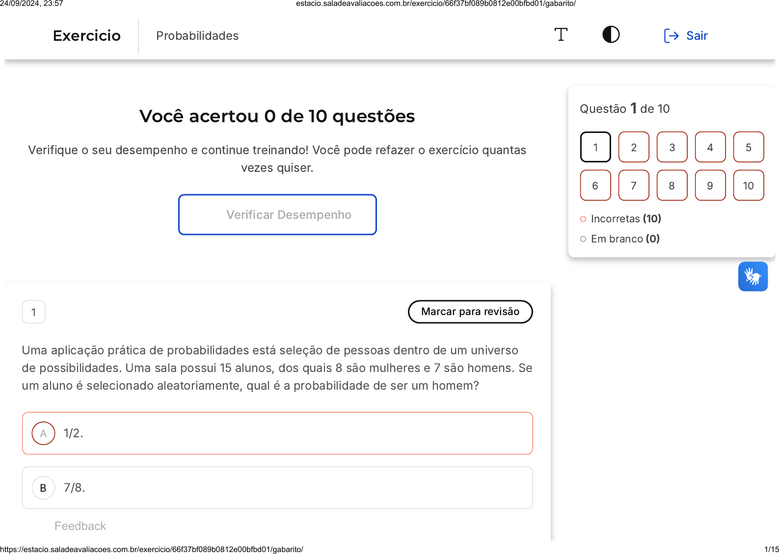 <p>Você acertou 0 de 10 questões</p><p>Verifique o seu desempenho e continue treinando! Você pode refazer o exercício quantas</p><p>vezes quiser.</p><p>Verificar Desempenho</p><p>A</p><p>B</p><p>1 Marcar para revisão</p><p>Uma aplicação prática de probabilidades está seleção de pessoas dentro de um universo</p><p>de possibilidades. Uma sala possui 15 alunos, dos quais 8 são mulheres e 7 são homens. Se</p><p>um aluno é selecionado aleatoriamente, qual é a probabilidade de ser um homem?</p><p>1/2.</p><p>7/8.</p><p>Questão 1 de 10</p><p>Incorretas �10�</p><p>Em branco �0�</p><p>1 2 3 4 5</p><p>6 7 8 9 10</p><p>Feedback</p><p>Exercicio Probabilidades Sair</p><p>24/09/2024, 23:57 estacio.saladeavaliacoes.com.br/exercicio/66f37bf089b0812e00bfbd01/gabarito/</p><p>https://estacio.saladeavaliacoes.com.br/exercicio/66f37bf089b0812e00bfbd01/gabarito/ 1/15</p><p>C</p><p>D</p><p>E</p><p>7/15.</p><p>8/15.</p><p>8/7.</p><p>Resposta incorreta</p><p>Opa! A alternativa correta é a letra C. Confira o gabarito comentado!</p><p>Gabarito Comentado</p><p>A probabilidade de selecionar um homem é o número de homens dividido pelo número</p><p>total de alunos na sala. Portanto, a resposta correta é 7/15.</p><p>2 Marcar para revisão</p><p>A taxação de determinados valores de coberturas irá depender da probabilidade de estes</p><p>ocorrerem. Uma seguradora oferece um seguro de vida que paga uma indenização de R$</p><p>500.000 em caso de morte acidental. Com base em dados estatísticos, a probabilidade de</p><p>uma pessoa falecer em um determinado período é de 0,02%. Qual é o valor esperado</p><p>dessa cobertura de seguro?</p><p>24/09/2024, 23:57 estacio.saladeavaliacoes.com.br/exercicio/66f37bf089b0812e00bfbd01/gabarito/</p><p>https://estacio.saladeavaliacoes.com.br/exercicio/66f37bf089b0812e00bfbd01/gabarito/ 2/15</p><p>A</p><p>B</p><p>C</p><p>D</p><p>E</p><p>R$ 500.</p><p>R$ 1.000.</p><p>R$ 100.</p><p>R$ 10.000.</p><p>R$ 100.000.</p><p>Resposta incorreta</p><p>Opa! A alternativa correta é a letra C. Confira o gabarito comentado!</p><p>Gabarito Comentado</p><p>O valor esperado é calculado multiplicando o valor da indenização pelo valor da</p><p>probabilidade. Neste caso, o cálculo seria R</p><p>100. Portanto, a resposta</p><p>correta é R$ 100.</p><p>500.000multiplicadopor0, 0002, oqueresultaemR</p><p>24/09/2024, 23:57 estacio.saladeavaliacoes.com.br/exercicio/66f37bf089b0812e00bfbd01/gabarito/</p><p>https://estacio.saladeavaliacoes.com.br/exercicio/66f37bf089b0812e00bfbd01/gabarito/ 3/15</p><p>A</p><p>B</p><p>C</p><p>D</p><p>E</p><p>3 Marcar para revisão</p><p>Em um grupo de 200 adultos, 130 são do sexo masculino. Das mulheres desse grupo, 40%</p><p>são casadas. Entre essas 200 pessoas, 94 delas não são casadas. Ao escolher</p><p>aleatoriamente 1 desses adultos, qual é a probabilidade de que ele seja um homem,</p><p>sabendo que o adulto sorteado é casado?</p><p>3/5.</p><p>13/20.</p><p>14/39.</p><p>14/53.</p><p>39/53.</p><p>Resposta incorreta</p><p>Opa! A alternativa correta é a letra E. Confira o gabarito comentado!</p><p>Gabarito Comentado</p><p>24/09/2024, 23:57 estacio.saladeavaliacoes.com.br/exercicio/66f37bf089b0812e00bfbd01/gabarito/</p><p>https://estacio.saladeavaliacoes.com.br/exercicio/66f37bf089b0812e00bfbd01/gabarito/ 4/15</p><p>A</p><p>B</p><p>C</p><p>No grupo de 200 adultos, temos 130 homens e 70 mulheres. Como 40% das mulheres</p><p>são casadas, temos 28 mulheres casadas. Como 94 pessoas não são casadas, temos</p><p>106 pessoas casadas �200 � 94�. Dentre os homens, 78 são casados �130 � 52�, pois</p><p>52 são solteiros �200 � 106 � 28 mulheres casadas). Portanto, se o adulto sorteado é</p><p>casado, a probabilidade de ser homem é de 78/106, que simplificado resulta em 39/53.</p><p>4 Marcar para revisão</p><p>Uma urna contém 10 bolas numeradas de 1 a 10. Foram sacadas, sucessivamente e sem</p><p>reposição, 2 dessas bolas. A probabilidade de a primeira bola ter um número par e a</p><p>segunda ter um número múltiplo de 5 é igual a:</p><p>1/20</p><p>1/18</p><p>7/90</p><p>24/09/2024, 23:57 estacio.saladeavaliacoes.com.br/exercicio/66f37bf089b0812e00bfbd01/gabarito/</p><p>https://estacio.saladeavaliacoes.com.br/exercicio/66f37bf089b0812e00bfbd01/gabarito/ 5/15</p><p>D</p><p>E</p><p>1/10</p><p>1/9</p><p>Resposta incorreta</p><p>Opa! A alternativa correta é a letra E. Confira o gabarito comentado!</p><p>Gabarito Comentado</p><p>A urna contém 10 bolas, das quais 5 são pares �2, 4, 6, 8, 10) e 2 são múltiplos de 5 �5,</p><p>10�. A probabilidade de a primeira bola ser par é 5/10 ou 1/2. Como as bolas não são</p><p>repostas, após a primeira retirada, restam 9 bolas na urna. A probabilidade de a</p><p>segunda bola ser múltiplo de 5 é então 2/9. A probabilidade conjunta desses dois</p><p>eventos é o produto das probabilidades individuais, ou seja, �1/2� * �2/9� = 1/9.</p><p>5 Marcar para revisão</p><p>Ao jogar um jogo de cartas como o pôquer, as probabilidades são usadas para calcular a</p><p>chance de obter uma determinada mão, como um flush ou uma sequência. Um dado justo é</p><p>lançado. Qual é a probabilidade de obter um número primo?</p><p>24/09/2024, 23:57 estacio.saladeavaliacoes.com.br/exercicio/66f37bf089b0812e00bfbd01/gabarito/</p><p>https://estacio.saladeavaliacoes.com.br/exercicio/66f37bf089b0812e00bfbd01/gabarito/ 6/15</p><p>A</p><p>B</p><p>C</p><p>D</p><p>E</p><p>1/2.</p><p>1/3.</p><p>2/3.</p><p>1/6.</p><p>2/6.</p><p>Resposta incorreta</p><p>Opa! A alternativa correta é a letra A. Confira o gabarito comentado!</p><p>Gabarito Comentado</p><p>Um dado justo possui 6 faces, com os números 1, 2, 3, 4, 5 e 6. Dentre esses números,</p><p>apenas os números 2, 3 e 5 são primos. Portanto, a probabilidade de obter um número</p><p>primo é 3 (número de primos) dividido por 6 (número total de resultados possíveis),</p><p>que resulta em 1/2.</p><p>24/09/2024, 23:57 estacio.saladeavaliaco