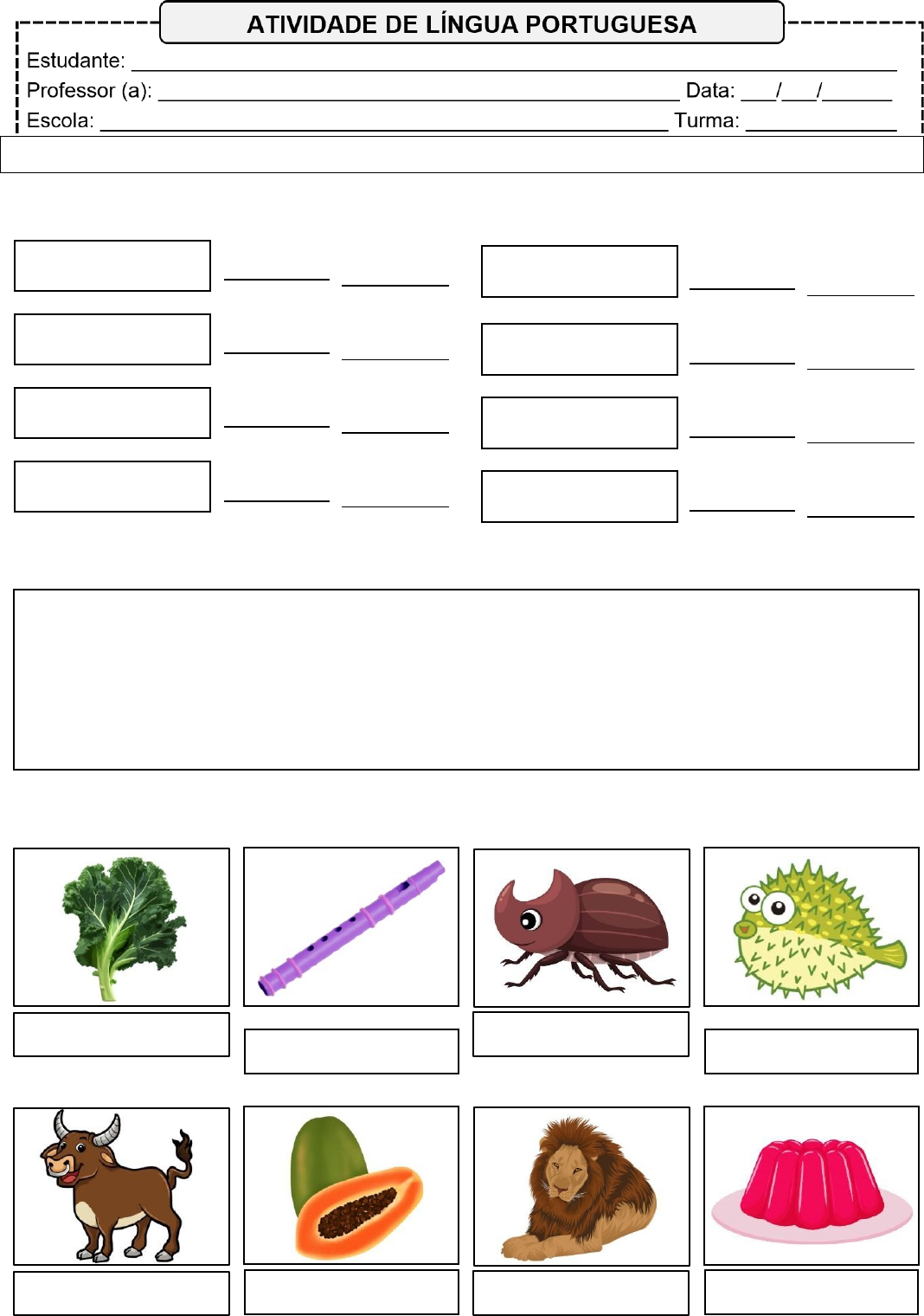 <p>ENCONTRO CONSONATAL DITONGO</p><p>1. Separe as sílabas das palavras abaixo.</p><p>- CAIXA</p><p>- BEIJO</p><p>- SABÃO</p><p>- DEGRAU</p><p>-</p><p>- TOURO</p><p>PAIXÃO</p><p>- RUIVO</p><p>- QUASE</p><p>T_ _ RO</p><p>LE_ ___</p><p>GEL A</p><p>MAM_______</p><p>P_ XE</p><p>FL TA</p><p>2. Circule as palavras que possuem o encontro vocálico classificado como ditongo.</p><p>BAIXO</p><p>BAÚ</p><p>TESOURA</p><p>BOI</p><p>IGUAIS</p><p>DIA</p><p>BOIA</p><p>COELHO</p><p>IDEIA</p><p>3. Complete o nome das figuras com o ditongo faltoso.C_ _ VE</p><p>BES RO</p><p>ENCONTRO CONSONATAL TRITONGO</p><p>1. Preencha a tabela conforme o exemplo.</p><p>PALAVRA</p><p>SEPARAÇÃO SILÁBICA</p><p>TRITONGO</p><p>PARAGUAI</p><p>PA – RA – GUAI</p><p>UAI</p><p>ENXAGUEI</p><p>SAGUÃO</p><p>URUGUAI</p><p>PINGUIM</p><p>2. Separe as silabas das palavras e destaque o tritongo presente em casa uma delas.</p><p>SITUAM</p><p>INSINUOU</p><p>QUAIS</p><p>VIRTUAIS</p><p>IGUAL</p><p>NINGUÉM</p><p>3. Circule nas frases abaixo a palavra que pode ser classificada como tritongo.</p><p>a) O bueiro da cidade estava lotado de água.</p><p>b) As roupas daquelas meninas são iguais.</p><p>c) As aulas virtuais estão quase acabando.</p><p>d) Mariana aguou as plantinhas de sua avó.</p><p>e) Quaisquer pessoas podem ver o espetáculo.</p><p>ENCONTRO CONSONATAL HIATO</p><p>1. Separe as sílabas do nome das figuras classificadas como Hiato.</p><p>MOEDA</p><p>RAIZ</p><p>LUA</p><p>JOELHO</p><p>LEÃO</p><p>NAVIO</p><p>RAINHA</p><p>BAÚ</p><p>2. Pinte a imagem da lacuna cuja palavra apresenta Hiato.BALÃO</p><p>TOURO</p><p>3. Leia a frase abaixo.PIANO</p><p>PEIXE</p><p>O PÁSSARO VOAVA RÁPIDO NO RIACHO.</p><p>Escreva duas palavras da frase que possui Hiato.</p><p>1.Classifique os encontros vocálicos em: ditongo, tritongo e hiato:</p><p>( ) saguão ( )orquídea</p><p>( )circuito ( )pinguim</p><p>( )artéria ( )averiguemos</p><p>( )Paraguai ( )pia</p><p>( )quieto ( )cupuaçu</p><p>( )aguentar ( )iguaizinhos</p><p>( )preestabelecer ( )saguões</p><p>( )propõe ( ) gratuito</p><p>( )rainha ( ) triunfo</p><p>4.Sublinhe as palavras em que ocorre tritongo:</p><p>Paraguai, pescaria, mandaria, choraria</p><p>averiguei,conquistei, redarguiu, enxaguou</p><p>saguão, Uruguai, quão, quais, Batatais</p><p>7.Coloque (D) para ditongo e (H) para hiato.</p><p>( )Orquídea ( )contrário ( )soar ( )sabiá</p><p>( )algodão ( ) mau ( ) saúde ( )Noel</p><p>( )feio ( )pardais ( ) Paraíba ( )hiato</p><p>5.Marque a alternativa em que apresenta, respectivamente, um hiato, um ditongo e um tritongo:</p><p>a.( )panela, Paraguai, saúde</p><p>b.( )saúde, ouro, saguão</p><p>c.( ) janela, camelo, Uruguai</p><p>6.Assinale a alternativa que apresenta somente hiato:</p><p>a.( )pia, Paraguai, saúva</p><p>b.( )rainha, uai, propõe</p><p>c.( ) dia, triunfo, caótico</p><p>2.Sublinhe as palavras em que ocorre hiato:</p><p>viúva viu coeso</p><p>caí lagoa cai ruivo</p><p>ruína sueco rua ruim</p><p>sai beato Tietê boia</p><p>país água saíra</p><p>3.Observe as palavras abaixo. Note que os ditongos encontram-se destacados. Classifique-os em crescentes ou decrescentes.</p><p>língua __________________</p><p>constrói __________________</p><p>depois __________________</p><p>brasileiro __________________</p><p>feio __________________</p><p>redação __________________</p><p>baía __________________</p><p>exercício __________________</p><p>múmia __________________</p><p>tênue __________________</p><p>quando __________________</p><p>image6.jpeg</p><p>image7.jpeg</p><p>image8.jpeg</p><p>image9.jpeg</p><p>image10.jpeg</p><p>image11.jpeg</p><p>image12.jpeg</p><p>image13.jpeg</p><p>image14.jpeg</p><p>image15.jpeg</p><p>image16.jpeg</p><p>image17.jpeg</p><p>image18.jpeg</p><p>image19.jpeg</p><p>image20.jpeg</p><p>image21.jpeg</p><p>image22.jpeg</p><p>image23.jpeg</p><p>image24.jpeg</p><p>image25.jpeg</p><p>image26.jpeg</p><p>image27.jpeg</p><p>image28.jpeg</p><p>image29.jpeg</p><p>image30.jpeg</p><p>image31.jpeg</p><p>image32.jpeg</p><p>image33.jpeg</p><p>image34.jpeg</p><p>image35.jpeg</p><p>image36.jpeg</p><p>image37.jpeg</p><p>image38.jpeg</p><p>image39.jpeg</p><p>image40.jpeg</p><p>image41.jpeg</p><p>image1.png</p><p>image2.jpeg</p><p>image3.jpeg</p><p>image4.jpeg</p><p>image5.jpeg</p>