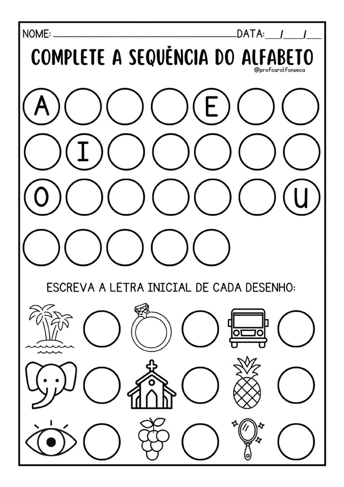 <p>NOME: DATA: COMPLETE A DO ALFABETO @profcarol.fonseca A OC 0000000 OOOOO ESCREVA A LETRA INICIAL DE CADA DESENHO:</p><p>NOME: DATA: ESTUDANDO AS VOGAIS 0 ESCREVA A LETRA INICIAL DO NOME DE CADA DESENHO. @profcarol.fonseca O</p><p>NOME: DATA: ESTUDANDO AS VOGAIS CIRCULE os DESENHOS QUE INICIAM COM A LETRA DESTACADA. @profcarol.fonseca E 0 1</p><p>NOME: DATA: COMPLETE COM AS VOGAIS @profcarol.fonseca P N L F G V P PPC T B NC</p><p>NOME: DATA: ENCONTROS VOCÁLICOS @profcarol.fonseca JUNTE AS VOGAIS PARA FORMAR ENCONTROS VOCÁLICOS: E+U= 0+1= A+U= U+I= = ESCREVA ENCONTROS VOCÁLICOS DE ACORDO COM O DESENHO: 3 2 4</p><p>NOME: DATA: LER PARA CONHECER @profcarol.fonseca A BARATA A BARATA DIZ QUE TEM SETE SAIAS DE FILÓ É MENTIRA DA BARATA, ELA TEM É UMA ELA TEM É UMA SÓ! A BARATA DIZ QUE TEM UM ANEL DE FORMATURA É MENTIRA DA BARATA, ELA TEM É CASCA DURA ELA TEM É CASCA DURA! A BARATA DIZ QUE TEM UM SAPATO DE VELUDO É MENTIRA DA BARATA ELA TEM PÉ PELUDO ELA TEM PÉ PELUDO! A E 0 U</p><p>NOME: DATA: VAMOS TREINAR A LEITURA? LEIA COM ATENÇÃO E PINTE A BOLINHA COM A OPÇÃO QUE APRESENTE NOME CORRETO DE CADA FIGURA. BOTA BOLO BOCA BOTA BOLO BOCA BRATA BARATA BARATA BALEIA BATATA BATATA BUZINA BNDO BUTUNA BERNARDO BUTINA BERDONAR BNECA BOLSA BNC BOTA BONECA BOLO BEKIGA BOCA BXIGA BRASIL le BEXIGA BRUNA BOTA BARATA BOCA BOTA BOLO BATATA</p><p>NOME: DATA: CRUZADINHA @profcarol.fonseca COMPLETE A CRUZADINHA ESCREVENDO NOME DAS FIGURA. D Z X G N N C</p><p>NOME: DATA: MONTANDO PALAVRAS RECORTE E COLE EM SEU CADERNO FORMANDO PALAVRAS: BO NE BO LO CA BA NÉ BE LA TA BO TA BO CLE GA BI XI LA BO CI</p><p>NOME: DATA: LER PARA CONHECER @profcarol.fonseca 1) LEIA AS FRASES ABAIXO E CIRCULE CA-CE-CI-CO-CU: A CASA DE CAMILA É MUITO COLORIDA. ELA FICA NA CIDADE, MAS PARECE UM CASTELO. CAMILA GOSTA DE TOMAR CALDO DE CEBOLA E BEBER ÁGUA DE COCO GELADINHA NO SEU COPO. ELA GOSTA DE BRINCAR COM CUBO MÁGICO! 2) VAMOS ESCREVER os NOMES DOS DESENHOS ABAIXO? A E C 0 U</p><p>NOME: DATA: CONTANDO AS SÍLABAS @profcarol.fonseca PINTE os QUADRADINHOS DE ACORDO COM NÚMERO DE SÍLABAS E DEPOIS, REESCREVA A PALAVRA:</p><p>NOME: DATA: LER PARA CONHECER @profcarol.fonseca LEIA O TEXTO ABAIXO E CIRCULE DA-DE-DI-DO-DU: O DOCE PERGUNTOU PRO DOCE QUAL É O DOCE MAIS DOCE DO QUE O DOCE DE BATATA-DOCE? O DOCE RESPONDEU PRO DOCE QUE O DOCE MAIS DOCE QUE O DOCE DE BATATA-DOCE É DOCE DE BATATA-DOCE. BATATA DOCE 2) VAMOS ESCREVER NOMES DOS DESENHOS ABAIXO? A E D 0 U</p><p>NOME: DATA: CONTANDO AS SÍLABAS 1) PINTE OS QUADRADINHOS DE ACORDO COM O NÚMERO DE SÍLABAS E DEPOIS, REESCREVA A PALAVRA: $</p><p>NOME: DATA: LER PARA CONHECER @profcarol.fonseca LEIA O TEXTO ABAIXO E CIRCULE FA-FE-FI-FO-FU= FAÍSCA E FÁBIO FORAM À FAZENDA BUSCAR FLORES. A FADA FLÁVIA GUIOU POR ENTRE AS FOLHAS VERDES. NA FLORESTA, ENCONTRARAM FRUTAS FRESQUINHAS E FIZERAM UMA FESTA. FELIZMENTE, O FIM DO DIA FOI FANTÁSTICO! 2) VAMOS ESCREVER OS NOMES DOS DESENHOS ABAIXO? A E F 0 U</p><p>NOME: DATA: SÍLABA INICIAL @profcarol.fonseca PINTE A SÍLABA INICIAL E ESCREVA A PALAVRA: FA FE FI FO FU FA FE FI FO FU FA FE FI FO FU FA FE FI FO FU FA FE FI FO FU FA FE FI FO FU FA FE FI FO FU FA FE FI FO FU FA FE FI FO FU FA FE FI FO FU FA FE FI FO FU FA FE FI FO FU</p><p>NOME: DATA: LER PARA CONHECER @profcarol.fonseca LEIA O TEXTO ABAIXO E CIRCULE GA-GE-GI-GO-GU: GABI E GUTO GOSTAM DE GIRAFAS. NO JARDIM, ELES PLANTAM GIRASSÓIS QUE CRESCEM GRANDES. GATOS GRACIOSOS BRINCAM AO REDOR. GUSTAVO TOCA GUITARRA, E GABI GARGALHA COM ALEGRIA. QUE GRANDE DIA NO JARDIM! 2) VAMOS ESCREVER OS NOMES DOS DESENHOS ABAIXO? A E G 0 U</p><p>NOME: DATA: CAÇA-PALAVRAS LEIA AS PALAVRAS ABAIXO E PROCURE NO CAÇA- PALAVRAS ABAIXO: 0 0 GIRAFA GELATINA GARFO GALINHA GELADEIRA GARRAFA G E A D E I R A H I Y H G M Q C T G A l I N H A X J K D H V T Y G A R F 0 A X F R X D W l G E l A T I N A T U M P Z G A R R A F A G I R A F A X C I</p><p>NOME: DATA: LER PARA CONHECER @profcarol.fonseca 1) LEIA O TEXTO ABAIXO E JOÃO E JULIA JOGAM BOLA NO JARDIM. JUNTOS, ELES CUIDAM DE UM JACARÉ DE PELÚCIA. JULIA ADORA LER HISTÓRIAS DE JOVENS QUE JORNADA DIVERTIDA ELES TÊM JUNTOS! 2) VAMOS ESCREVER NOMES DOS DESENHOS ABAIXO? A E J 0 U</p><p>NOME: DATA: LEIA E PINTE @profcarol.fonseca PINTE A PALAVRA QUE REPRESENTA NOME DA IMAGEM: JACA JACARÉ JARARACA JAQUETA JANTA JAVALI JANELA JAULA JABUTICABA JOCA JIPE JILÓ</p><p>NOME: DATA: LER PARA CONHECER @profcarol.fonseca 1) LEIA O TEXTO ABAIXO E JOÃO E JULIA JOGAM BOLA NO JARDIM. JUNTOS, ELES CUIDAM DE UM JACARÉ DE PELÚCIA. JULIA ADORA LER HISTÓRIAS DE JOVENS QUE JORNADA DIVERTIDA ELES TÊM JUNTOS! 2) VAMOS ESCREVER NOMES DOS DESENHOS ABAIXO? A E J 0 U</p>