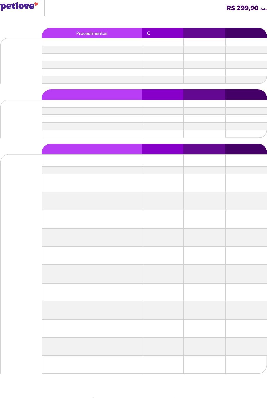 <p>TABELA DE PROCEDIMENTOS</p><p>PLANO PETLOVE COMPLETO R$ 299,90 /mês</p><p>Procedimentos Coparticipação Limites anuais Carências</p><p>Consulta generalista Retorno clínica 0,00 Ilimitado 45 dias</p><p>Retorno em horário de plantão 15,00 Ilimitado 45 dias</p><p>Retorno domiciliar 15,00 Ilimitado 45 dias</p><p>Consulta clínico geral 20,00 Ilimitado 45 dias</p><p>Consulta Domiciliar 25,00 Ilimitado 45 dias</p><p>Consulta Plantão 35,00 Ilimitado 45 dias</p><p>Procedimentos Coparticipação Limites anuais Carências</p><p>Vacinas Vacina da Gripe 10,00 2 45 dias</p><p>Vacina da Raiva 10,00 1 45 dias</p><p>Vacina Quíntupla 10,00 2 45 dias</p><p>Vacina Polivalente 10,00 3 45 dias</p><p>Vacina Quádrupla 10,00 2 45 dias</p><p>Procedimentos Coparticipação Limites anuais Carências</p><p>Consulta</p><p>especialista</p><p>Avaliação Fisioterapia/Acupuntura 40,00 7 60 dias</p><p>Retorno especialista - até 30 dias 45,00 7 60 dias</p><p>Consulta Especialista - Nefrologia 60,00</p><p>Grupo Consulta</p><p>Especialista com 7</p><p>limites.</p><p>60 dias</p><p>Consulta Especialista -</p><p>Ortopedia/Traumatologia 60,00</p><p>Grupo Consulta</p><p>Especialista com 7</p><p>limites.</p><p>60 dias</p><p>Consulta Especialista - Neurologia 60,00</p><p>Grupo Consulta</p><p>Especialista com 7</p><p>limites.</p><p>60 dias</p><p>Consulta Especialista - Dermatologia 60,00</p><p>Grupo Consulta</p><p>Especialista com 7</p><p>limites.</p><p>60 dias</p><p>Consulta Especialista - Endocrinologia 60,00</p><p>Grupo Consulta</p><p>Especialista com 7</p><p>limites.</p><p>60 dias</p><p>Consulta Especialista - Oftalmologia 60,00</p><p>Grupo Consulta</p><p>Especialista com 7</p><p>limites.</p><p>60 dias</p><p>Consulta Especialista - Cardiologia 60,00</p><p>Grupo Consulta</p><p>Especialista com 7</p><p>limites.</p><p>60 dias</p><p>Consulta Especialista - Gastroenterologia 60,00</p><p>Grupo Consulta</p><p>Especialista com 7</p><p>limites.</p><p>60 dias</p><p>Consulta Especialista - Hematologia 60,00</p><p>Grupo Consulta</p><p>Especialista com 7</p><p>limites.</p><p>60 dias</p><p>Consulta Especialista - Oncologia 60,00</p><p>Grupo Consulta</p><p>Especialista com 7</p><p>limites.</p><p>60 dias</p><p>Consulta Especialista - Felinos 60,00</p><p>Grupo Consulta</p><p>Especialista com 7</p><p>limites.</p><p>60 dias</p><p>Veterinária Responsável Técnica: Joana Portin Pereira | CRMV 11579</p><p>TABELA DE PROCEDIMENTOS</p><p>PLANO PETLOVE COMPLETO R$ 299,90 /mês</p><p>Procedimentos Coparticipação Limites anuais Carências</p><p>Exames</p><p>laboratoriais</p><p>simples</p><p>Hemograma 10,00</p><p>Grupo Exames</p><p>Laboratoriais</p><p>Simples com 40</p><p>limites.</p><p>45 dias</p><p>Amônia 10,00</p><p>Grupo Exames</p><p>Laboratoriais</p><p>Simples com 40</p><p>limites.</p><p>45 dias</p><p>Glicemia fita 10,00</p><p>Grupo Exames</p><p>Laboratoriais</p><p>Simples com 40</p><p>limites.</p><p>45 dias</p><p>Cloro 10,00</p><p>Grupo Exames</p><p>Laboratoriais</p><p>Simples com 40</p><p>limites.</p><p>45 dias</p><p>Magnésio 10,00</p><p>Grupo Exames</p><p>Laboratoriais</p><p>Simples com 40</p><p>limites.</p><p>45 dias</p><p>Urinálise (E.Q.U.) 10,00</p><p>Grupo Exames</p><p>Laboratoriais</p><p>Simples com 40</p><p>limites.</p><p>45 dias</p><p>Ferro 10,00</p><p>Grupo Exames</p><p>Laboratoriais</p><p>Simples com 40</p><p>limites.</p><p>45 dias</p><p>Tempo de Trombina (TT) + Tempo de</p><p>Tromboplastina Parcial Ativada (TTPA) 10,00</p><p>Grupo Exames</p><p>Laboratoriais</p><p>Simples com 40</p><p>limites.</p><p>45 dias</p><p>Fibrinogênio 10,00</p><p>Grupo Exames</p><p>Laboratoriais</p><p>Simples com 40</p><p>limites.</p><p>45 dias</p><p>Ácido Úrico 10,00</p><p>Grupo Exames</p><p>Laboratoriais</p><p>Simples com 40</p><p>limites.</p><p>45 dias</p><p>Amilase 10,00</p><p>Grupo Exames</p><p>Laboratoriais</p><p>Simples com 40</p><p>limites.</p><p>45 dias</p><p>Beta Hidroxibutirato 10,00</p><p>Grupo Exames</p><p>Laboratoriais</p><p>Simples com 40</p><p>limites.</p><p>45 dias</p><p>Contagem de reticulócitos 10,00</p><p>Grupo Exames</p><p>Laboratoriais</p><p>Simples com 40</p><p>limites.</p><p>45 dias</p><p>Eletroforese de Colesterol 10,00</p><p>Grupo Exames</p><p>Laboratoriais</p><p>Simples com 40</p><p>limites.</p><p>45 dias</p><p>Lipase Sérica 10,00</p><p>Grupo Exames</p><p>Laboratoriais</p><p>Simples com 40</p><p>limites.</p><p>45 dias</p><p>Veterinária Responsável Técnica: Joana Portin Pereira | CRMV 11579</p><p>TABELA DE PROCEDIMENTOS</p><p>PLANO PETLOVE COMPLETO R$ 299,90 /mês</p><p>Procedimentos Coparticipação Limites anuais Carências</p><p>Hematócrito 10,00</p><p>Grupo Exames</p><p>Laboratoriais</p><p>Simples com 40</p><p>limites.</p><p>45 dias</p><p>Pesquisa de Células de Lupus Eritematoso 10,00</p><p>Grupo Exames</p><p>Laboratoriais</p><p>Simples com 40</p><p>limites.</p><p>45 dias</p><p>Pesquisa de Corpúsculo de Lentz 10,00</p><p>Grupo Exames</p><p>Laboratoriais</p><p>Simples com 40</p><p>limites.</p><p>45 dias</p><p>Velocidade de Hemossedmentação (VHS) 10,00</p><p>Grupo Exames</p><p>Laboratoriais</p><p>Simples com 40</p><p>limites.</p><p>45 dias</p><p>Tempo de Protrombina (TP) 10,00</p><p>Grupo Exames</p><p>Laboratoriais</p><p>Simples com 40</p><p>limites.</p><p>45 dias</p><p>Tempo de Coagulação 10,00</p><p>Grupo Exames</p><p>Laboratoriais</p><p>Simples com 40</p><p>limites.</p><p>45 dias</p><p>Tempo de Sangramento 10,00</p><p>Grupo Exames</p><p>Laboratoriais</p><p>Simples com 40</p><p>limites.</p><p>45 dias</p><p>Coproparasitológico Simples (1 amostra) 10,00</p><p>Grupo Exames</p><p>Laboratoriais</p><p>Simples com 40</p><p>limites.</p><p>45 dias</p><p>Pesquisa de hematozoários 10,00</p><p>Grupo Exames</p><p>Laboratoriais</p><p>Simples com 40</p><p>limites.</p><p>45 dias</p><p>Pesquisa de sangue oculto nas fezes 10,00</p><p>Grupo Exames</p><p>Laboratoriais</p><p>Simples com 40</p><p>limites.</p><p>45 dias</p><p>Cálcio iônico 10,00</p><p>Grupo Exames</p><p>Laboratoriais</p><p>Simples com 40</p><p>limites.