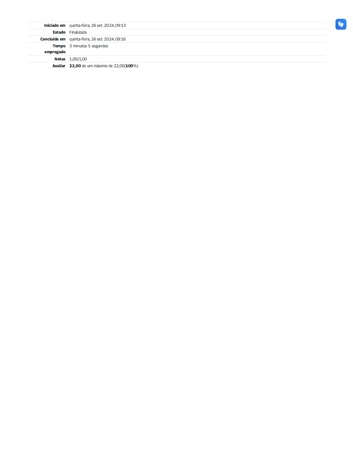 <p>Iniciado em quinta-feira, 26 set. 2024, 09:13</p><p>Estado Finalizada</p><p>Concluída em quinta-feira, 26 set. 2024, 09:16</p><p>Tempo</p><p>empregado</p><p>3 minutos 5 segundos</p><p>Notas 1,00/1,00</p><p>Avaliar 22,00 de um máximo de 22,00(100%)</p><p>Questão 1</p><p>Correto</p><p>Atingiu 1,00 de</p><p>1,00</p><p>Assinale com V para verdadeiro ou F para falso as a�rmações abaixo:</p><p>Ética é algo que só interessa a gente conservadora, que quer preservar a todo custo a moral e os "bons costumes" vigentes.</p><p></p><p>O relativismo ético, além de verdadeiro e bastante intuitivo, não tem nenhuma consequência problemática.</p><p></p><p>A Ética, como área da Filoso�a, surgiu como resposta ao relativismo das normas e valores de culturas e grupos sociais</p><p>especí�cos.</p><p></p><p>Para Aristóteles, a conduta humana visa o bem, que pode ser entendido de diferentes maneiras hierarquizáveis, sendo o mais</p><p>importante a felicidade, tida como a realização das potencialidades do ser humano enquanto animal racional e social.</p><p></p><p>Para Kant, uma ação é eticamente boa quando é feita com uma boa intenção, ou seja, quando a vontade que a move é a de</p><p>fazer o que deve ser feito e não de satisfazer algum desejo egoísta.</p><p></p><p>Para o utilitarismo de Stuart Mill, o bem de uma conduta é medido por suas consequências. O bem da conduta será maior</p><p>quanto mais prazer e menos dor proporcionar ao maior número de pessoas.</p><p></p><p>Uma coisa é a moral vigente entre os servidores públicos, enquanto conduta habitual desse grupo de indivíduos, e outra é a</p><p>ética na administração pública, enquanto conduta racionalmente justi�cável, que permite avaliar o comportamento de fato</p><p>dos servidores do Estado. </p><p>O uso de princípios de racionalidade como coerência e universalização podem ser úteis para o servidor avaliar se sua conduta</p><p>é ética.</p><p></p><p>O fato de agirmos movidos por causas sociais e psicológicas signi�ca que não podemos julgar nossas ações conforme</p><p>padrões racionais acerca do que deve ser feito.</p><p></p><p>Num con�ito de valores, quando mais de uma obrigação ética está envolvida numa escolha, os princípios de coerência e</p><p>universalização são plenamente capazes de determinar se uma conduta é eticamente aceitável.</p><p></p><p>A conduta do servidor público pode ser julgada não só do ponto de vista ético, mas também da justiça e do direito.</p><p></p><p>Falso</p><p>Falso</p><p>Verdadeiro</p><p>Verdadeiro</p><p>Verdadeiro</p><p>Verdadeiro</p><p>Verdadeiro</p><p>Verdadeiro</p><p>Falso</p><p>Falso</p><p>Verdadeiro</p><p>Ética é algo que só interessa a gente conservadora, que quer preservar a todo custo a moral e os "bons costumes" vigentes. - Falso</p><p>O relativismo ético, além de verdadeiro e bastante intuitivo, não tem nenhuma consequência problemática.- Falso</p><p>A Ética, como área da Filoso�a, surgiu como resposta ao relativismo das normas e valores de culturas e grupos sociais especí�cos. - Verdadeiro</p><p>Para Aristóteles, a conduta humana visa o bem, que pode ser entendido de diferentes maneiras hierarquizáveis, sendo o mais importante a</p><p>felicidade, tida como a realização das potencialidades do ser humano enquanto animal racional e social. - Verdadeiro</p><p>Para Kant, uma ação é eticamente boa quando é feita com uma boa intenção, ou seja, quando a vontade que a move é a de fazer o que deve ser</p><p>feito e não de satisfazer algum desejo egoísta. - Verdadeiro</p><p>Para o utilitarismo de Stuart Mill, o bem de uma conduta é medido por suas consequências. O bem da conduta será maior quanto mais prazer e</p><p>menos dor proporcionar ao maior número de pessoas. - Verdadeiro</p><p>Uma coisa é a moral vigente entre os servidores públicos, enquanto conduta habitual desse grupo de indivíduos, e outra é a ética na</p><p>administração pública, enquanto conduta racionalmente justi�cável, que permite avaliar o comportamento de fato dos servidores do Estado. -</p><p>Verdadeiro</p><p>O uso de princípios de racionalidade como coerência e universalização podem ser úteis para o servidor avaliar se sua conduta é ética. -</p><p>Verdadeiro</p><p>O fato de agirmos movidos por causas sociais e psicológicas signi�ca que não podemos julgar nossas ações conforme padrões racionais acerca do</p><p>que deve ser feito. - Falso</p><p>Num con�ito de valores, quando mais de uma obrigação ética está envolvida numa escolha, os princípios de coerência e universalização são</p><p>plenamente capazes de determinar se uma conduta é eticamente aceitável. - Falso</p><p>A conduta do servidor público pode ser julgada não só do ponto de vista ético, mas também da justiça e do direito. - Verdadeiro</p><p>A resposta correta é: Ética é algo que só interessa a gente conservadora, que quer preservar a todo custo a moral e os "bons costumes" vigentes.</p><p>→ Falso, O relativismo ético, além de verdadeiro e bastante intuitivo, não tem nenhuma consequência problemática. → Falso, A Ética, como área</p><p>da Filoso�a, surgiu como resposta ao relativismo das normas e valores de culturas e grupos sociais especí�cos. → Verdadeiro, Para Aristóteles, a</p><p>conduta humana visa o bem, que pode ser entendido de diferentes maneiras hierarquizáveis, sendo o mais importante a felicidade, tida como a</p><p>realização das potencialidades do ser humano enquanto animal racional e social. → Verdadeiro, Para Kant, uma ação é eticamente boa quando é</p><p>feita com uma boa intenção, ou seja, quando a vontade que a move é a de fazer o que deve ser feito e não de satisfazer algum desejo egoísta. →</p><p>Verdadeiro, Para o utilitarismo de Stuart Mill, o bem de uma conduta é medido por suas consequências. O bem da conduta será maior quanto mais</p><p>prazer e menos dor proporcionar ao maior nú