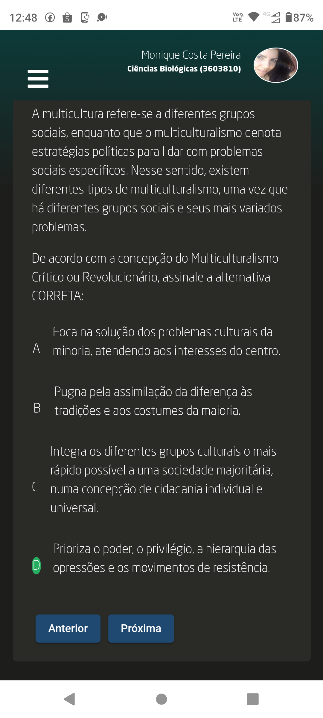 <p>12:48 4G f S LTE 87% Monique Costa Pereira Ciências Biológicas (3603810) A multicultura refere-se a diferentes grupos sociais, enquanto que multiculturalismo denota estratégias políticas para lidar com problemas sociais específicos. Nesse sentido, existem diferentes tipos de multiculturalismo, uma vez que há diferentes grupos sociais e seus mais variados problemas. De acordo com a concepção do Multiculturalismo Crítico ou Revolucionário, assinale a alternativa CORRETA: Foca na solução dos problemas culturais da A minoria, atendendo aos interesses do centro. Pugna pela assimilação da diferença às tradições e aos costumes da maioria. Integra os diferentes grupos culturais O mais rápido possível a uma sociedade majoritária, C numa concepção de cidadania individual e universal. Prioriza poder, O privilégio, a hierarquia das D opressões e os movimentos de resistência. Anterior Próxima</p>