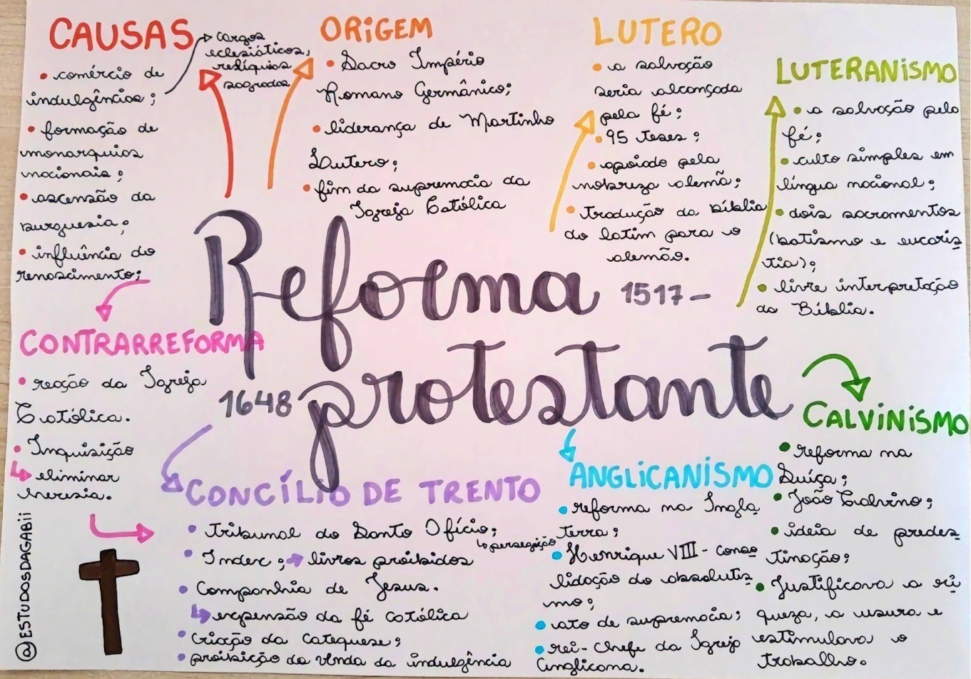 <p>Reforma Protestante</p><p>O processo de reformas religiosas teve início no século XVI. Podemos destacar como causas dessas reformas: abusos cometidos pela Igreja Católica e uma mudança na visão de mundo, fruto do pensamento renascentista.</p><p>A Igreja Católica vinha, desde o final da Idade Média, perdendo sua identidade. Gastos com luxo e preocupações materiais estavam tirando o objetivo católico dos trilhos. Muitos elementos do clero estavam desrespeitando as regras religiosas, principalmente o que diz respeito ao celibato. Padres que mal sabiam rezar uma missa e comandar os rituais, deixavam a população insatisfeita.</p><p>A burguesia comercial, em plena expansão no século XVI, estava cada vez mais inconformada, pois os clérigos católicos estavam condenando seu trabalho. O lucro e os juros (usura), típicos de um capitalismo emergente, eram vistos como práticas condenáveis pelos religiosos. Por outro lado, o papa arrecadava dinheiro para a construção da basílica de São Pedro em Roma, com a venda das indulgências (venda do perdão).</p><p>No campo político, os reis estavam descontentes com o papa, pois este interferia muito nos comandos que eram próprios da realeza.</p><p>O novo pensamento renascentista também fazia oposição aos preceitos da Igreja. O homem renascentista, começava a ler mais e formar uma opinião cada vez mais crítica. Trabalhadores urbanos, com mais acesso a livros, começaram a discutir e a pensar sobre as coisas do mundo. Um pensamento baseado na ciência e na busca da verdade através de experiências e da razão.</p><p>Tentativas de Reforma no Século XIV e XV</p><p>João Wycliffe (1328-1384)</p><p>· Professor da Universidade de Oxford;</p><p>· Criticou a imoralidade e o mau uso da propriedade entre o clero;</p><p>· Afirmava ser Cristo o chefe da Igreja e não o Papa;</p><p>· Fez a tradução do Novo testamento para o inglês;</p><p>· Defendia a separação entre igreja e Estado.</p><p>O Arcebispo de Londres proibiu Wycliffe, por causa dessas ideias, de pregar. Wycliffe pediu a ajuda do rei para poder continuar pregando, mas este não interferiu. E Wycliffe obedeceu e retirou-se. Viveu na pequena cidade de Lutterworth. Durante os anos que seguiram, começou a traduzir a Bíblia para o inglês. Em 1383, o Novo Testamento em Inglês começou a circular. Aos poucos, com a ajuda de outros, toda a Bíblia foi traduzida do latim para o inglês.</p><p>João Huss (1369-1415)</p><p>Nascido em 1369 na Boêmia, onde hoje se localiza a República Tcheca. Na Universidade de Praga, tornou-se professor de teologia em 1398, sendo ordenado padre em 1400.</p><p>Estudioso das doutrinas de João Wycliff, de quem adotava algumas ideais, as posições contra a venda das indulgências e demais críticas contra a Igreja levaram-no a ser acusado de heresia. Em 1412, Huss foi excomungado.</p><p>Foi condenado por heresia pelo Concílio e no dia 06 de julho de 1415 foi queimado na fogueira.</p><p>Apesar de sua morte, os conflitos na Boêmia se intensificaram, originando o que ficou conhecido como Revolução Hussita, entre os anos de 1419-1437.</p><p>A Reforma Luterana (Alemanha)</p><p>O monge alemão Martinho Lutero foi um dos primeiros a contestar fortemente os dogmas da Igreja Católica. Afixou na porta da Igreja de Wittenberg as 95 teses que criticavam vários pontos da doutrina católica.</p><p>As 95 teses de Martinho Lutero condenavam a venda de indulgências e propunha a fundação do luteranismo (religião luterana). De acordo com Lutero, a salvação do homem ocorria pelos atos praticados em vida e pela fé. Embora tenha sido contrário ao comércio, teve grande apoio dos reis e príncipes da época. Em suas teses, condenou o culto às imagens e revogou o celibato (proibição do casamento para sacerdotes).</p><p>Martinho Lutero foi convocado as desmentir as suas 95 teses na Dieta de Worms, convocada pelo imperador Carlos V. Em 16 de abril de 1521, Lutero não só defendeu suas teses como mostrou a necessidade da reforma da Igreja Católica.</p><p>A Reforma Calvinista (Suíça)</p><p>Na França, João Calvino começou a Reforma Calvinista no ano de 1534. De acordo com Calvino a salvação da alma ocorria pelo trabalho justo e honesto. Essa ideia calvinista, atraiu muitos burgueses e banqueiros para o calvinismo. Muitos trabalhadores também viram nesta nova religião uma forma de ficar em paz com sua religiosidade. Calvino também defendeu a ideia da predestinação (a pessoa nasce com a salvação ou a perdição definida).</p><p>A Reforma Anglicana (Inglaterra)</p><p>Na Inglaterra, o rei Henrique VIII rompeu com o papado, após este se recusar a cancelar o casamento do rei. Henrique VIII funda o anglicanismo (Igreja Anglicana) e aumenta seu poder e suas posses, já que retirou da Igreja Católica uma grande quantidade de terras.</p><p>A Contra Reforma Católica</p><p>Preocupados com os avanços do protestantismo e com a perda de fiéis, o Papa juntamente com cardeais e bispos reúnem-se na cidade italiana de Trento (Concílio de Trento) com o objetivo de traçar um plano de reação.</p><p>No Concílio de Trento ficou definido:</p><p>· Catequização dos habitantes de terras descobertas, através da ação dos jesuítas;</p><p>· Retomada do Tribunal do Santo Ofício – Inquisição: punir e condenar os acusados de heresias;</p><p>· Criação do Index Librorum Prohibitorum (Índice de Livros Proibidos): evitar a propagação de ideias contrárias à Igreja Católica.</p><p>Intolerância</p><p>Em muitos países europeus as minorias religiosas foram perseguidas e muitas guerras religiosas ocorreram, frutos do radicalismo. A Guerra dos Trinta Anos (1618-1648), por exemplo, colocou católicos e protestantes em guerra por motivos puramente religiosos. Na França, o rei mandou assassinar milhares de calvinistas na chamada Noite de São Bartolomeu.</p><p>Reforma protestante e contrareforna</p><p>https://www.youtube.com/watch?v=bMFrqQnWldI</p><p>h
