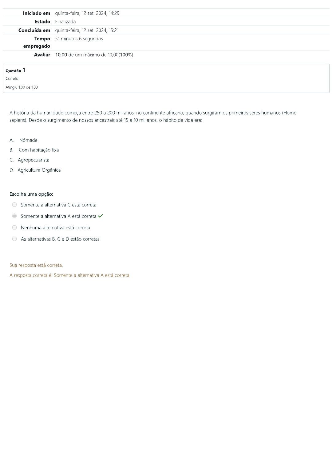 <p>Iniciado em quinta-feira, 12 set. 2024, 14:29 Estado Finalizada Concluída em quinta-feira, 12 set. 2024, 15:21 Tempo 51 minutos 6 segundos empregado Avaliar 10,00 de um máximo de 10,00(100%) Questão 1 Correto Atingiu 1,00 de 1,00 A história da humanidade começa entre 250 a 200 mil anos, no continente africano, quando surgiram os primeiros seres humanos (Homo sapiens). Desde surgimento de nossos ancestrais até 15 a 10 mil anos, hábito de vida era: A. Nômade B. Com habitação fixa C. Agropecuarista D. Agricultura Orgânica Escolha uma opção: Somente a alternativa C está correta Somente a alternativa A está correta Nenhuma alternativa está correta As alternativas B, C e D estão corretas Sua resposta está correta. A resposta correta é: Somente a alternativa A está correta</p><p>Questão 2 Correto Atingiu 1,00 de 1.00 Nossos ancestrais se alimentavam por meio da caça/pesca e coleta de vegetais (raízes, frutos, sementes e folhas). Para caçar, eles eram obrigados a seguir os bandos de alguns grandes mamíferos africanos, como os búfalos e antílopes. Desta forma, eles formavam pequenos grupos nômades. Composto por cerca de 30 a 50 pessoas, com laços familiares. Em relação aos conteúdos estudados, Hábito criador/agricultor é: A. A habilidade para criar animais e plantar os alimentos B. Rotina de pecuária C. Apicultura D. Rotina de cultivo Escolha uma opção: Nenhuma das alternativas é correta Todas alternativas são corretas Somente a alternativa B está correta Somente a alternativa A está correta Sua resposta está correta. A resposta correta é: Somente a alternativa A está correta Questão 3 Correto Atingiu 1,00 de 1,00 Um dos problemas mais comuns é a contaminação do solo, de lençóis freáticos e de rios e lagos. Quando agrotóxico é utilizado, ele chega ao solo e a chuva, ou O próprio sistema de irrigação da plantação, facilita a chegada dos pesticidas aos corpos de água, poluindo-os e intoxicando toda vida lá presente. De que maneira a saúde humana pode ser afetada? A. A saúde humana é afetada pelos agrotóxicos durante sua fabricação B. A saúde humana é afetada pelos agrotóxicos no momento da aplicação C. A saúde humana é afetada pelos agrotóxicos ao consumir um produto contaminado. Escolha uma opção: Somente as alternativas e C estão corretas Todas alternativas são corretas Somente a alternativa B está correta Nenhuma alternativa está correta Sua resposta está correta. A resposta correta é: Todas alternativas são corretas</p><p>Questão 4 Correto Atingiu de Analise cada frase abaixo, sobre Meio Ambiente e Sociedade Relações Afro-Descendentes, e escolha a alternativa correspondente, se verdadeiras ou falsas. - A história começa entre 250 a 200 mil anos, no continente africano, quando surgiram os primeiros seres humanos (Homo sapiens). Nossos ancestrais se alimentavam por meio da caça/pesca e coleta de vegetais (raízes, frutos, sementes e folhas). A vida nesta época era muito difícil. A chance de sobrevivência era baixa, assim como a expectativa de vida. Desta forma, a população humana era composta por poucas pessoas, algumas centenas ou milhares distribuídos no planeta. Esta condição perdurou até cerca de 10.000 anos A.C. (Antes de Cristo). III Nesta mesma época, acredita-se que os restos dos alimentos deixados pelos humanos atraíram lobos e porcos. Assim, os homens começaram a domesticar estes animais (possível origem dos cachorros, utilizados para a defesa e auxiliar na caça). Escolha uma opção: V F V; V; V Sua resposta está correta. A resposta correta é: V; V Questão 5 Correto Atingiu 1,00 de 1,00 As propriedades físicas do planeta, bem como sua história permitiram que a vida persistisse até hoje. Acredita-se que a Terra poderá suportar vida durante pelo menos outros 500 milhões de anos. Os seres vivos dependem de componentes básicos à sua É indiscutível a importância da preservação de todo meio ambiente. Para que ecossistema se mantenha em harmonia é preciso da conscientização, e uso de medidas preventivas quanto a diminuição da poluição e do restabelecimento da matéria-prima. Com base na contextualização acima e os conceitos tratados no guia de estudos podemos afirmar que os seres vivos necessitam de quatro componentes básicos para sua sobrevivência. Selecione a alternativa que está totalmente correta: A. Fogo e além de resíduos e aterros B. Chuva, sol, ar, mares C. Água, energia, nutrientes e recursos naturais D. Plantas, rios, oxigênio e vento Escolha uma opção: As alternativas A e B estão corretas Somente a alternativa B está correta Nenhuma alternativa está correta Somente a alternativa C está correta Sua resposta está correta. A resposta correta é: Somente a alternativa C está correta</p><p>Questão 6 Correto Atingiu 1,00 de 1,00 Nem todo fertilizante gera problemas, os adubos orgânicos, por exemplo, são produzidos naturalmente e não necessitam de nenhum complemento industrial. Sua composição é naturalmente equilibrada e adequada para uso no solo e não produz nenhum impacto negativo no ambiente. Este é único tipo de fertilizante utilizado na Agricultura Orgânica Para utilização, existem procedimentos para registro de produtos biológicos, são eles: A. Os produtos biológicos para agricultura têm registro diferenciado com base em normativas específicas. B. Os produtos biológicos para agricultura podem ser classificados em três categorias: agentes microbiológicos de controle, agentes biológicos de controle. C. Serão exigidos todos os requisitos e estudos constantes na legislação que regula registro de agrotóxicos em geral e do produto biológico que não se enquadrar em uma dessas categorias. Escolha uma opção: Nenhuma das afirmativas está correta Somente a alternativa A está correta Somente a alternativa B está correta Todas alternativas são corretas Sua resposta está correta. A resposta correta é: Todas alternativa