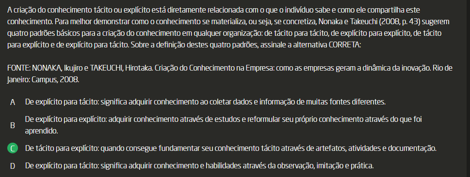 <p>A criação do conhecimento tácito ou explícito está diretamente relacionada com que indivíduo sabe e como ele compartilha este conhecimento. Para melhor demonstrar como conhecimento se materializa, ou seja, se concretiza, Nonaka e Takeuchi (2008, p. 43) sugerem quatro padrões básicos para a criação do conhecimento em qualquer organização: de tácito para tácito, de explícito para explícito, de tácito para explícito e de explícito para tácito. Sobre a definição destes quatro padrões, assinale a alternativa CORRETA: FONTE: Ikujiro e TAKEUCHI, Criação do Conhecimento na Empresa: como as empresas geram a dinâmica da inovação. Rio de Janeiro: Campus, 2008. A De explícito para tácito: significa adquirir conhecimento ao coletar dados e informação de muitas fontes diferentes. De explícito para explícito: adquirir conhecimento através de estudos e reformular seu próprio conhecimento através do que foi B aprendido. De tácito para explícito: quando consegue fundamentar seu conhecimento tácito através de artefatos, atividades e documentação. D De explícito para tácito: significa adquirir conhecimento e habilidades através da observação, imitação e prática.</p>