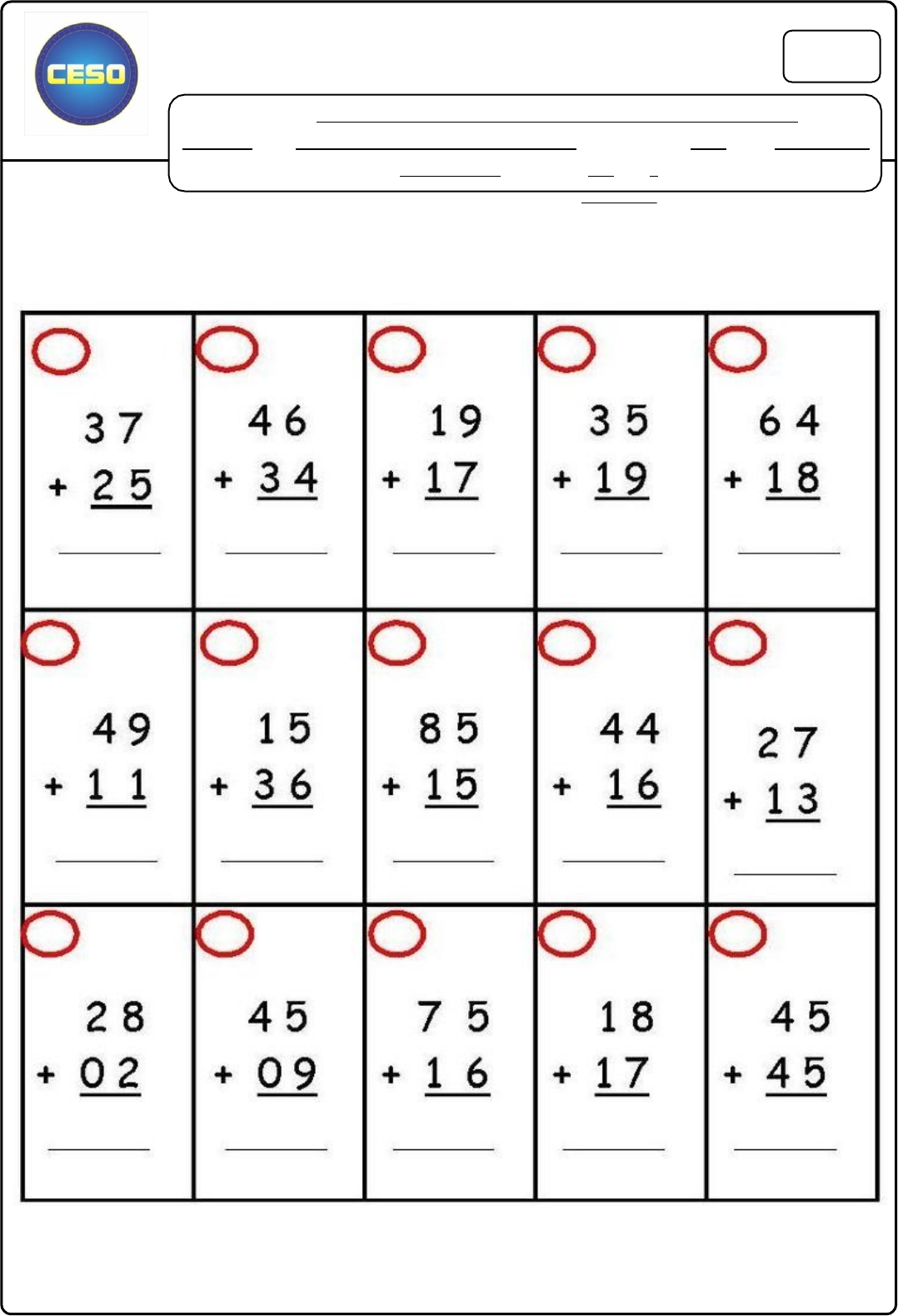 <p>CESO - CENTRO EDUCACIONAL SILVA OLIVEIRA</p><p>III Avaliação Bimestral de Matemática</p><p>NOTA</p><p>Aluno (a): Curso: Ensino Fundamental Ano: Turma: Bimestre: Professor(a): Data: Valor da Avaliação: 10,0 pontos</p><p>1- Resolva as adições abaixo com bastante atenção. (1,5 ponto)</p><p>Avaliação Bimestral de Matemática – 1º Ano – 3º Bimestre – Pág. 2</p><p>Aluno (a):</p><p>2- Observe a quantidade e marque o certo. (0,5 ponto)</p><p>3- Vamos contar? (1,0 ponto)</p><p>Avaliação Bimestral de Matemática – 1º Ano – 3º Bimestre – Pág. 3</p><p>Aluno (a):</p><p>4- Coloque os números que vem antes e depois. (1,0 ponto)</p><p>a) 80</p><p>5-</p><p>Que número vem imediatamente depois do 69? (0,5 ponto)</p><p>Avaliação Bimestral de Matemática – 1º Ano – 3º Bimestre – Pág. 4</p><p>Aluno (a):</p><p>b) 70</p><p>c) 60</p><p>6- Que número vem imediatamente antes do 100? (0,5 ponto)</p><p>a) 90</p><p>b) 98</p><p>c) 90</p><p>7- Veja o preço de cada objeto e depois responda. (1,0 ponto)</p><p>a) Qual é o objeto mais caro?</p><p>b) Qual é o objeto mais barato?</p><p>c) Qual é o preço da mochila?</p><p>d) Qual é o preço do caderno?</p><p>Avaliação Bimestral de Matemática – 1º Ano – 3º Bimestre – Pág. 5</p><p>Aluno (a):</p><p>8- Complete a sequência abaixo corretamente. (1,0 ponto)</p><p>9- Resolva as subtrações abaixo. (1,0 ponto)</p><p>10- Resolva as adições abaixo. (1,0 ponto)</p><p>Avaliação Bimestral de Matemática – 1º Ano – 3º Bimestre – Pág. 6</p><p>Aluno (a):</p><p>Avaliação Bimestral de Matemática – 1º Ano – 3º Bimestre – Pág. 7</p><p>Aluno (a):</p><p>11- Resolva os probleminhas abaixo com bastante atenção. (1,0 ponto)</p><p>image6.jpeg</p><p>image7.jpeg</p><p>image8.jpeg</p><p>image9.jpeg</p><p>image10.jpeg</p><p>image11.jpeg</p><p>image1.jpeg</p><p>image2.jpeg</p><p>image3.jpeg</p><p>image4.jpeg</p><p>image5.jpeg</p>
