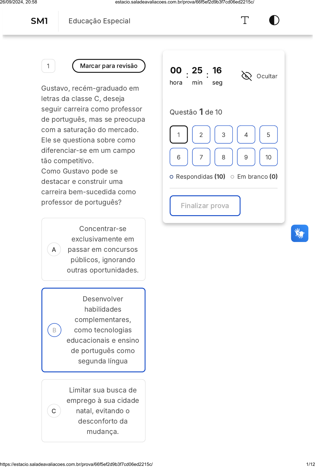 <p>A</p><p>B</p><p>C</p><p>1 Marcar para revisão</p><p>Gustavo, recém-graduado em</p><p>letras da classe C, deseja</p><p>seguir carreira como professor</p><p>de português, mas se preocupa</p><p>com a saturação do mercado.</p><p>Ele se questiona sobre como</p><p>diferenciar-se em um campo</p><p>tão competitivo.</p><p>Como Gustavo pode se</p><p>destacar e construir uma</p><p>carreira bem-sucedida como</p><p>professor de português?</p><p>Concentrar-se</p><p>exclusivamente em</p><p>passar em concursos</p><p>públicos, ignorando</p><p>outras oportunidades.</p><p>Desenvolver</p><p>habilidades</p><p>complementares,</p><p>como tecnologias</p><p>educacionais e ensino</p><p>de português como</p><p>segunda língua</p><p>Limitar sua busca de</p><p>emprego à sua cidade</p><p>natal, evitando o</p><p>desconforto da</p><p>mudança.</p><p>00</p><p>hora</p><p>: 25</p><p>min</p><p>: 16</p><p>seg</p><p>Ocultar</p><p>Questão 1 de 10</p><p>Respondidas �10� Em branco �0�</p><p>Finalizar prova</p><p>1 2 3 4 5</p><p>6 7 8 9 10</p><p>SM1 Educação Especial</p><p>26/09/2024, 20:58 estacio.saladeavaliacoes.com.br/prova/66f5ef2d9b3f7cd06ed2215c/</p><p>https://estacio.saladeavaliacoes.com.br/prova/66f5ef2d9b3f7cd06ed2215c/ 1/12</p><p>D</p><p>E</p><p>Seguir estritamente os</p><p>métodos de ensino</p><p>tradicionais, evitando</p><p>inovações</p><p>pedagógicas.</p><p>Adotar uma postura</p><p>passiva na busca por</p><p>emprego, esperando</p><p>que as escolas o</p><p>contatem.</p><p>2 Marcar para revisão</p><p>Maria, uma estudante</p><p>universitária de classe média,</p><p>percebe que seu colega João,</p><p>que trabalha em meio período</p><p>para ajudar nas despesas da</p><p>família, está sempre cansado e</p><p>com dificuldades para</p><p>acompanhar as aulas. Ela quer</p><p>ajudá-lo a se sentir incluído e a</p><p>lidar melhor com suas</p><p>responsabilidades.</p><p>Como Maria pode demonstrar</p><p>empatia por João e apoiá-lo a</p><p>enfrentar suas dificuldades de</p><p>maneira mais eficaz?</p><p>26/09/2024, 20:58 estacio.saladeavaliacoes.com.br/prova/66f5ef2d9b3f7cd06ed2215c/</p><p>https://estacio.saladeavaliacoes.com.br/prova/66f5ef2d9b3f7cd06ed2215c/ 2/12</p><p>A</p><p>B</p><p>C</p><p>D</p><p>E</p><p>Ignorar a situação,</p><p>considerando que é</p><p>algo pessoal que João</p><p>deve resolver sozinho.</p><p>Oferecer-se para</p><p>ajudar João a revisar</p><p>o conteúdo das aulas</p><p>que ele perdeu</p><p>devido ao cansaço.</p><p>Criticar João por sua</p><p>falta de energia,</p><p>sugerindo que ele</p><p>deveria descansar</p><p>mais.</p><p>Sugerir que João</p><p>desista do emprego</p><p>para se concentrar</p><p>nos estudos e no</p><p>descanso.</p><p>Organizar um grupo</p><p>de estudos e incluir</p><p>João, mas sem se</p><p>envolver diretamente</p><p>com ele.</p><p>3 Marcar para revisão</p><p>Juliana, aluna do último ano de</p><p>direito da classe D, sente uma</p><p>pressão intensa para passar no</p><p>exame da OAB. Ela teme que</p><p>seu histórico socioeconômico</p><p>26/09/2024, 20:58 estacio.saladeavaliacoes.com.br/prova/66f5ef2d9b3f7cd06ed2215c/</p><p>https://estacio.saladeavaliacoes.com.br/prova/66f5ef2d9b3f7cd06ed2215c/ 3/12</p><p>A</p><p>B</p><p>C</p><p>D</p><p>E</p><p>afete sua preparação e</p><p>resultados, considerando</p><p>recursos limitados para cursos</p><p>preparatórios.</p><p>Qual é a melhor estratégia de</p><p>Juliana para se preparar para o</p><p>exame da OAB, considerando</p><p>suas limitações?</p><p>Depender</p><p>exclusivamente de</p><p>materiais gratuitos,</p><p>evitando qualquer</p><p>custo com gastos</p><p>adicionais.</p><p>Formar grupos de</p><p>estudo com colegas</p><p>para compartilhar</p><p>materiais e</p><p>experiências.</p><p>Adiar a prova até que</p><p>possa arcar</p><p>financeiramente com</p><p>os melhores cursos</p><p>preparatórios</p><p>Focar exclusivamente</p><p>em áreas do direito</p><p>que considera suas</p><p>forças, ignorando as</p><p>demais.</p><p>Utilizar apenas livros</p><p>antigos disponíveis,</p><p>evitando atualizações</p><p>legislativas recentes.</p><p>26/09/2024, 20:58 estacio.saladeavaliacoes.com.br/prova/66f5ef2d9b3f7cd06ed2215c/</p><p>https://estacio.saladeavaliacoes.com.br/prova/66f5ef2d9b3f7cd06ed2215c/ 4/12</p><p>A</p><p>B</p><p>C</p><p>4 Marcar para revisão</p><p>Mariana, uma estudante de</p><p>psicologia, percebe que seu</p><p>colega de classe, Carlos, tem</p><p>dificuldades em se relacionar</p><p>com os outros e parece isolado</p><p>durante as atividades em</p><p>grupo. Ela quer ajudá-lo a se</p><p>sentir mais integrado e aceito</p><p>pelos colegas.</p><p>Como Mariana pode</p><p>demonstrar empatia por Carlos</p><p>e incentivá-lo a se envolver</p><p>mais com os outros colegas?</p><p>Ignorar o</p><p>comportamento de</p><p>Carlos, considerando</p><p>que ele deve resolver</p><p>seus problemas</p><p>pessoais sozinho.</p><p>Convidar Carlos para</p><p>participar de</p><p>atividades sociais fora</p><p>da sala de aula, como</p><p>um almoço em grupo.</p><p>Criticar Carlos por sua</p><p>falta de habilidades</p><p>sociais, sugerindo que</p><p>ele precisa se</p><p>esforçar mais para se</p><p>relacionar.</p><p>26/09/2024, 20:58 estacio.saladeavaliacoes.com.br/prova/66f5ef2d9b3f7cd06ed2215c/</p><p>https://estacio.saladeavaliacoes.com.br/prova/66f5ef2d9b3f7cd06ed2215c/ 5/12</p><p>D</p><p>E</p><p>Sugerir que Carlos</p><p>desista do curso de</p><p>psicologia, pois pode</p><p>não ser adequado</p><p>para ele.</p><p>Evitar interagir com</p><p>Carlos durante as</p><p>atividades em grupo</p><p>para não constrangê-</p><p>lo.</p><p>5 Marcar para revisão</p><p>A Comunicação Alternativa e</p><p>Ampliada utiliza sistemas e</p><p>recursos alternativos para</p><p>proporcionar a indivíduos sem</p><p>fala funcional meios de se</p><p>comunicar.</p><p>Avalie as afirmativas a seguir</p><p>com base no que diz Nunes</p><p>�2017) sobre a Comunicação</p><p>Alternativa e Ampliada.</p><p>I� Elabora-se através de sinais</p><p>o