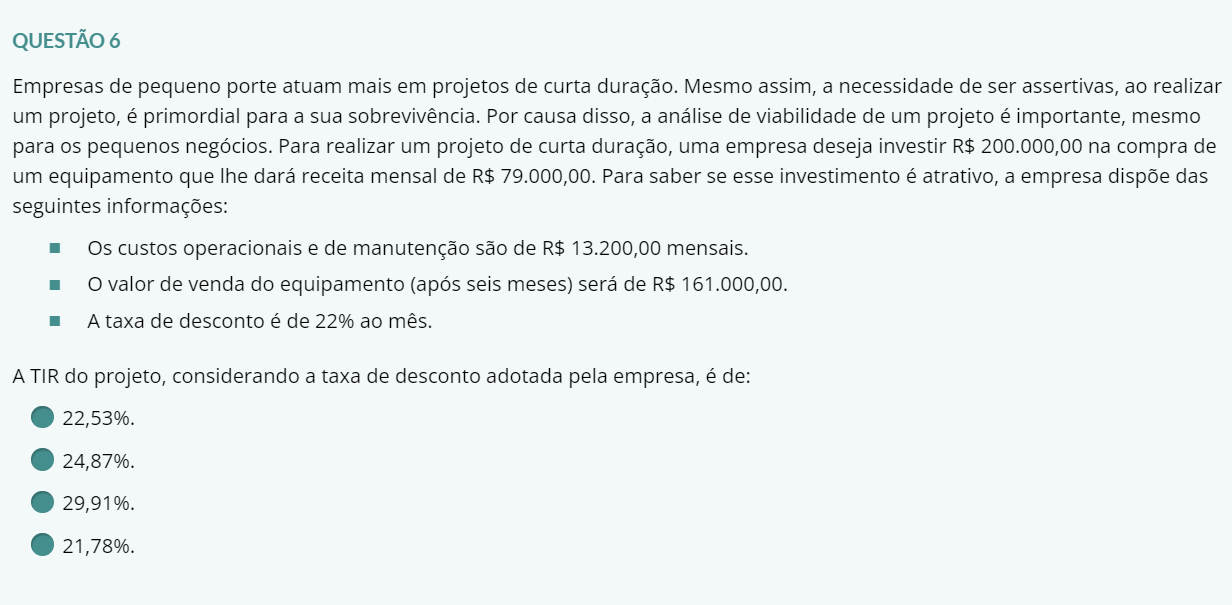 <p>QUESTÃO 6 Empresas de pequeno porte atuam mais em projetos de curta duração. Mesmo assim, a necessidade de ser assertivas, ao realizar um projeto, é primordial para a sua sobrevivência. Por causa disso, a análise de viabilidade de um projeto é importante, mesmo para os pequenos negócios. Para realizar um projeto de curta duração, uma empresa deseja investir R$ 200.000,00 na compra de um equipamento que lhe dará receita mensal de R$ 79.000,00. Para saber se esse investimento é atrativo, a empresa dispõe das seguintes informações: Os custos operacionais e de manutenção são de R$ 13.200,00 mensais. o valor de venda do equipamento (após seis meses) será de R$ A taxa de desconto é de 22% ao mês. A TIR do projeto, considerando a taxa de desconto adotada pela empresa, é de: 22,53%. 24,87%. 29,91%.</p>
