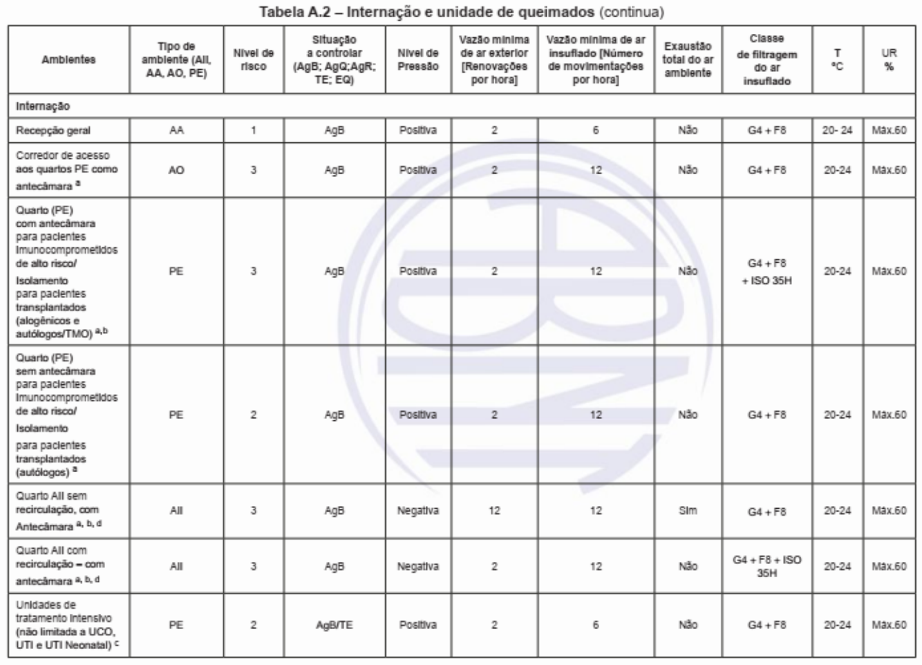 <p>Tabela A.2 - Internação e unidade de queimados (continua) Situação Vazão minima Vazão minima de ar Classe Tipo de Exaustão de a controlar Nivel de de ar exterior Ambientes insuflado [Número ambiente (All, de filtragem T UR total do an risco Pressão [Renovações de movimentações ambiente do ar °C % AA. PE) TE; EQ) por hora] por hora] insuflado Internação Recepção geral AA 1 AgB Positiva 2 6 Não 20- Corredor de acesso aos quartos PE como AO 3 AgB Positiva 2 12 Não 20-24 a Quarto (PE) com para pacientes Imunocomprometidos de alto PE 3 AgB Positiva 2 12 Não 20-24 Isolamento + ISO 35H para pacientes transplantados (alogênicos e Quarto (PE) sem para pacientes Imunocomprometidos de alto PE 2 AgB Positiva 2 12 Não G4 + F8 20-24 Isolamento para pacientes transplantados (autólogos) a Quarto All sem recirculação, com All 3 AgB Negativa 12 12 Sim 20-24 Max.60 a, b, d Quarto All com recirculação - com G4 + F8 + ISO All 3 AgB Negativa 2 12 Não 20-24 35H a, b, d Unidades de tratamento Intensivo PE 2 AgB/TE Positiva 2 6 Não 20-24 (não limitada a UCO, UTI e UTI Neonatal) C</p><p>Tabela A.2 (continuação) Situação Vazão minima Vazão minima de ar Classe Tipo de Exaustão Nivel de a controlar Nivel de de ar exterior Ambientes insuflado [Número ambiente de filtragem T UR total do ar risco (AgB: Pressão [Renovações de movimentações AA. PE) ambiente do ar °C % EQ) por hora] por hora] insuflado Unidades de tratamento All 3 AgB/TE Negativa 6 6 Sim G4+F8 20-24 All, com ab Enfermaria neonatal/ Lactente de cuidados PE 2 AgB/TE Positiva 2 6 Não G4+F8 22-26 AO 2 AgB Positiva 2 6 Não M5 22-26 Max.60 individual Enfermaria/ área coletiva de tratamento AO 2 AgB Positiva 2 6 Não G4+F8 22-26 neonatologia) Sala de fisioterapia AO 2 AgB Negativa 2 6 Não G4+F8 22-27</p>