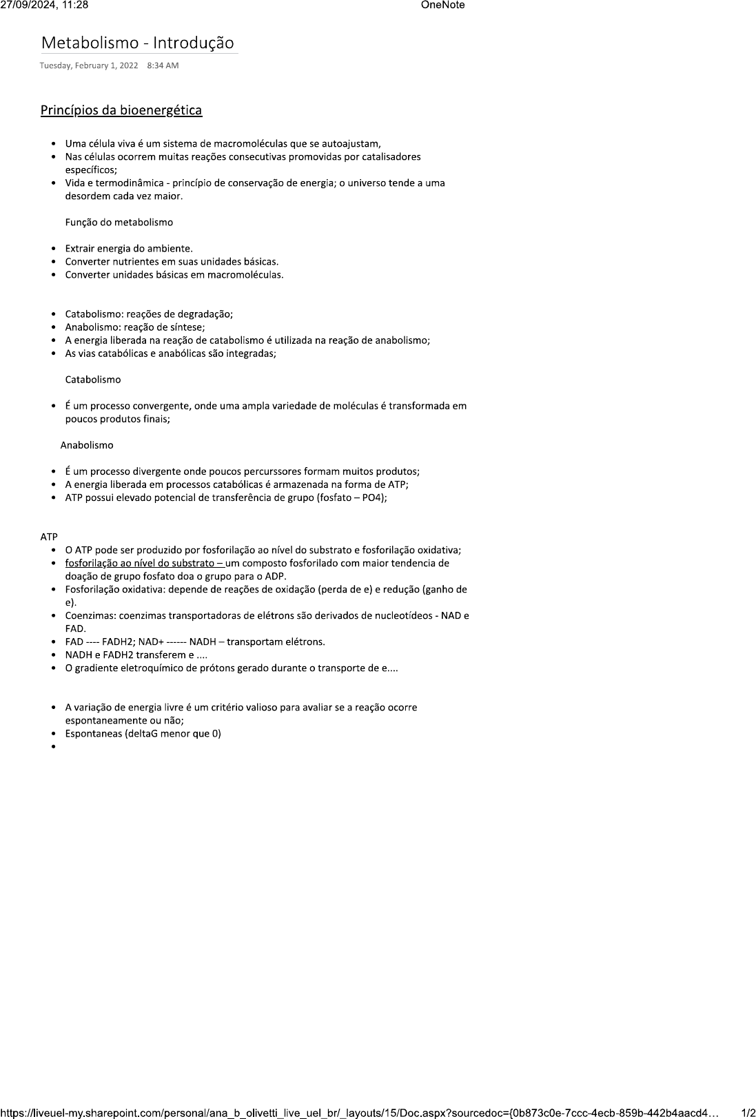 <p>27/09/2024, 11:28 OneNote Metabolismo - Introdução Tuesday, February 1, 2022 8:34 AM Princípios da bioenergética Uma célula viva é um sistema de macromoléculas que se autoajustam, Nas células ocorrem muitas reações consecutivas promovidas por catalisadores específicos; Vida e termodinâmica princípio de conservação de energia; o universo tende a uma desordem cada vez maior. Função do metabolismo Extrair energia do ambiente. Converter nutrientes em suas unidades básicas. Converter unidades básicas em macromoléculas. Catabolismo: reações de degradação; Anabolismo: reação de síntese; A energia liberada na reação de catabolismo é utilizada na reação de anabolismo; As vias catabólicas e anabólicas são integradas; Catabolismo É um processo convergente, onde uma ampla variedade de moléculas é transformada em poucos produtos finais; Anabolismo É um processo divergente onde poucos percurssores formam muitos produtos; A energia liberada em processos catabólicas é armazenada na forma de ATP; ATP possui elevado potencial de transferência de grupo (fosfato - PO4); ATP o ATP pode ser produzido por fosforilação ao nível do substrato e fosforilação oxidativa; fosforilação ao nível do substrato - um composto fosforilado com maior tendencia de doação de grupo fosfato doa o grupo para o ADP. Fosforilação oxidativa: depende de reações de oxidação (perda de e) e redução (ganho de e). Coenzimas: coenzimas transportadoras de elétrons são derivados de nucleotídeos NAD e FAD. FAD ---- FADH2; NAD+ NADH - transportam elétrons. NADH e FADH2 transferem e.... o gradiente eletroquímico de prótons gerado durante o transporte de e.... A variação de energia livre é um critério valioso para avaliar se a reação ocorre espontaneamente ou não; Espontaneas (deltaG menor que 0) 1/2</p><p>27/09/2024, 11:28 OneNote 2/2</p>